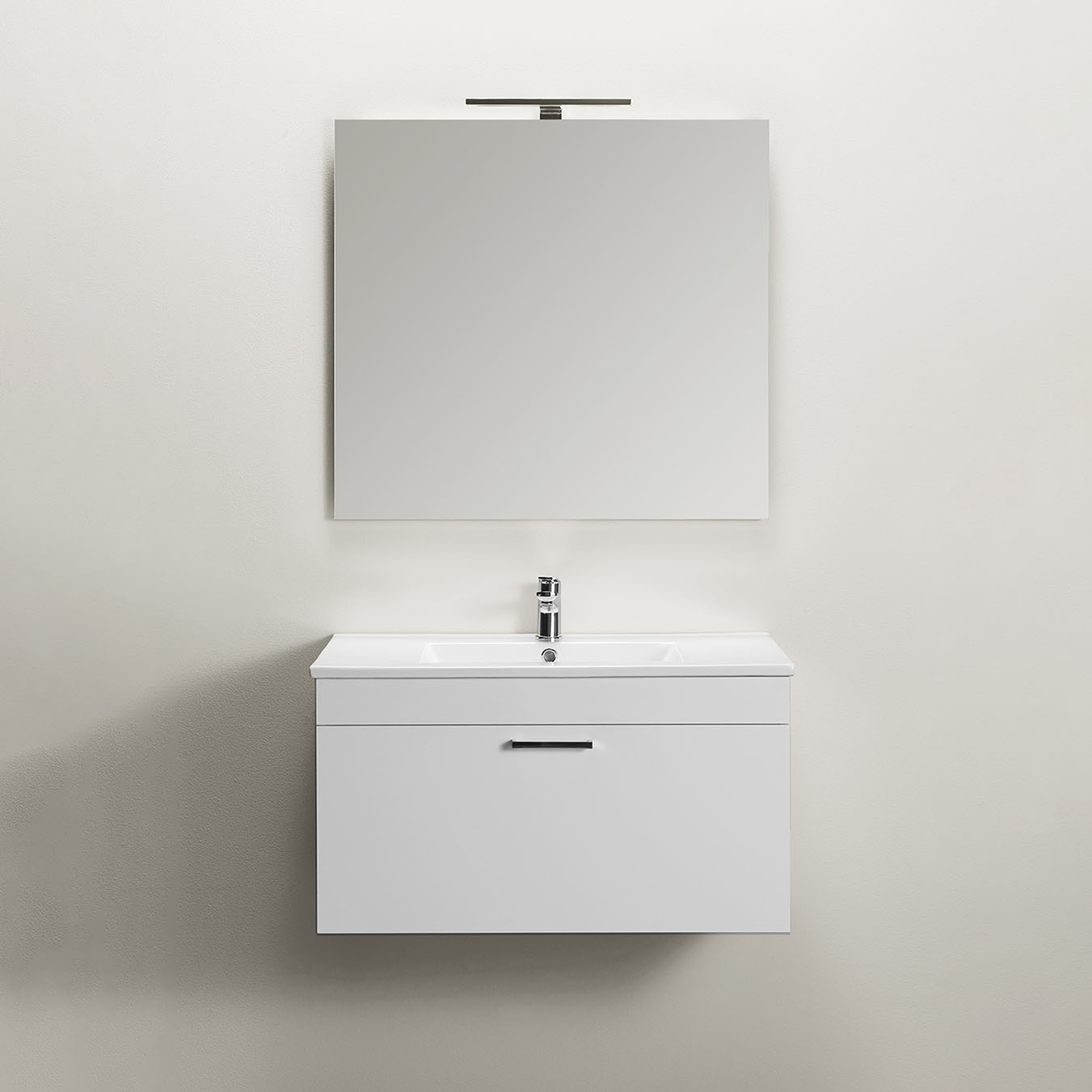 Tvättställsskåp med mjukstängande låda som ger generös förvaring. Inklusive nedsänkt handfat och spegel. Tvättställsskåpet är enkelt att installera för en person med skena på vägg.