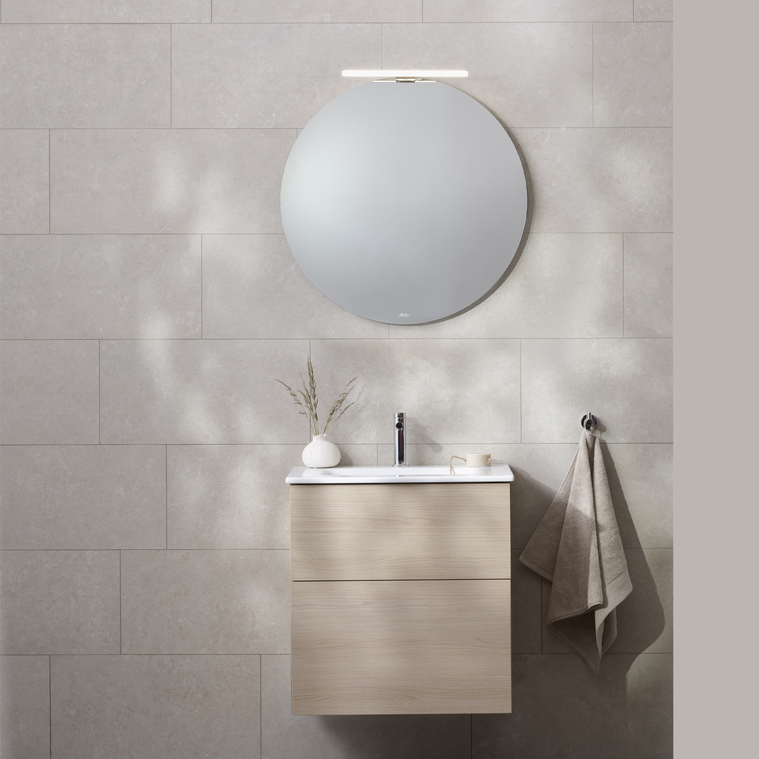 Möbelpaket från Miller Badrum med kommod, tvättställ och rund spegel med toppbelysning.