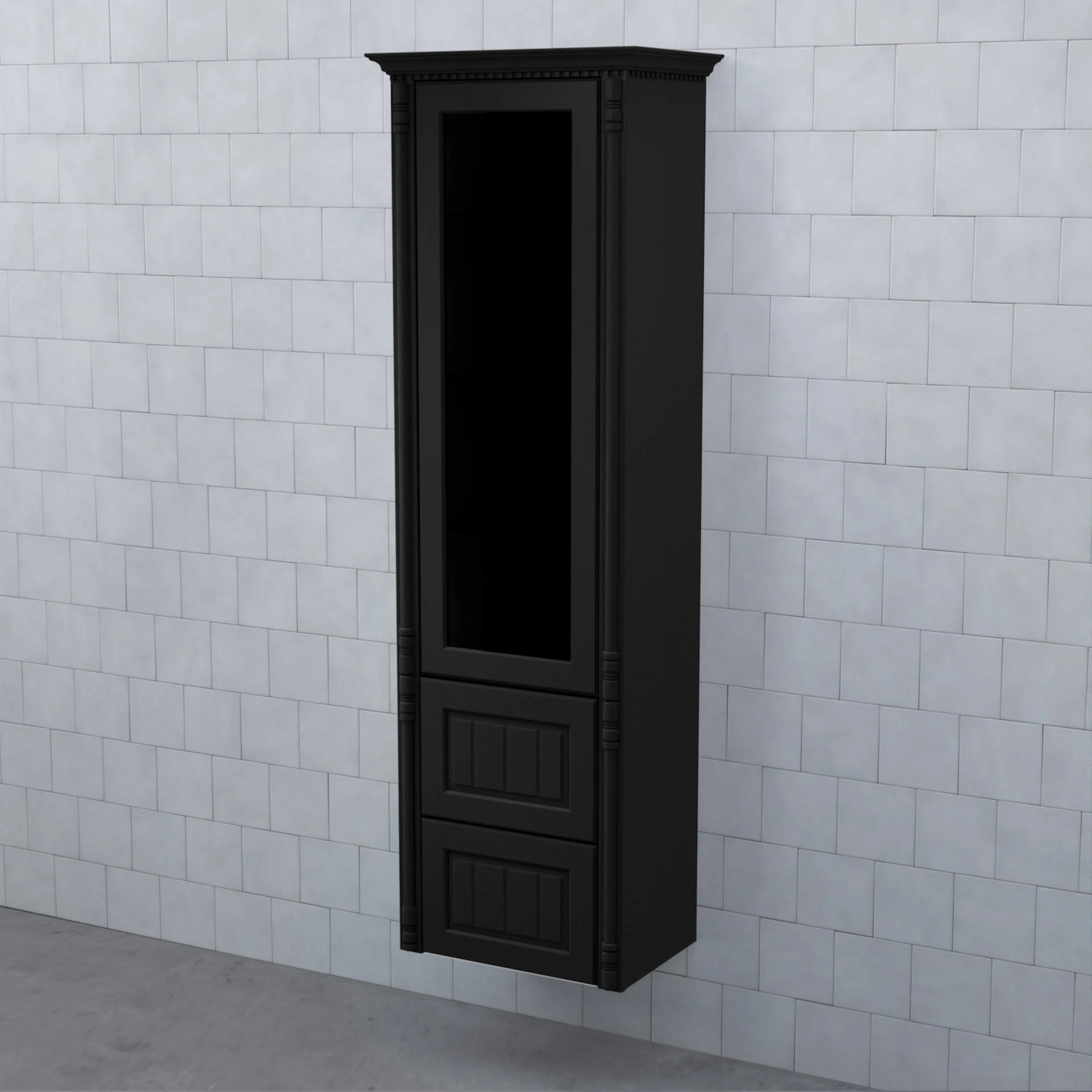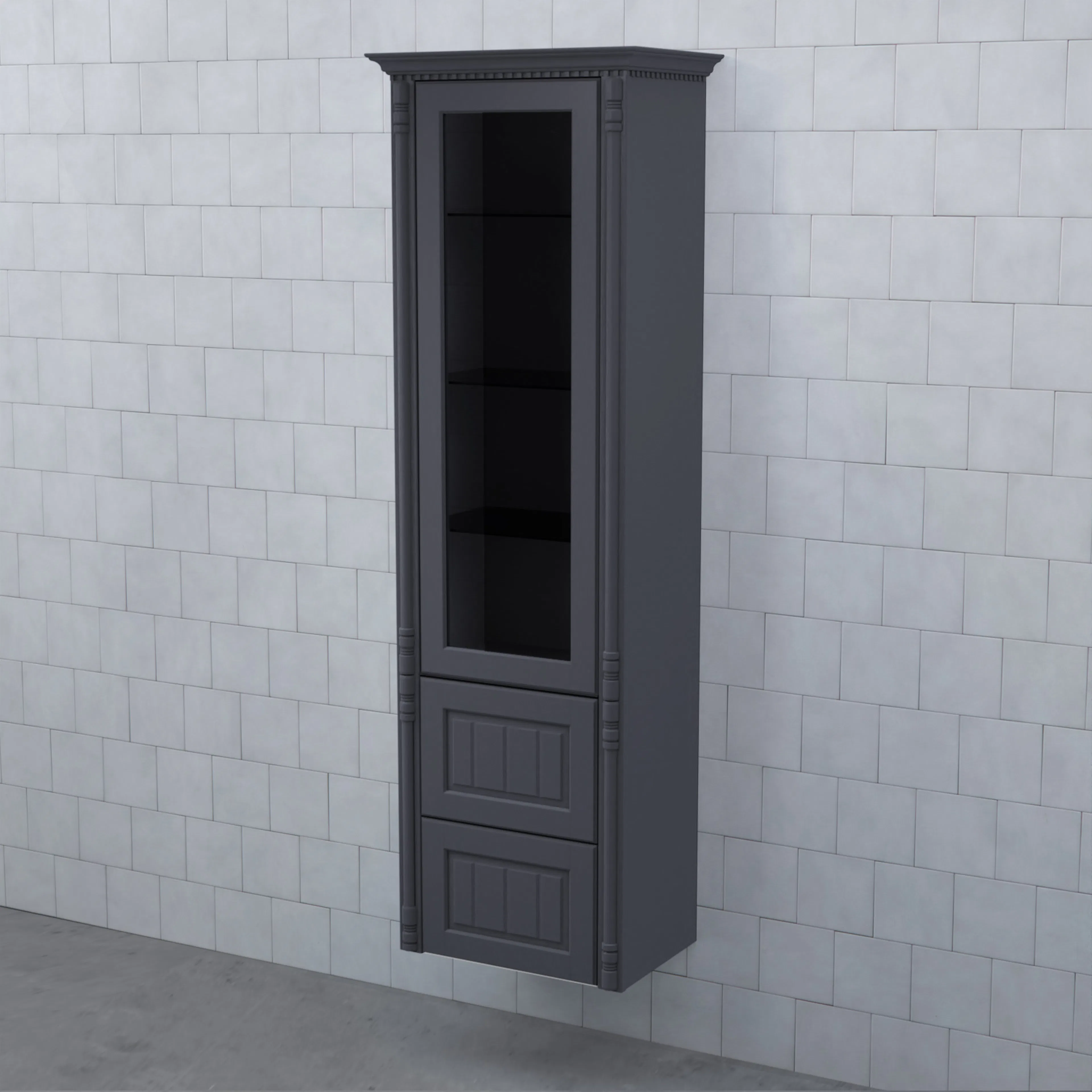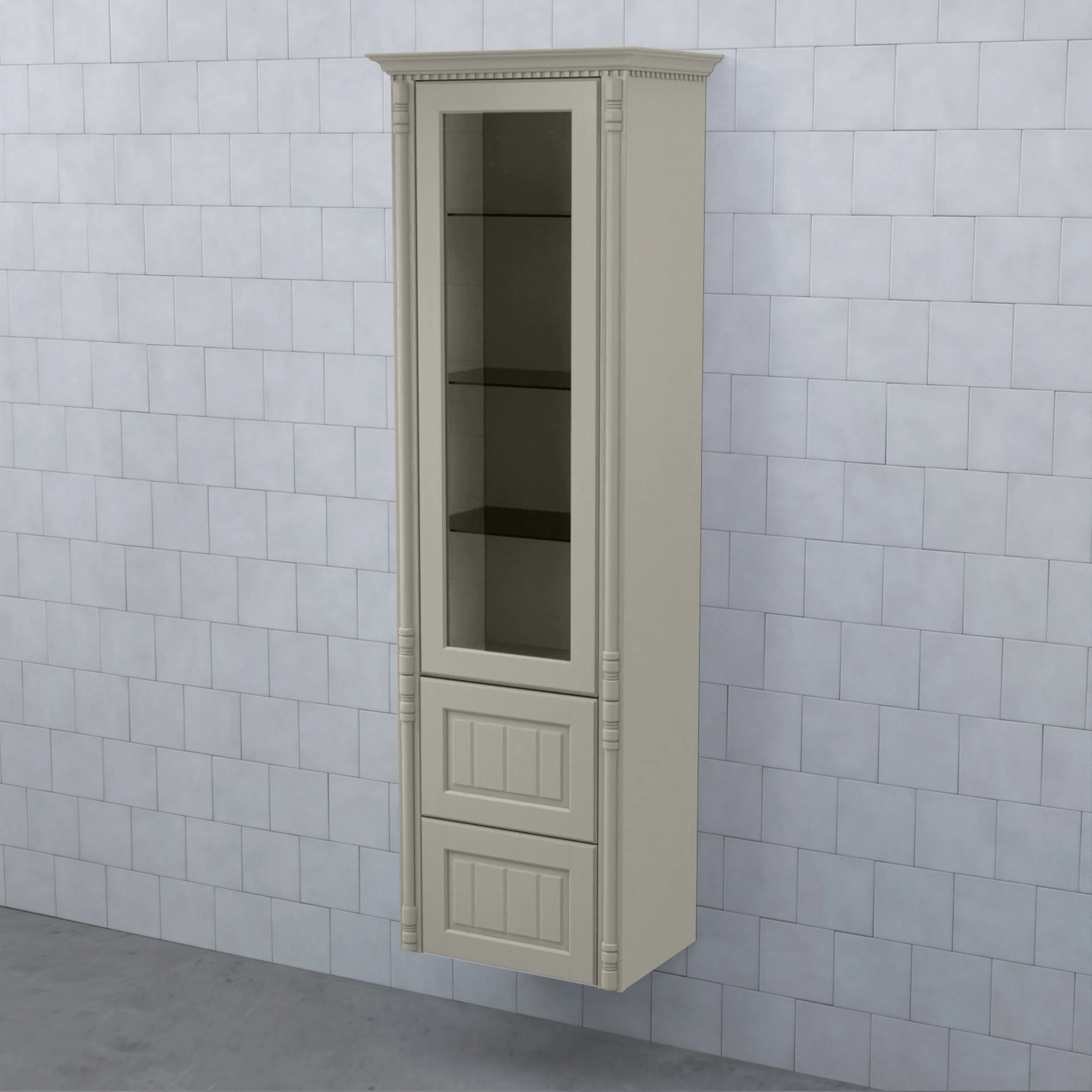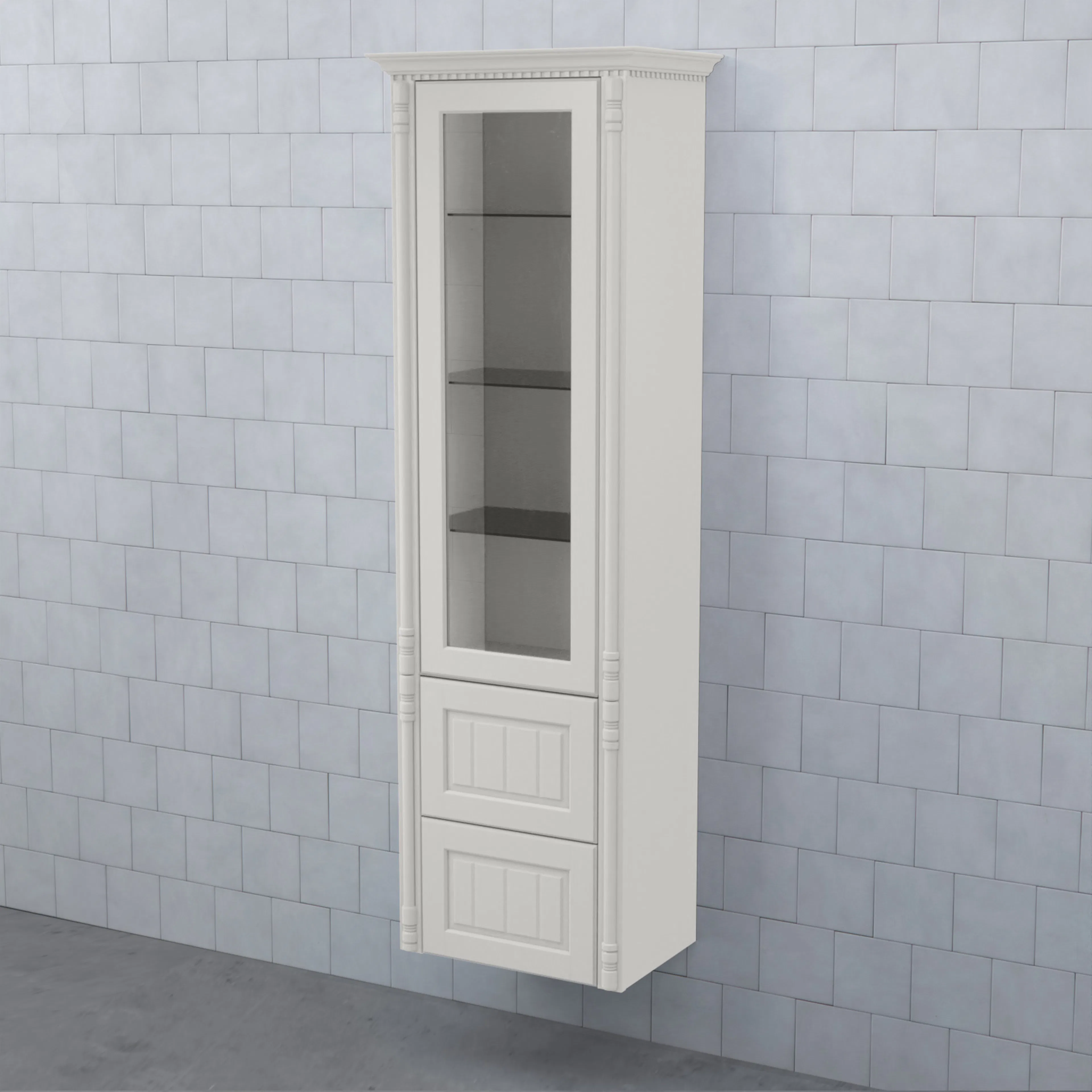 Högskåp Valhall Vitrinlucka med Två Lådor från Björbo Badrum är ett stilrent badrumsskåp med en vitrinlucka i övre delen av skåpet och två lådor i nederdelen. Lådorna är stabila fullutdraglådor med dämpning och självindrag. Detta skåp har en tandad krönlist och pelare som stilfullt ramar in möbeln. Stommen är gjord av målad MDF med vackra ramluckor med utfrästa spår.