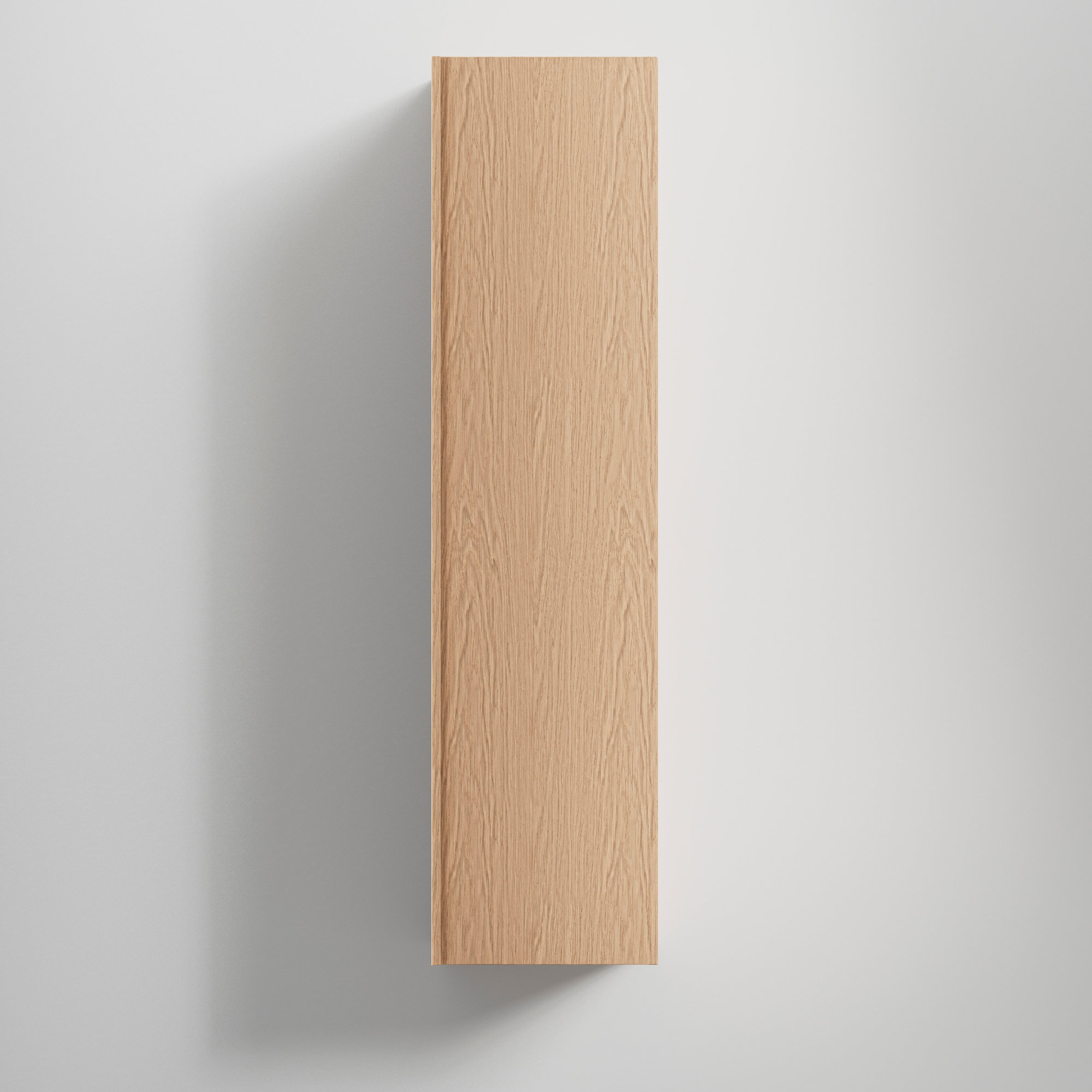 Den integrerade grepplisten i massiv ek löper längs hela dörrens långsida och blir en elegant del av designen. Dörren kan monteras höger- eller vänsterhängd och stängs mjukt med soft close. Invändigt erbjuder skåpet fyra hyllplan – ett fast hyllplan i trä och tre flyttbara hyllplan i 6 mm härdat glas – samt de två aluminiumlådorna som ger smart förvaring i badrum.