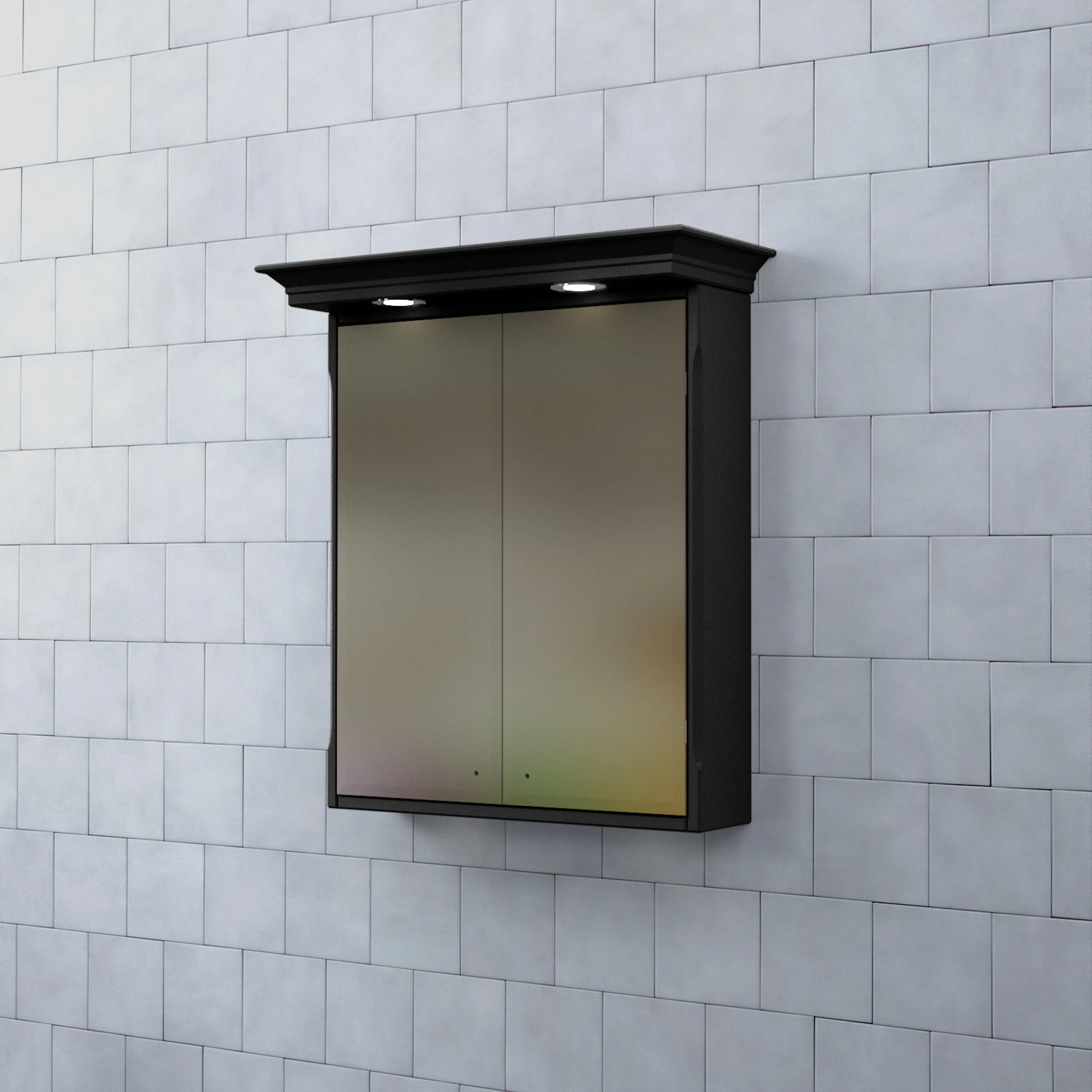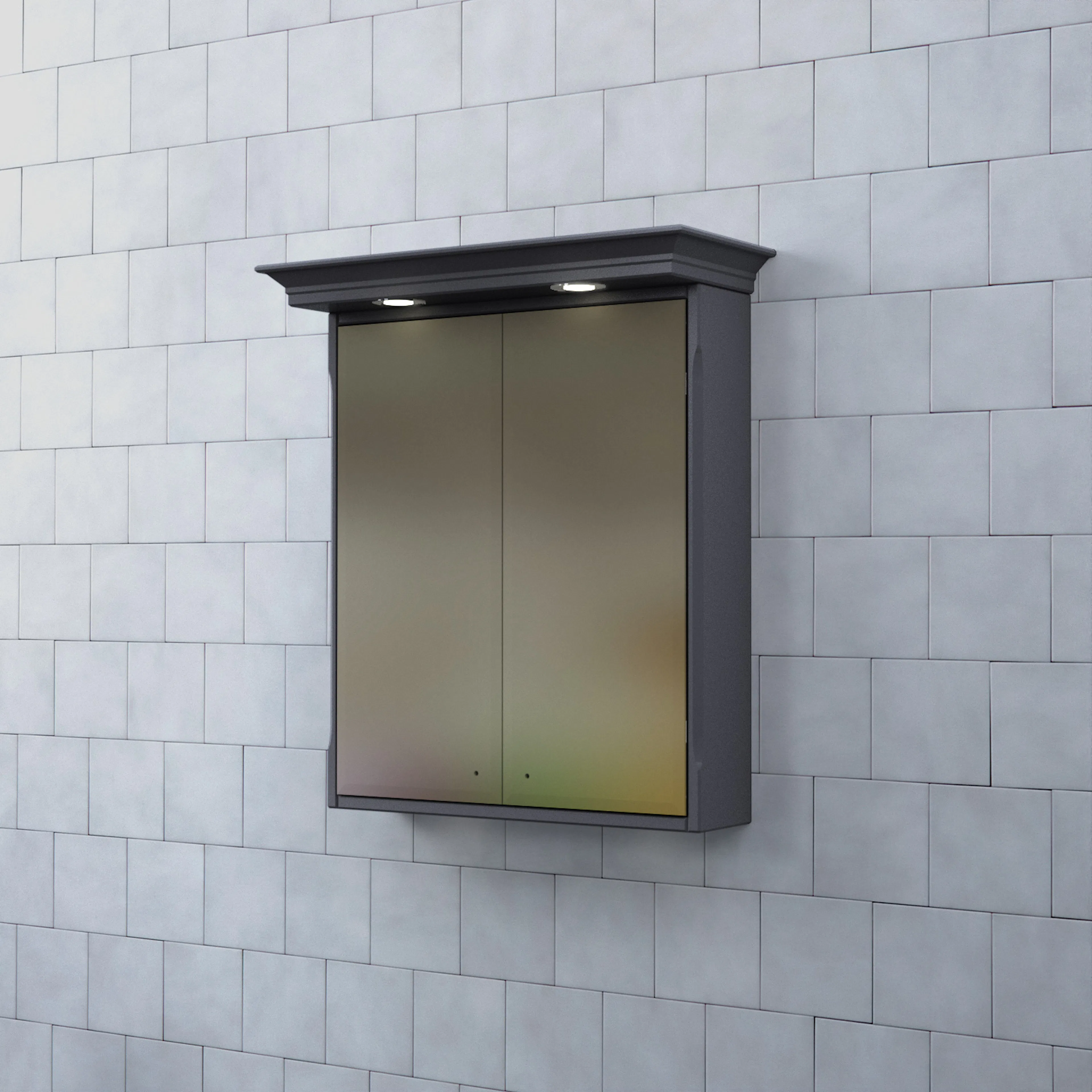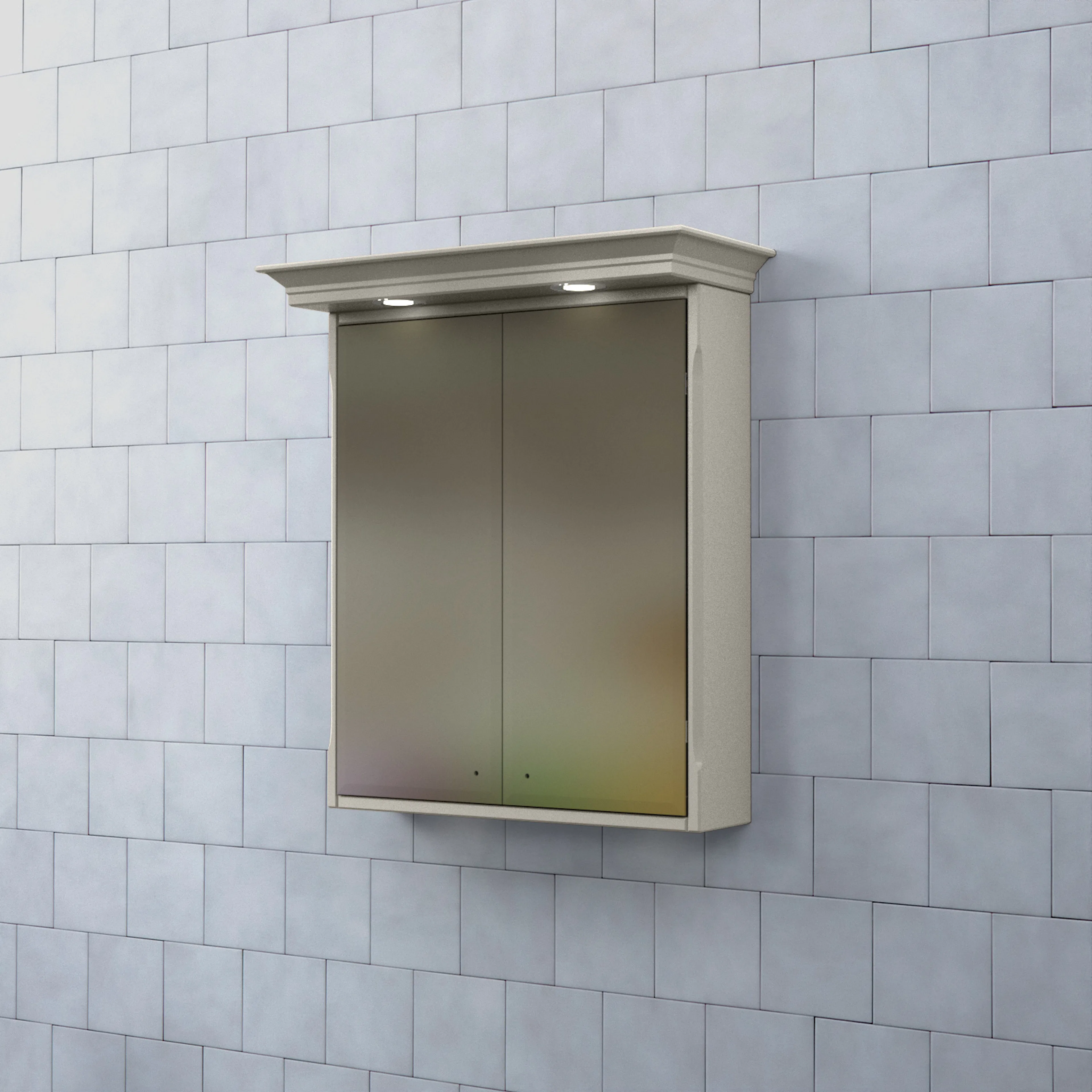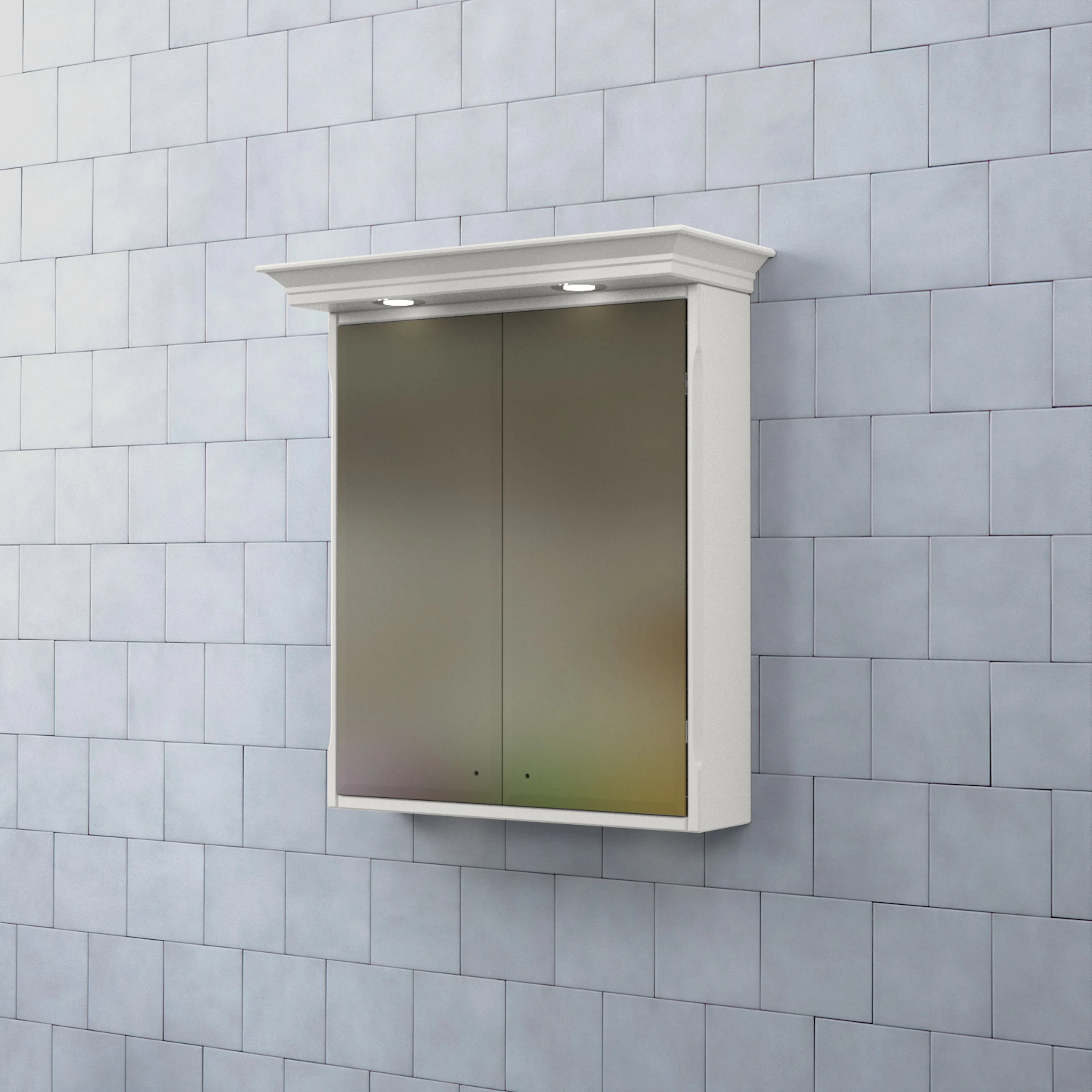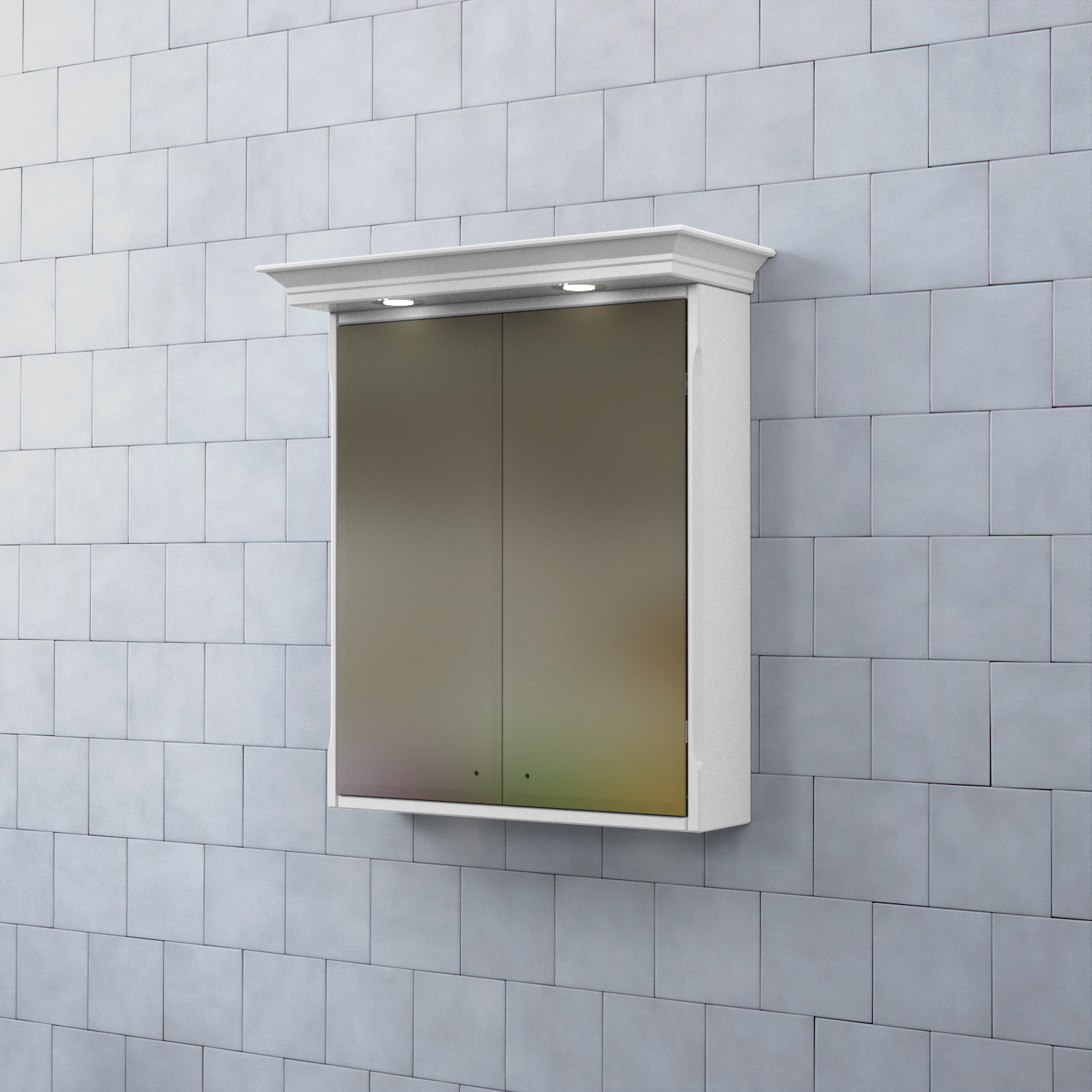 Skåpets stomme är tillverkad av målad MDF med spegelglas. Komplettera spegelskåpet med knoppar och dimmerfunktion till LED-belysningen.