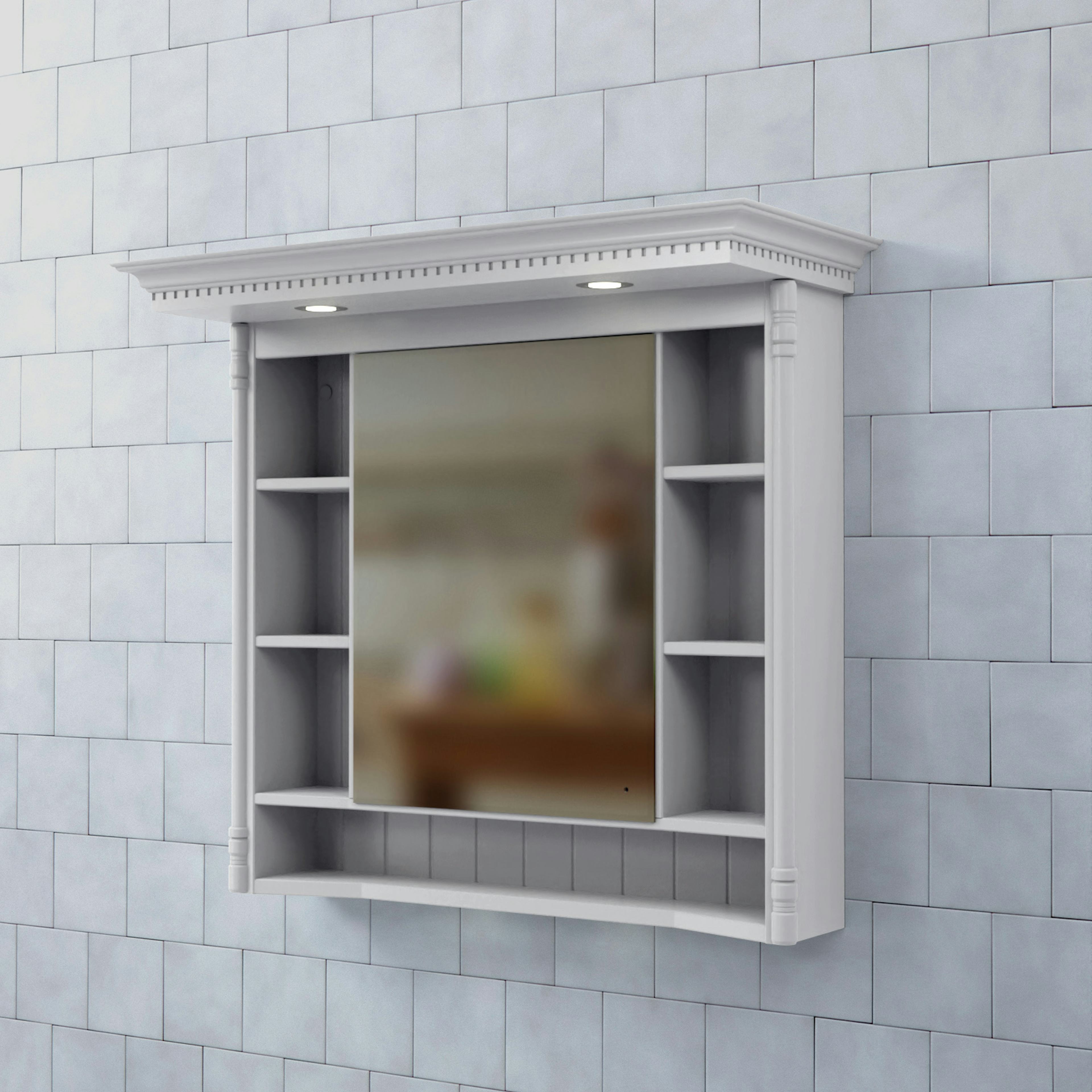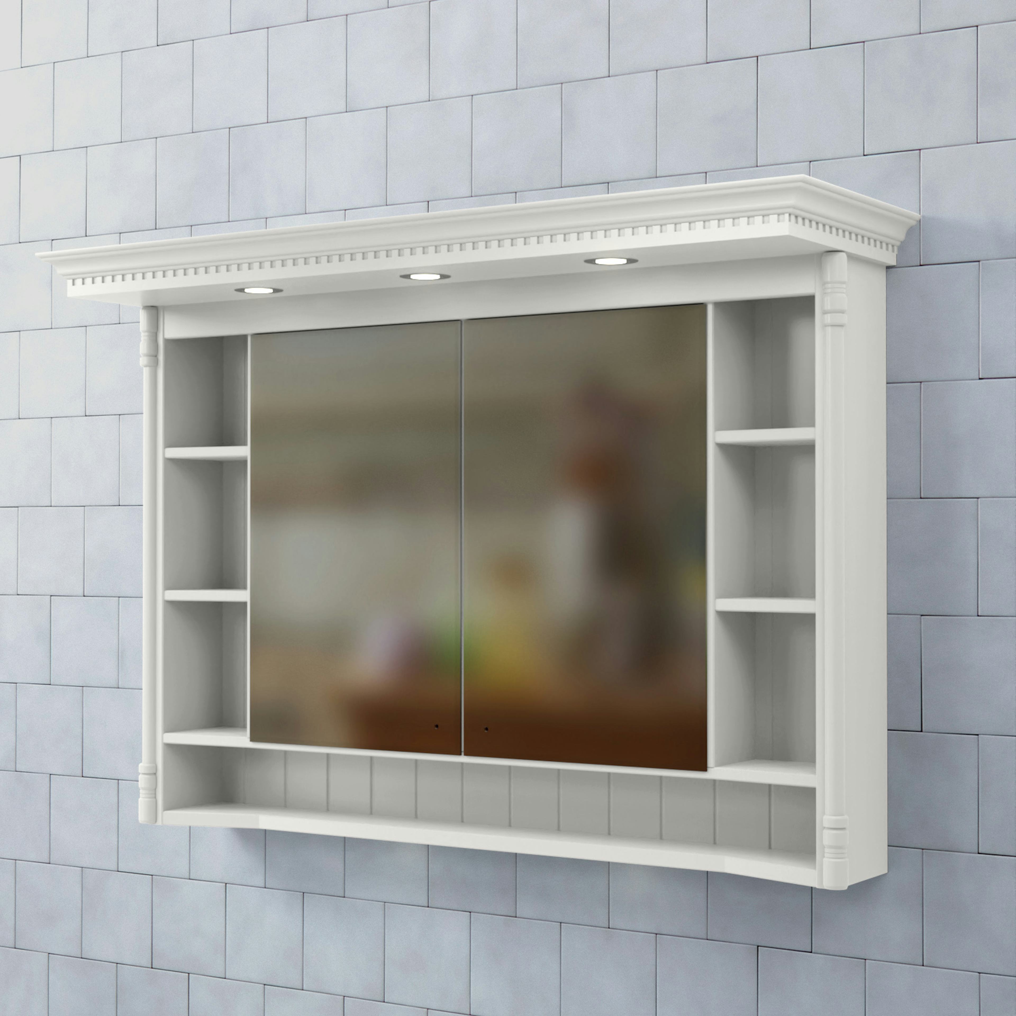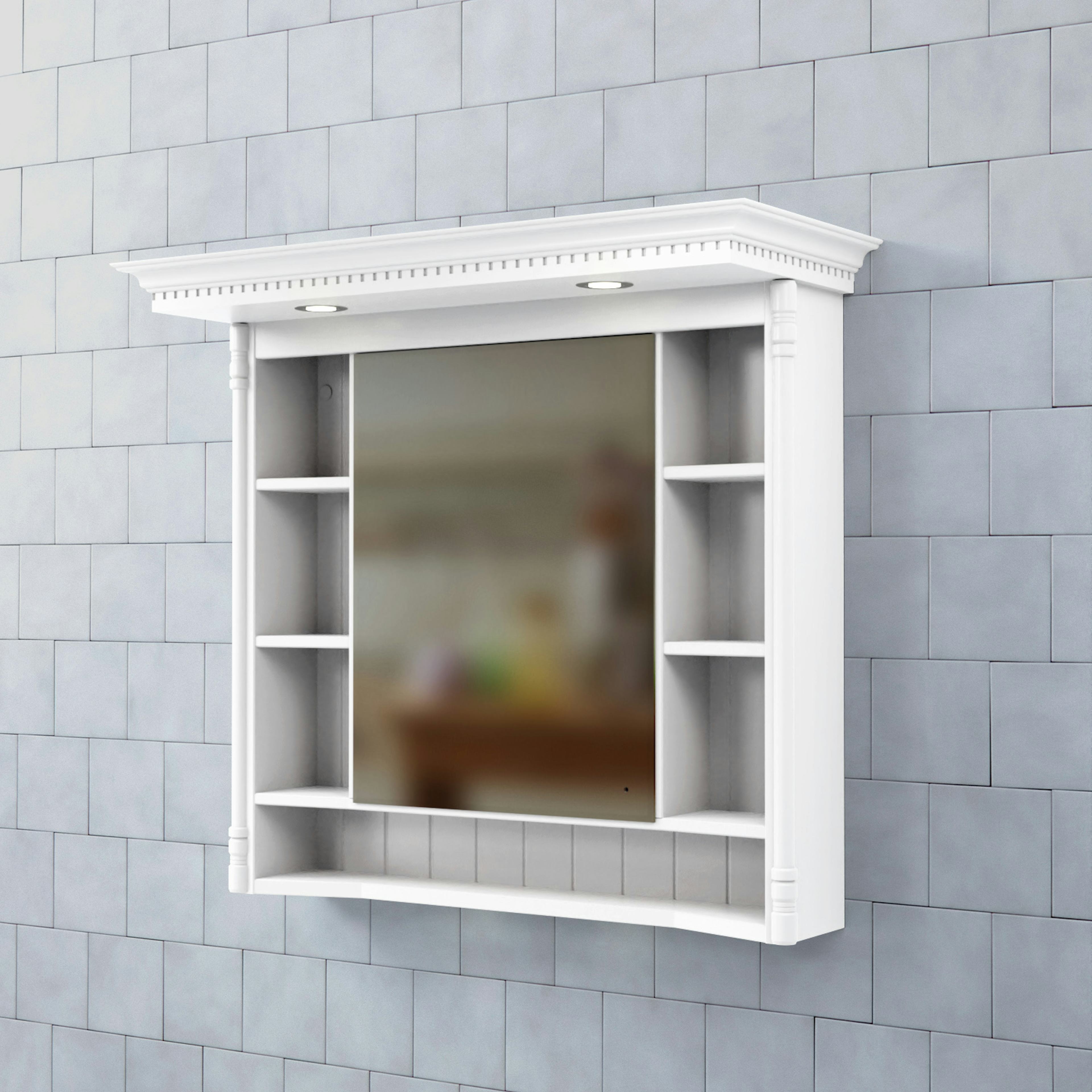 Spegelskåp Valhall med Belysning från Björbo Badrum är ett elegant spegelskåp med både dold och öppen förvaring. Skåpet har en karaktäristisk tandad krönlist med infälld LED-belysning vilket ger spegeln ett klassiskt, högromantiskt intryck i överkant och tvättställsbelysning i underkant. Det har ett eluttag (230V) inne i spegelskåpet som gör att du kan ladda eltandborste eller rakapparat.