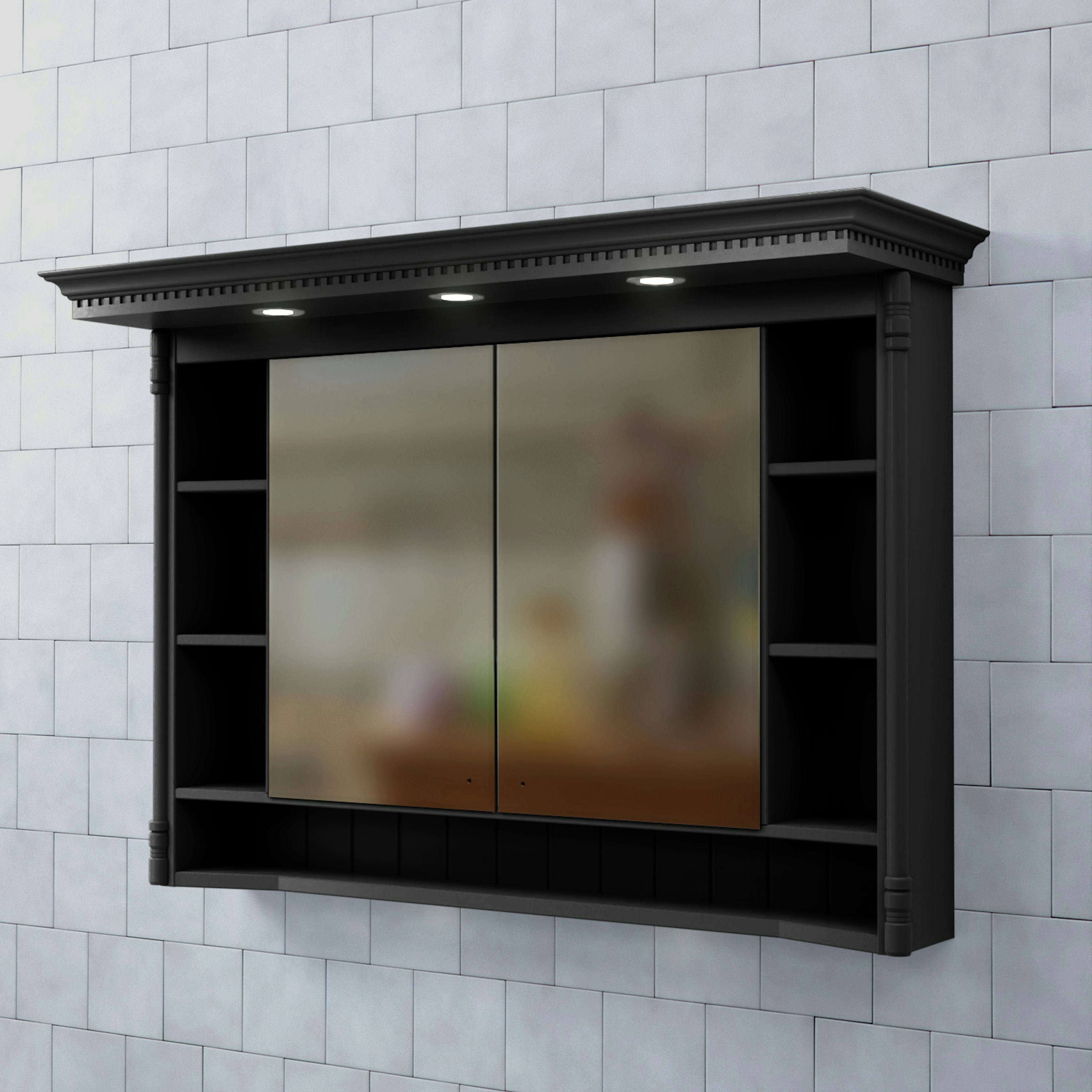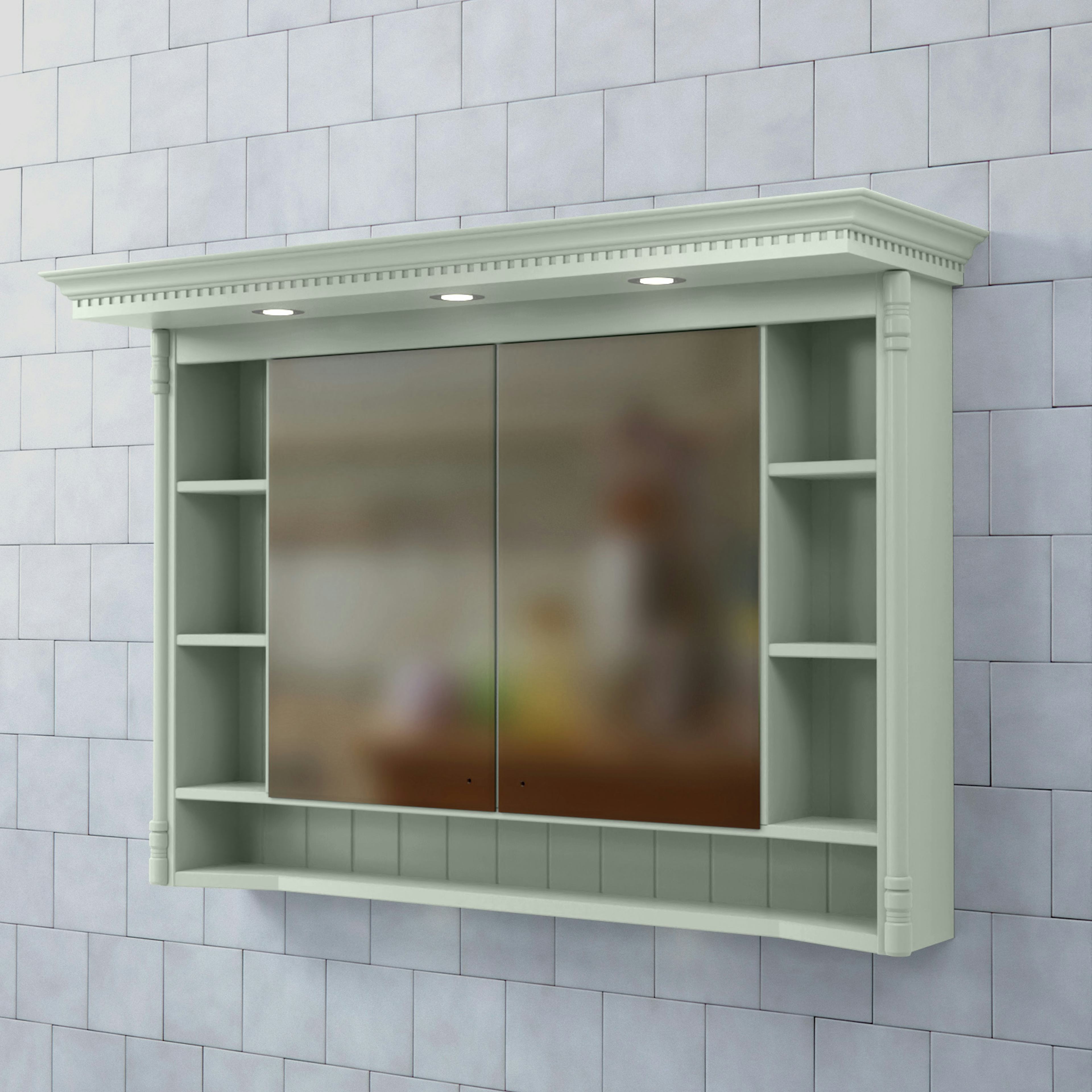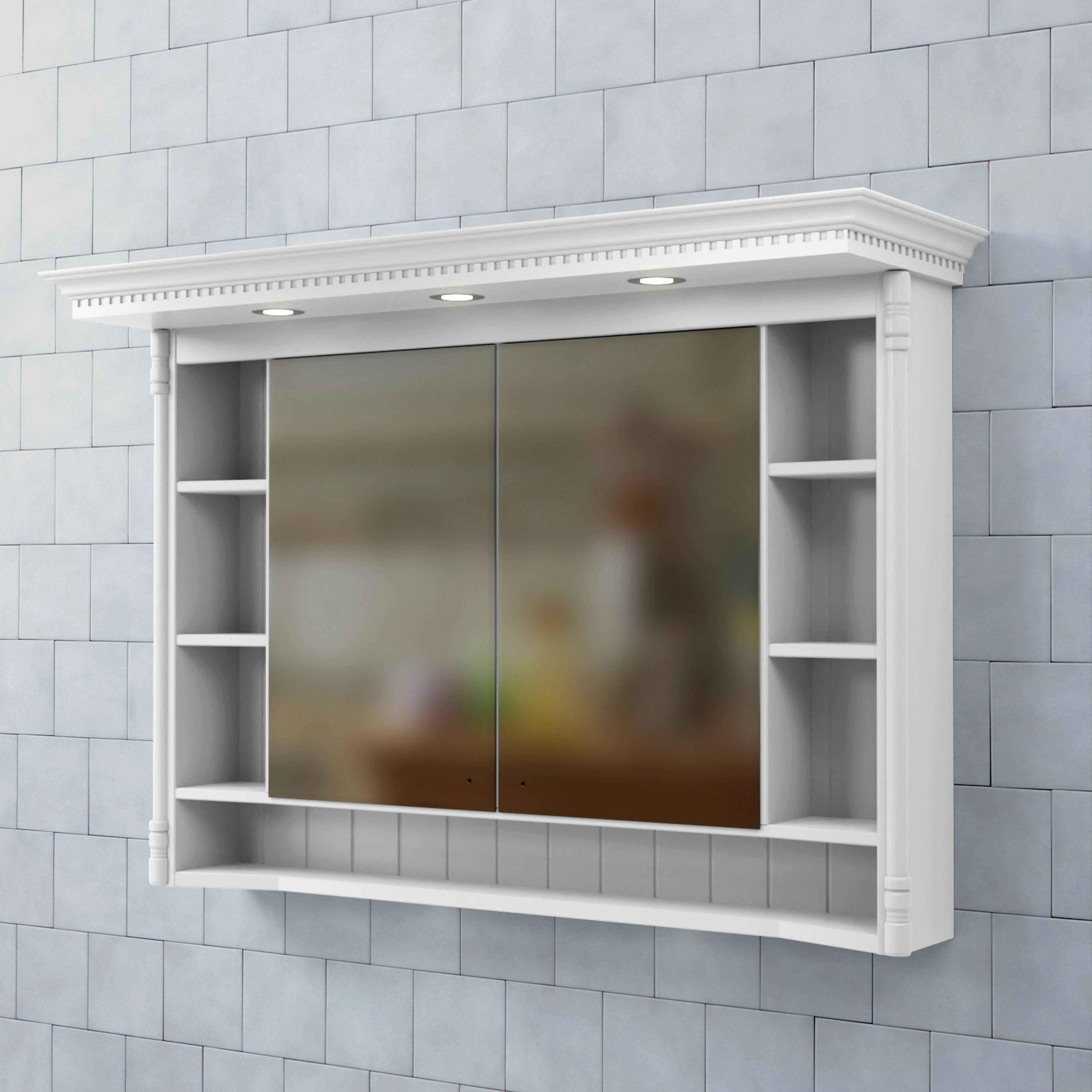 Spegelskåp Valhall med Belysning från Björbo Badrum är ett elegant spegelskåp med både dold och öppen förvaring. Skåpet har en karaktäristisk tandad krönlist med infälld LED-belysning vilket ger spegeln ett klassiskt, högromantiskt intryck i överkant och tvättställsbelysning i underkant. Det har ett eluttag (230V) inne i spegelskåpet som gör att du kan ladda eltandborste eller rakapparat.