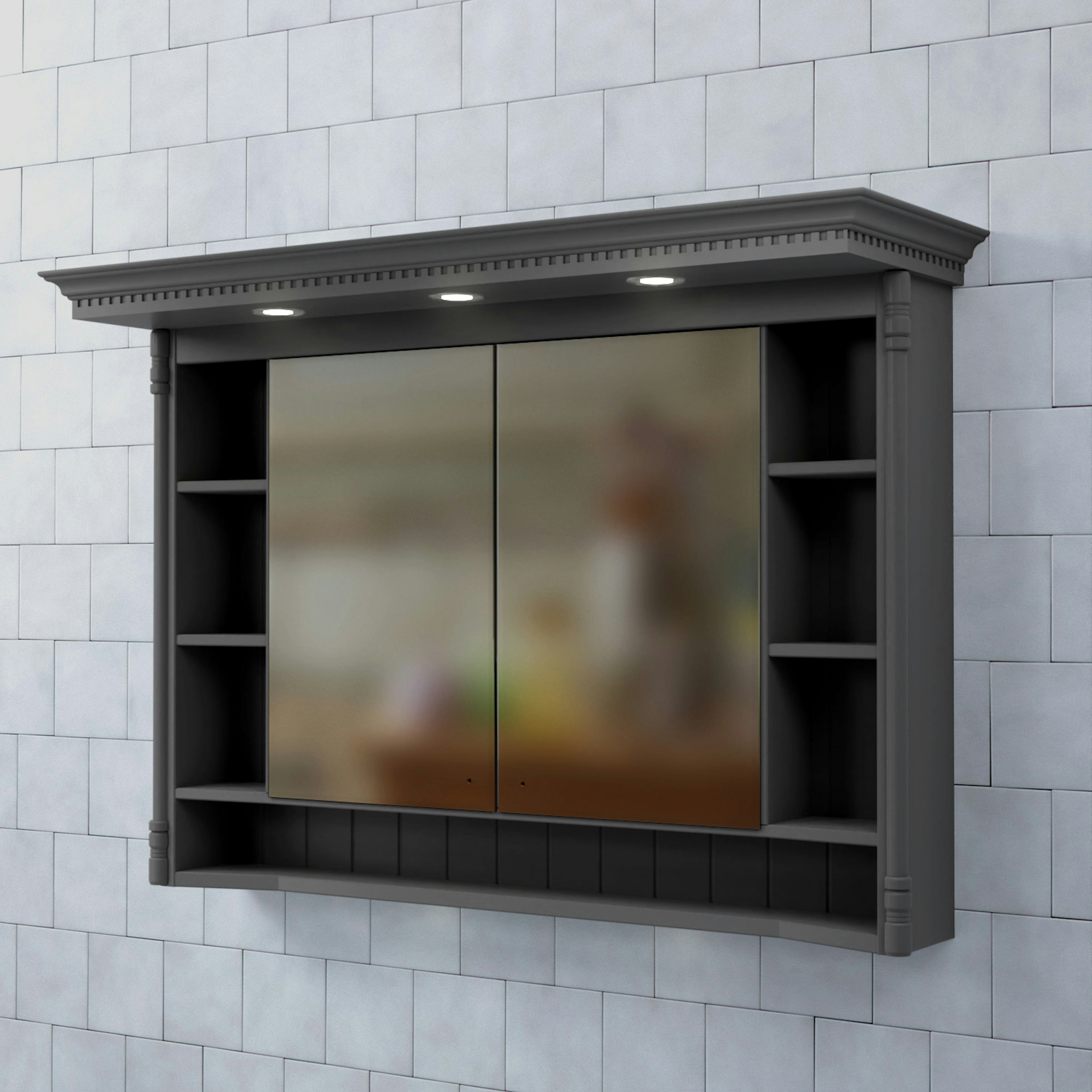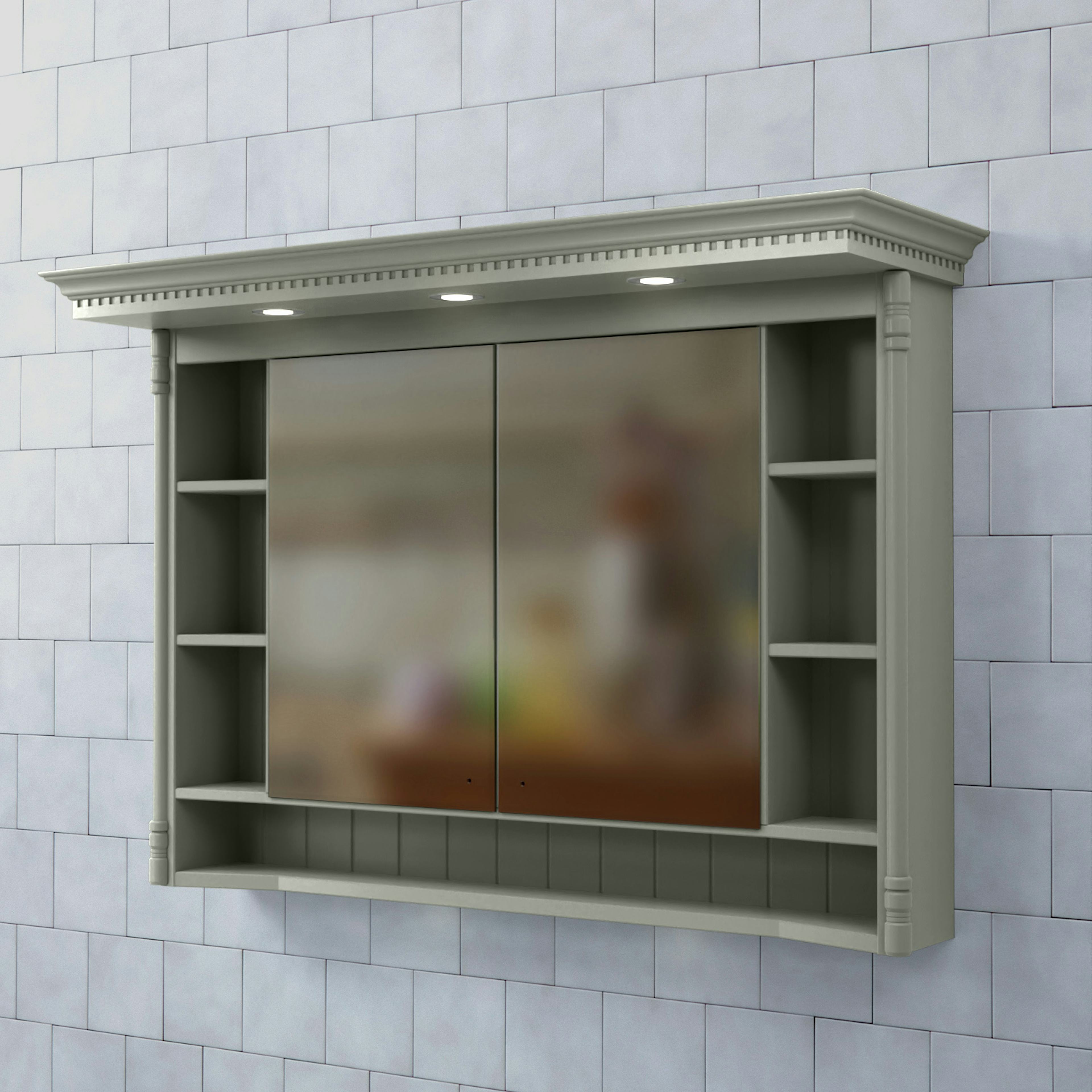 Skåpets stomme är tillverkad av målad MDF med spegelglas. Komplettera spegelskåpet med knoppar och dimmerfunktion till LED-belysningen.