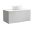 Tvättställsskåp Alterna Ella levereras med bänkskiva och ovanpåliggande tvättställ. Bänkskivan är gjord av kvartskomposit och tvättställ i porslin, dia 415mm. Underskåpen har mjukstängande lådor. Handtag och blandare beställs separat.