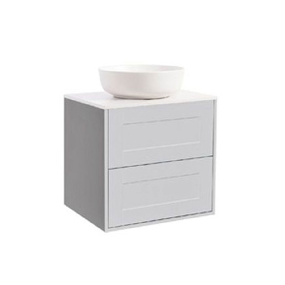 Tvättställsskåp Alterna Gabriella med bänkskiva och runt ovanpåliggande tvättställ. Bänkskivan är gjord av kvartskomposit och tvättställ i porslin, 415x415x135 mm. Underskåpen har mjukstängande lådor som ger en lyxig och tyst användning samtidigt som de ökar möbelns livslängd.