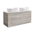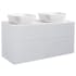 Tvättställsskåp Alterna Isella levereras med bänkskiva och ovanpåliggande tvättställ. Bänkskivan är gjord av kvartskomposit och dubbla tvättställ i porslin, 455x325x135 mm. Underskåpen har mjukstängande lådor. Handtag och blandare beställs separat.