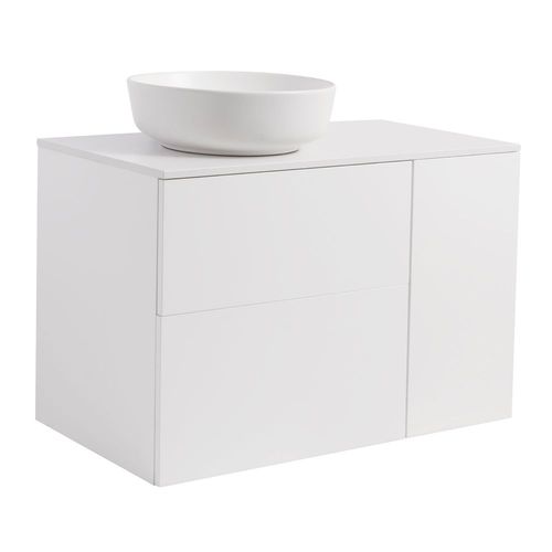 Tvättställsskåp Alterna Isella med bänkskiva i kvartskomposit och runt tvättställ. Skåpet levereras med en integrerad tvättkorg i 30-skåpet. Välj om du vill ha ett eller två stycken 30-skåp med tvättkorg. Bänkskivan är gjord av kvartskomposit och tvättstället i porslin, dia 415 mm. Underskåpen har mjukstängande lådor. Handtag och blandare beställs separat.