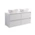 Tvättställsskåp Alterna Luxor med bänkskiva kvartskomposit och två rektangulära tvättställ. Bänkskivan är gjord av kvartskomposit och tvättställen i porslin, 455x325x135 mm. Underskåpen har mjukstängande lådor. Handtag och blandare beställs separat.