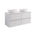 Tvättställsskåp Alterna Luxor med bänkskiva kvartskomposit och två runda tvättställ. Bänkskivan är gjord av kvartskomposit och tvättställen i porslin, dia 415 mm. Underskåpen har mjukstängande lådor. Handtag och blandare beställs separat.