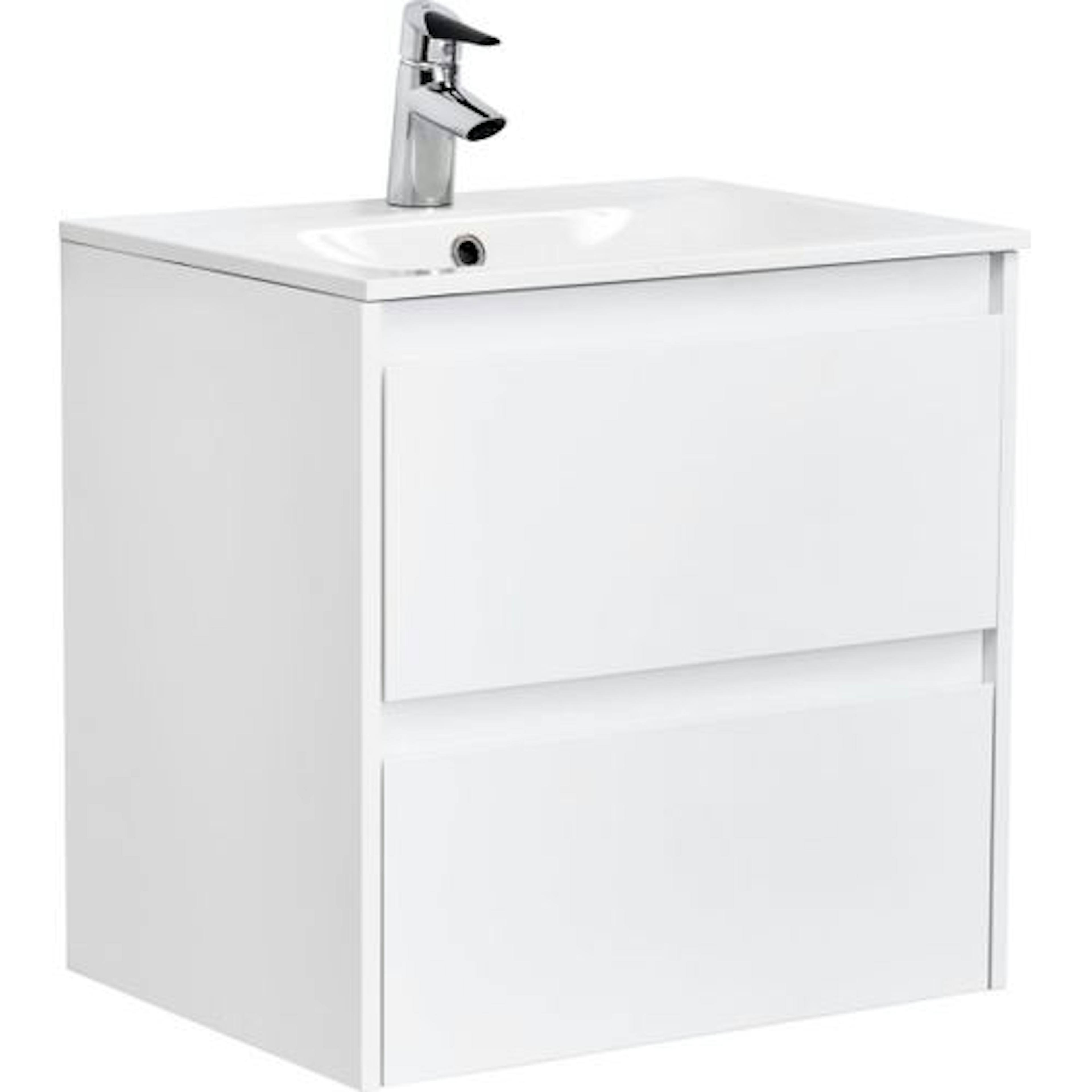Tvättställsskåp Alterna Luxor med Ariella Tvättställ i mineralkomposit. Skåpet har mjukstängande lådor och infällda handtag. Med eluttag, IP44, i nedre lådan.