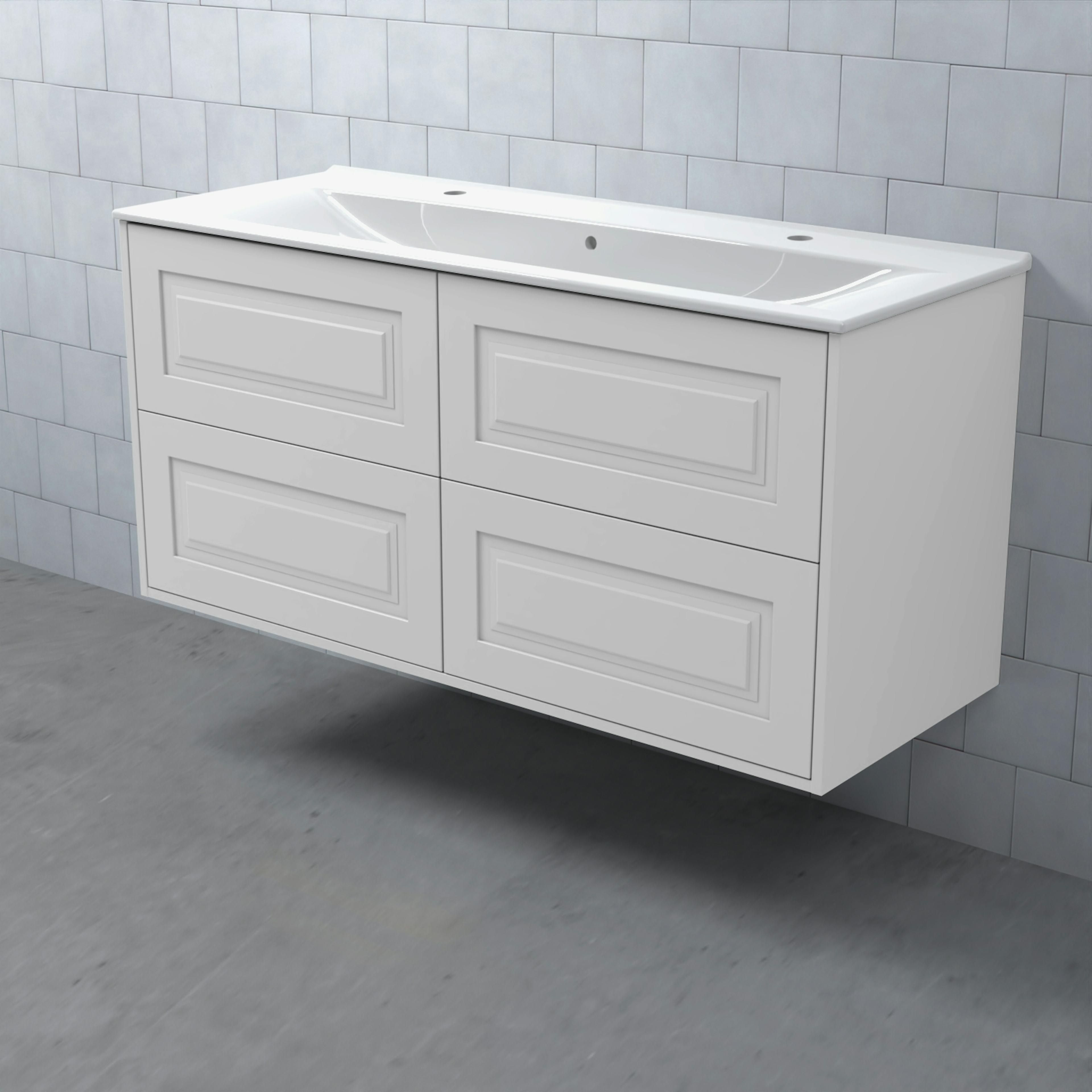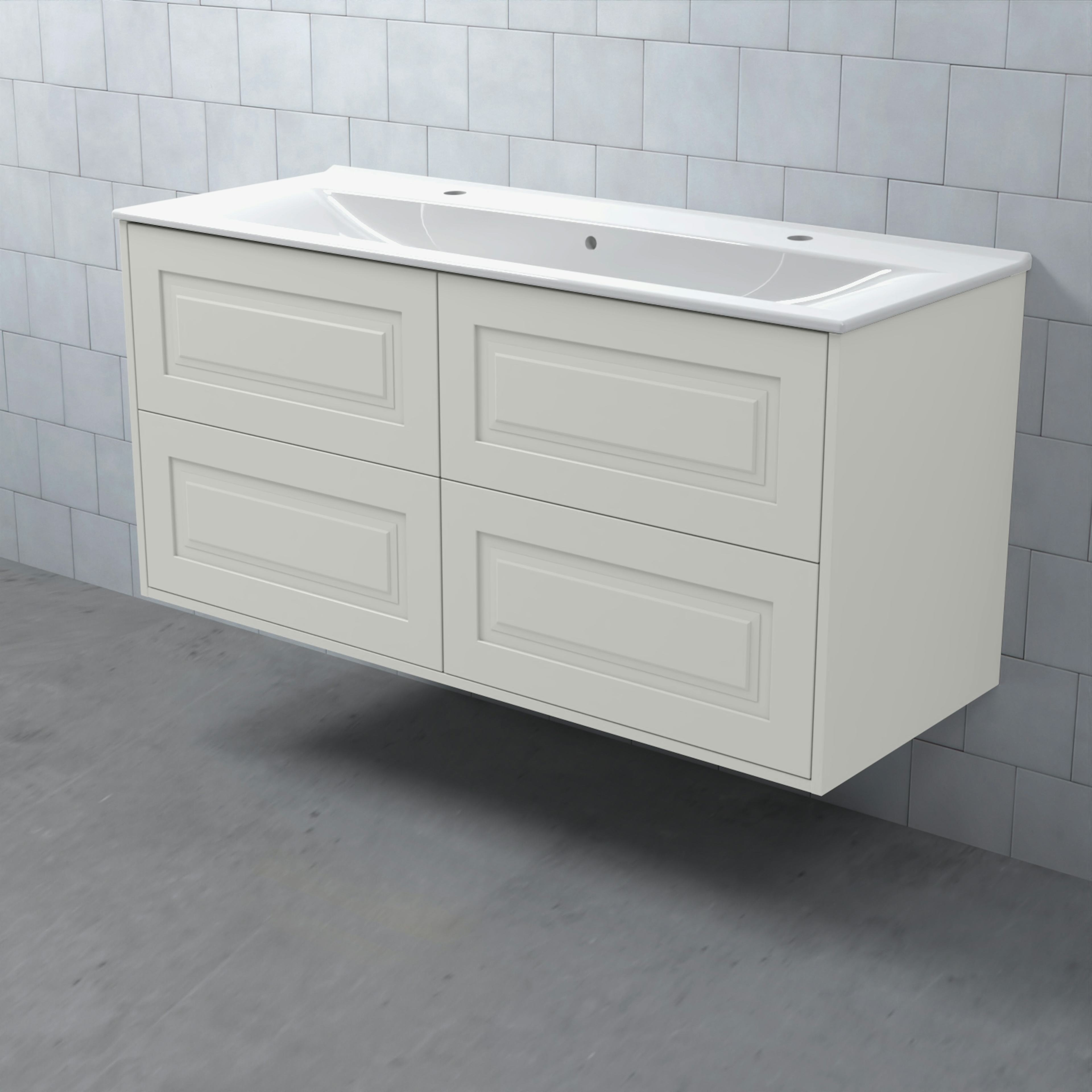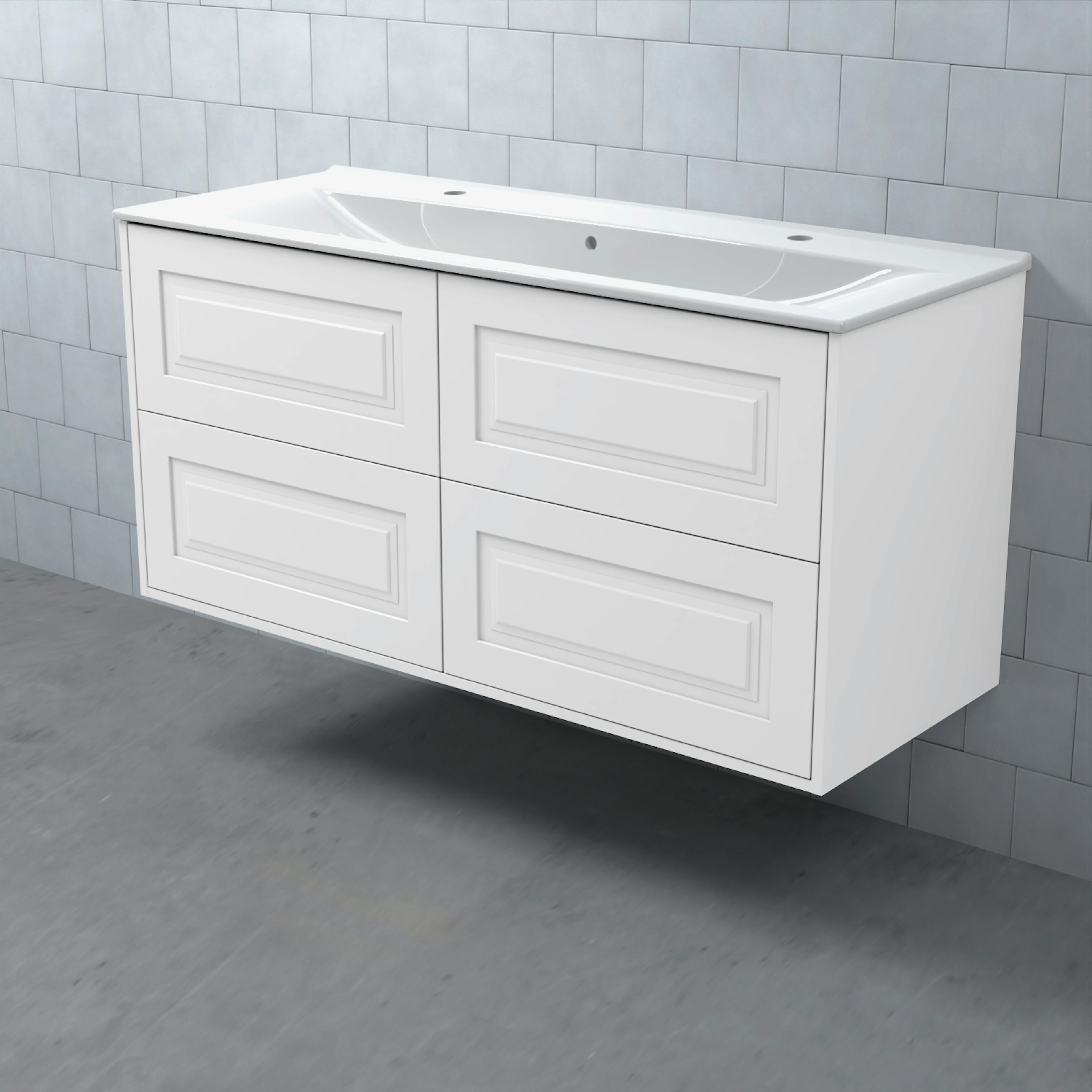 Stommen är tillverkad av fukttrögt skivmaterial och skåpet levereras färdigmonterat och transportförpackat från fabrik. Komplettera din möbel med tvättställ, blandare, handtag, eluttag, extra lådindelare och ben. Du kan välja mellan olika heltäckande tvättställ, ovanpåliggande tvättställ med medföljande bänkskiva eller en bänkskiva med ett underlimmat porslinstvättställ, allt efter eget tycke och smak.