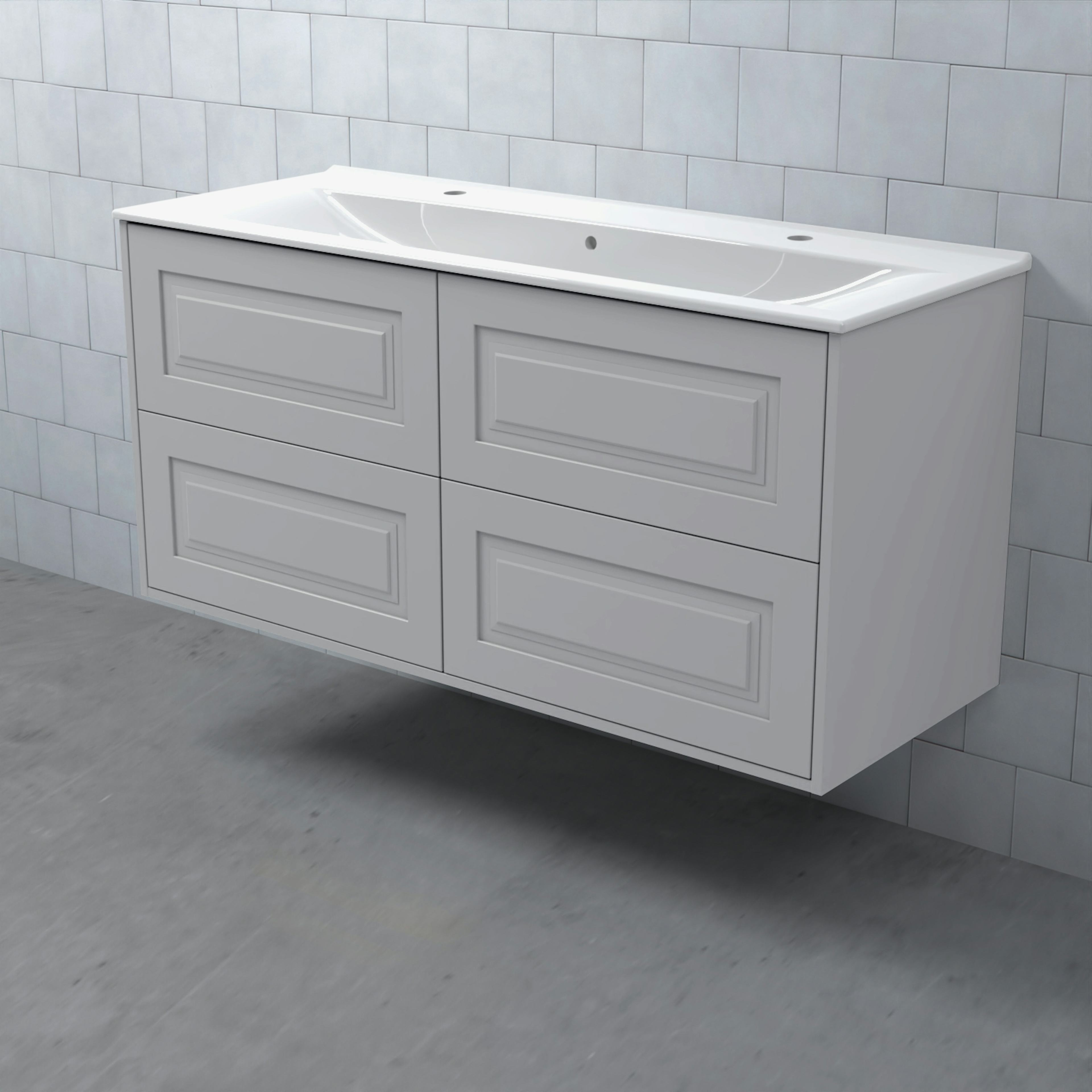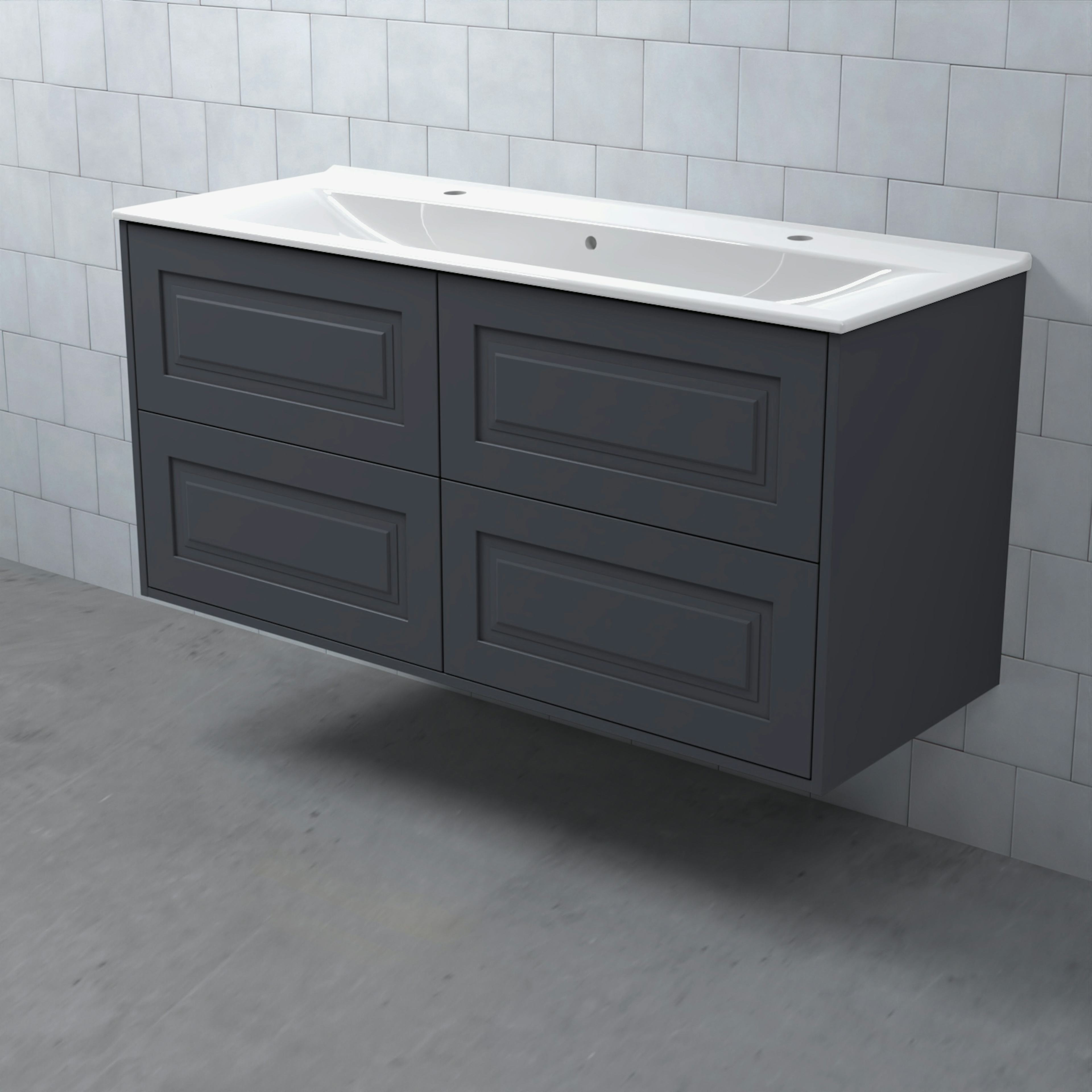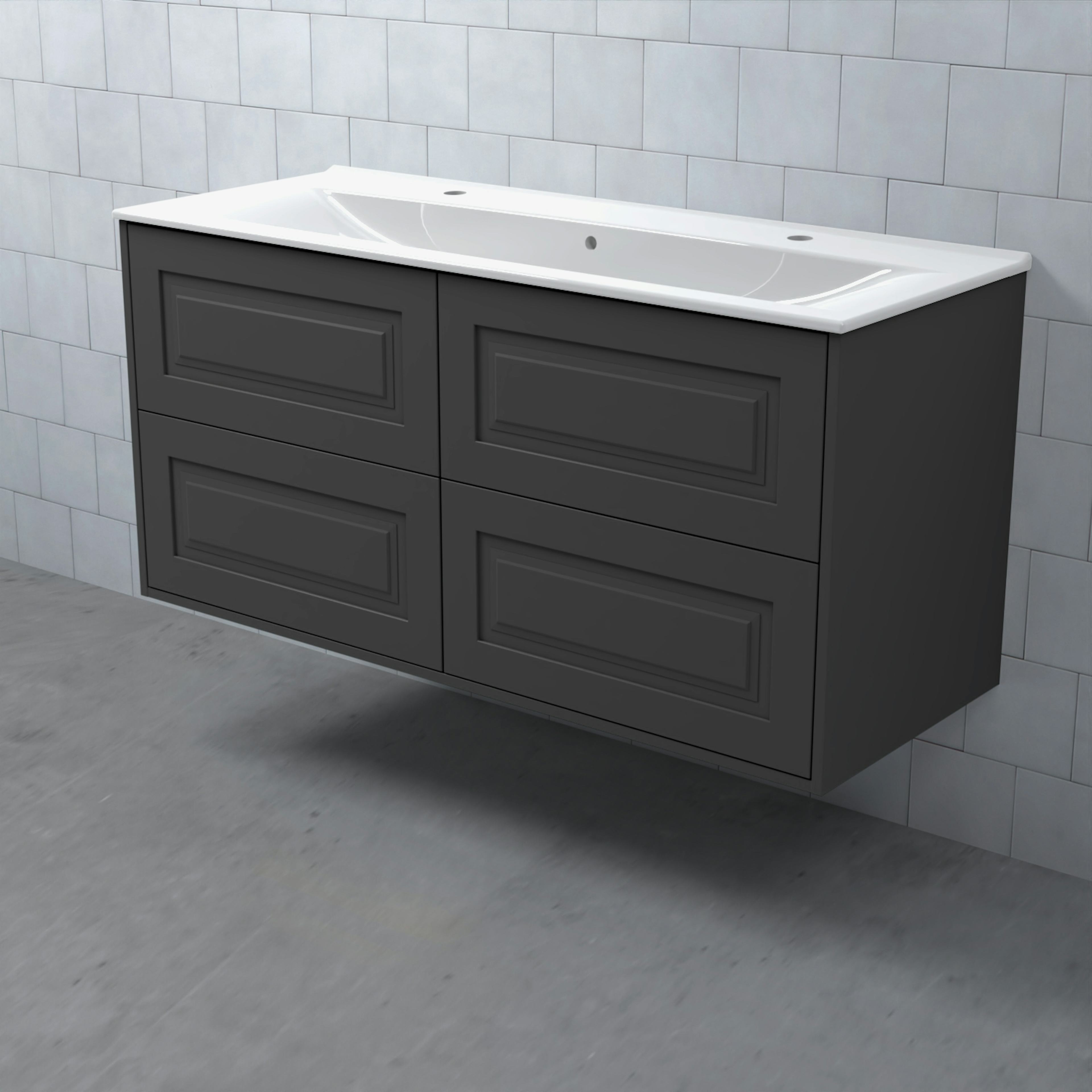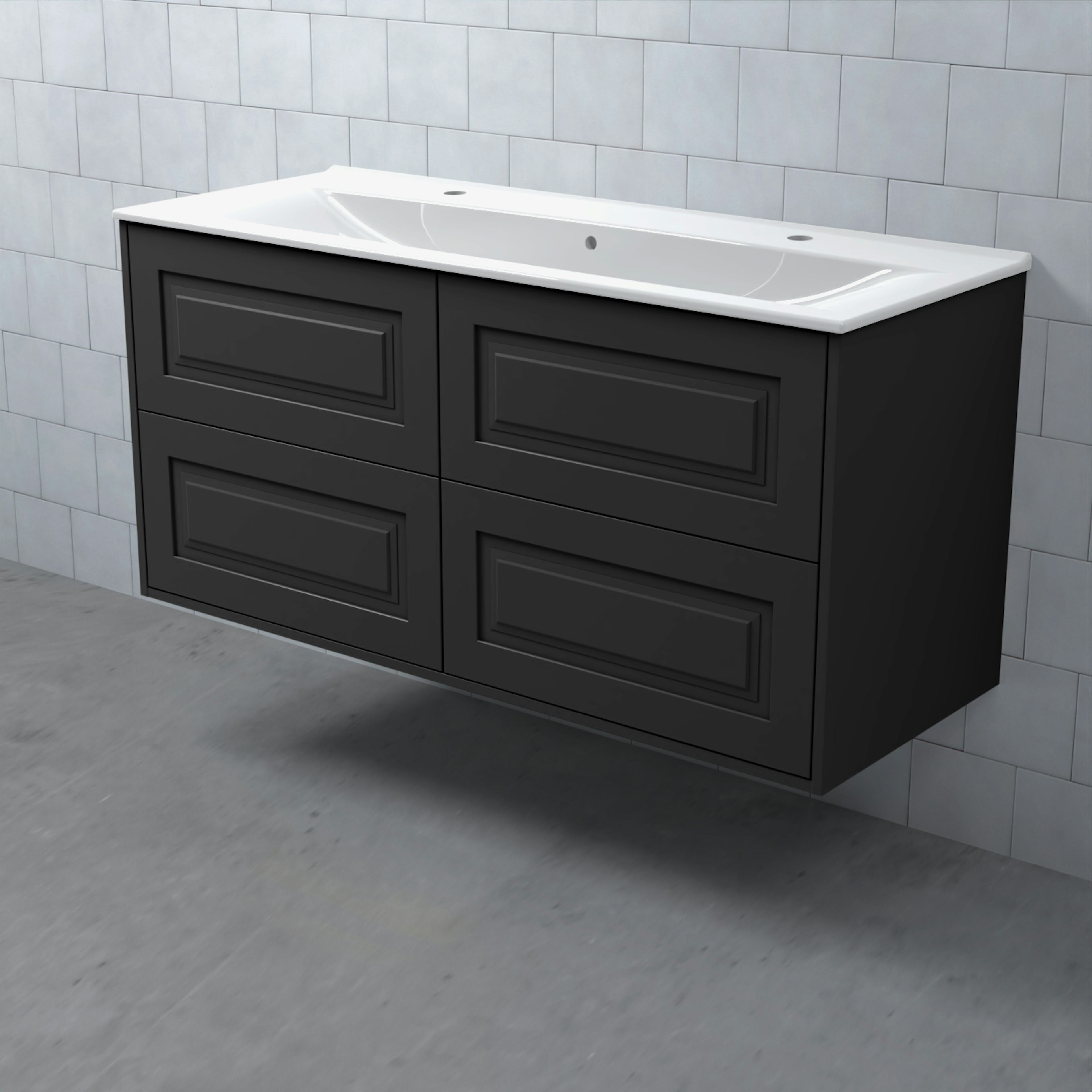 Stommen är tillverkad av fukttrögt skivmaterial och skåpet levereras färdigmonterat och transportförpackat från fabrik. Komplettera din möbel med tvättställ, blandare, handtag, eluttag, extra lådindelare och ben. Du kan välja mellan olika heltäckande tvättställ, ovanpåliggande tvättställ med medföljande bänkskiva eller en bänkskiva med ett underlimmat porslinstvättställ, allt efter eget tycke och smak.