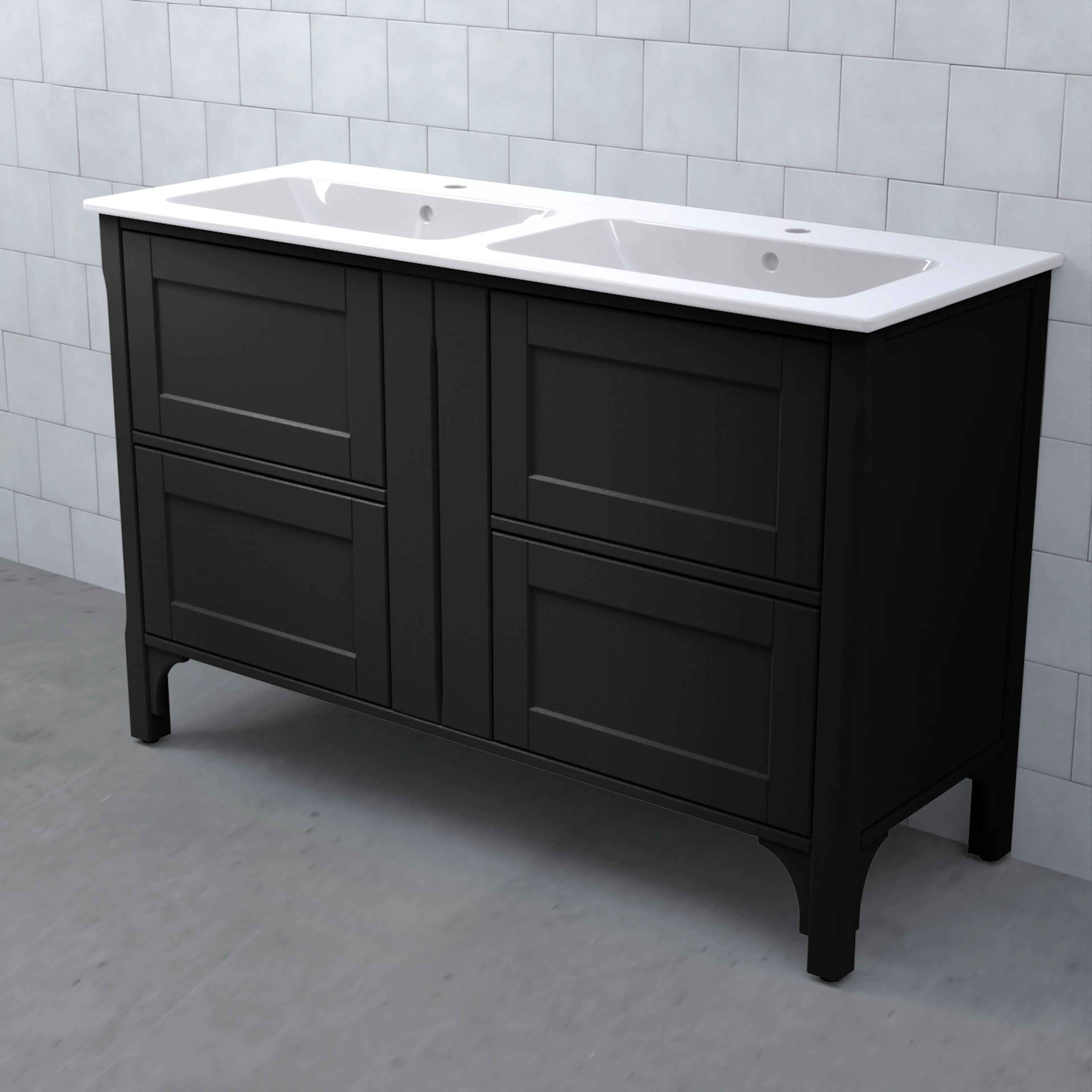 Tvättställsskåp Saga 130 Dubbel från Björbo Badrum är ett elegant tvättställsskåp för dubbla tvättställ som levereras utan tvättställ, handtag och blandare. Skåpet är gjort av massivt lövträd och har djupa och mycket stabila fullutdragslådor i svartbetsat trä med mjukstängning och självindrag. Det har ben som är justerbara på höjden och ger möbeln ett klassiskt uttryck som förhöjer stilen på möbeln, observera att skåpet alltid ska fästas i vägg. Tvättställsskåpet levereras med vattenlås, lådindelare och lådmattor.