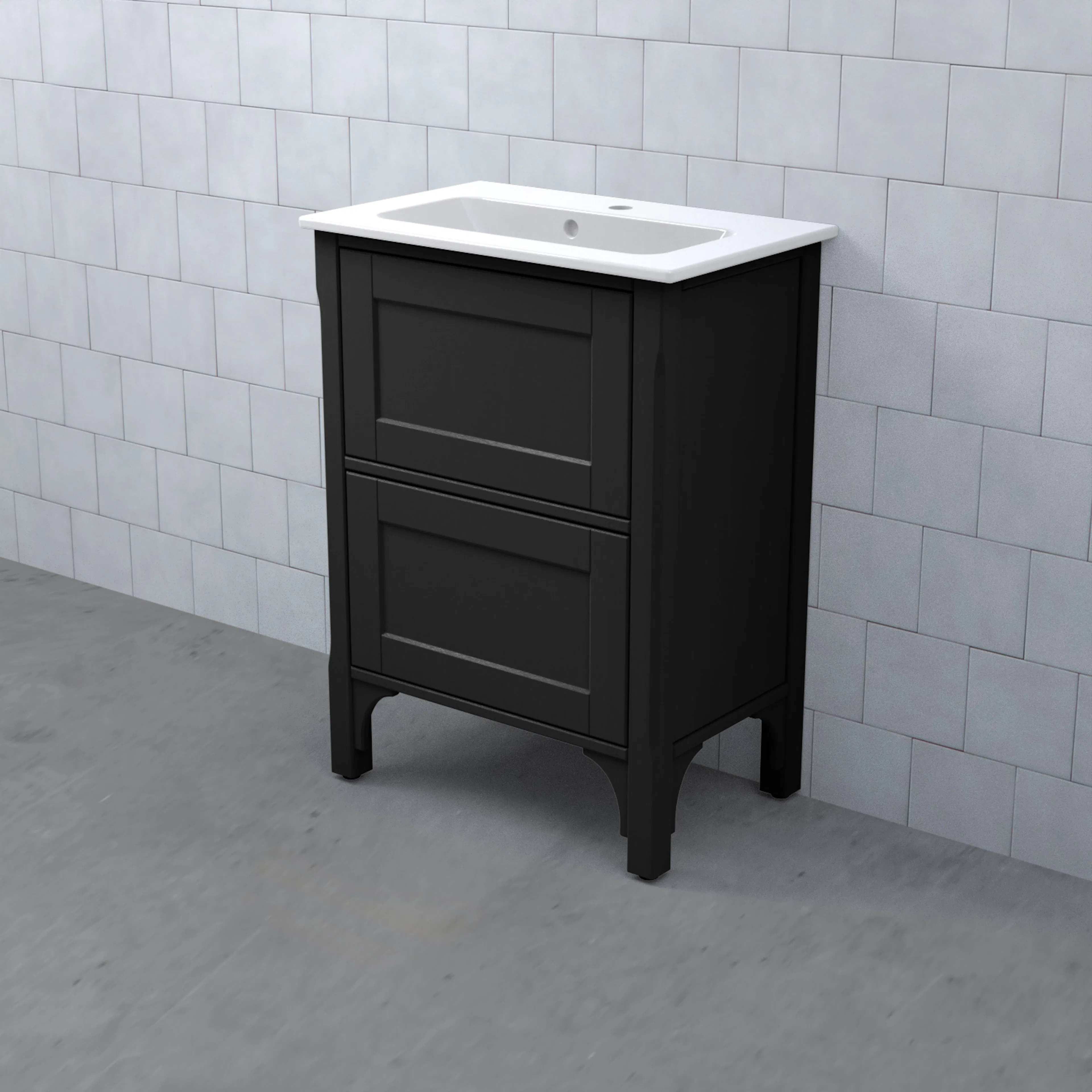 Tvättställsskåp Saga Enkel Kompakt från Björbo Badrum är ett elegant tvättställsskåp som levereras utan tvättställ, handtag och blandare. Detta lite grundare skåp är gjort av massivt lövträd och har djupa och mycket stabila fullutdragslådor i svartbetsat trä med mjukstängning och självindrag. Detta badrumsskåp har ben som är justerbara på höjden och ger möbeln ett klassiskt uttryck som förhöjer stilen på möbeln, observera att skåpet alltid ska fästas i vägg. Tvättställsskåpet levereras med vattenlås, lådindelare och lådmattor.