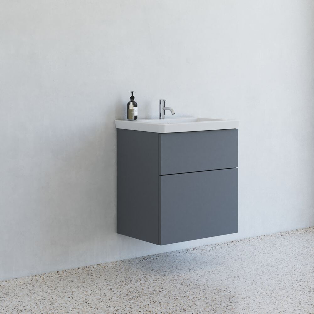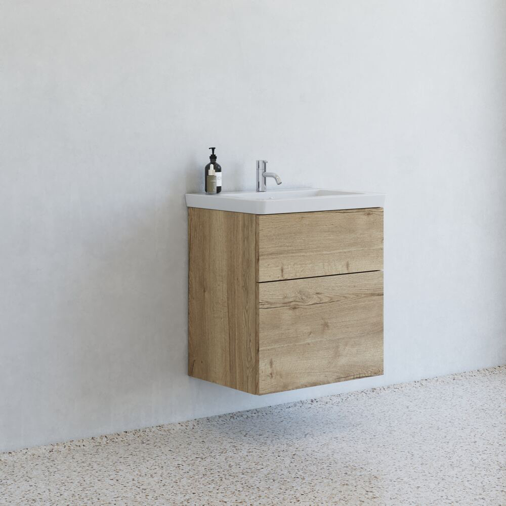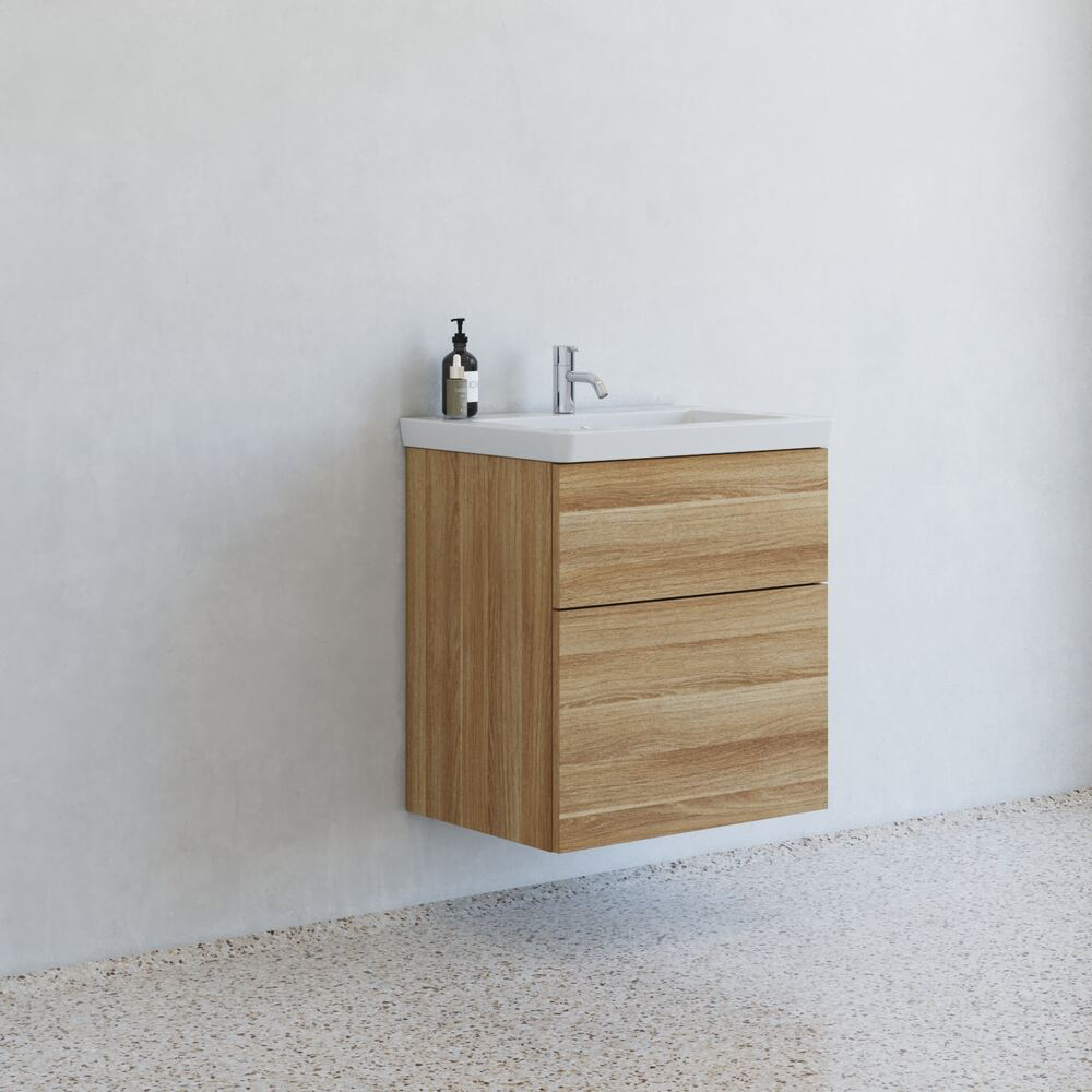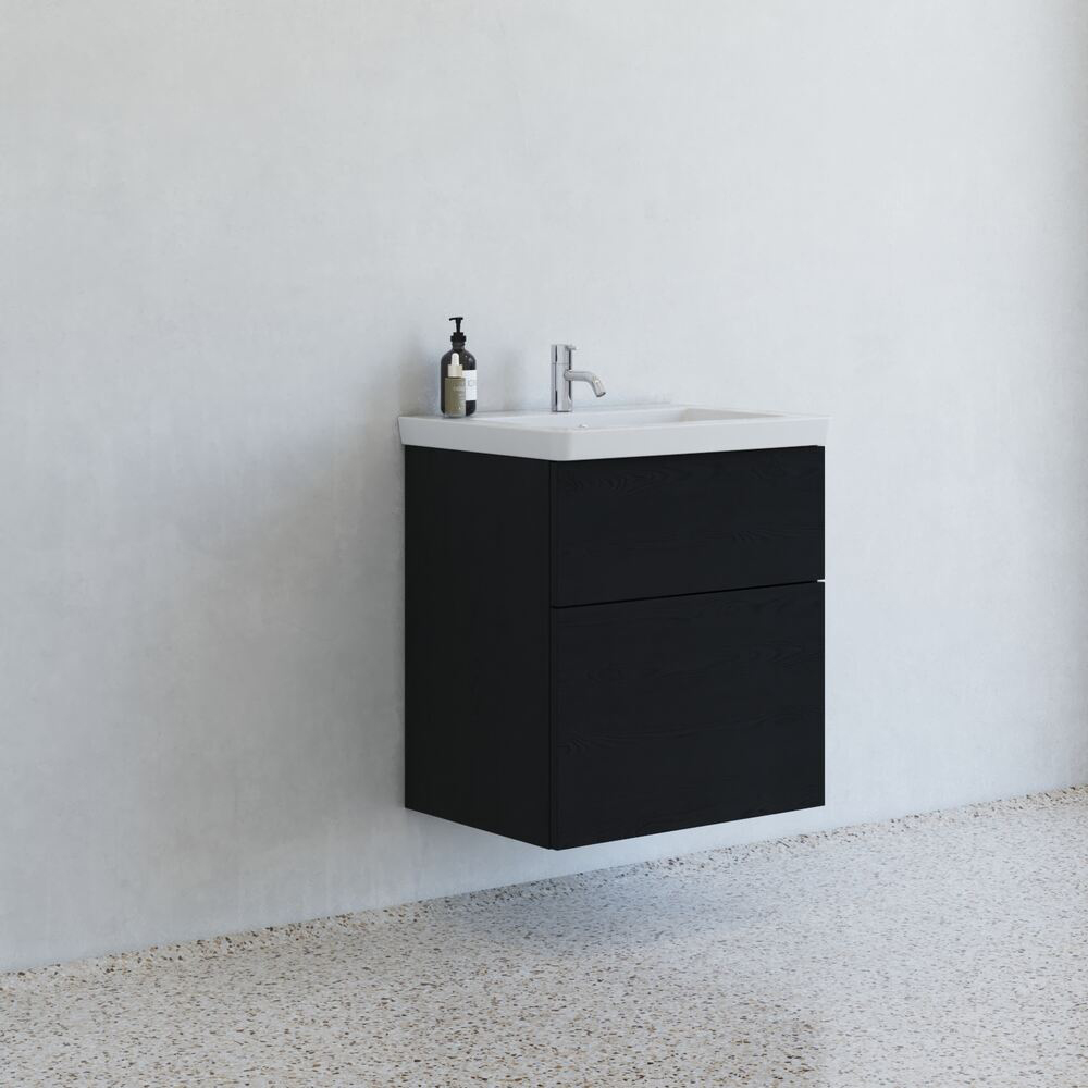 Tvättställsskåpet rymmer två praktiskt utformade lådor med fokus på effektiv förvaring. Den övre lådan är anpassad för mindre badrumsartiklar, medan den nedre är extra hög och ger plats åt större föremål som handdukar, flaskor och hårfön. Samtliga lådor är fullt utdragbara så att du enkelt når även längst in, och har mjukstängande funktion som säkerställer en tyst och kontrollerad stängning varje gång.