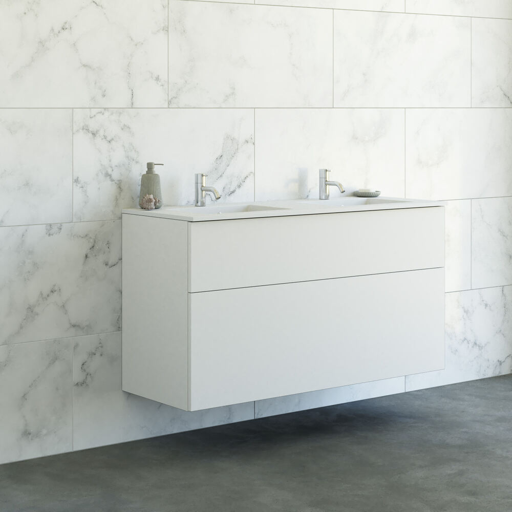 Tillsammans med skåpet ingår det dubbla tvättstället Minore i solid surface, ett modernt och slitstarkt material som är ett stilrent alternativ till porslin och marmor. Solid surface möjliggör ett lätt och luftigt uttryck med raka vinklar och mjuka, minimala rundningar. Tvättstället har en tunn, vit och matt yta som ger en ren och sofistikerad känsla.