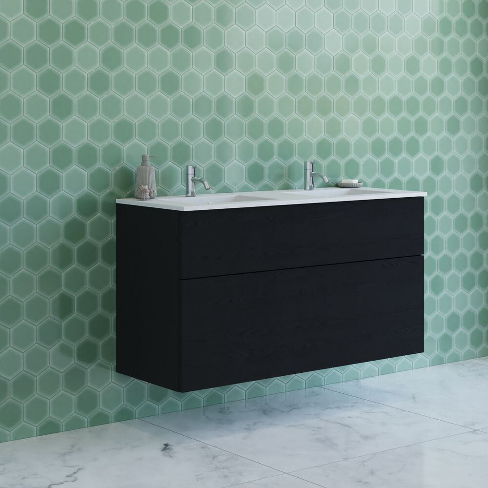 Dansk design, hög kvalitet och genomtänkt funktionalitet skapar en elegant och praktisk möbellayout med gott om utrymme. Minore dubbeltvättställ i kompositt har en matt och silkeslen yta som känns behaglig att använda. De två rymliga bassängerna gör det enkelt att använda handfatet samtidigt, medan den ultratunna bänkskivan bidrar till ett lätt och modernt uttryck.