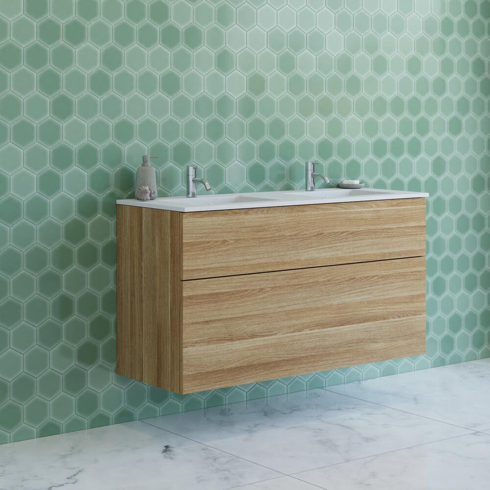Tvättställsskåpets två lådor, båda med metallgavlar, är fullt utdragbara och mjukstängande. De rymliga nedre lådorna ger plats åt handdukar, stora flaskor och stylingverktyg, medan de övre lådorna underlättar organisering av mindre föremål. Möbelpaketet levereras komplett för att göra beställning och montering smidigare. Det är den idealiska lösningen för familjer eller par som vill ha ett badrum där funktionalitet möter stilren dansk design.