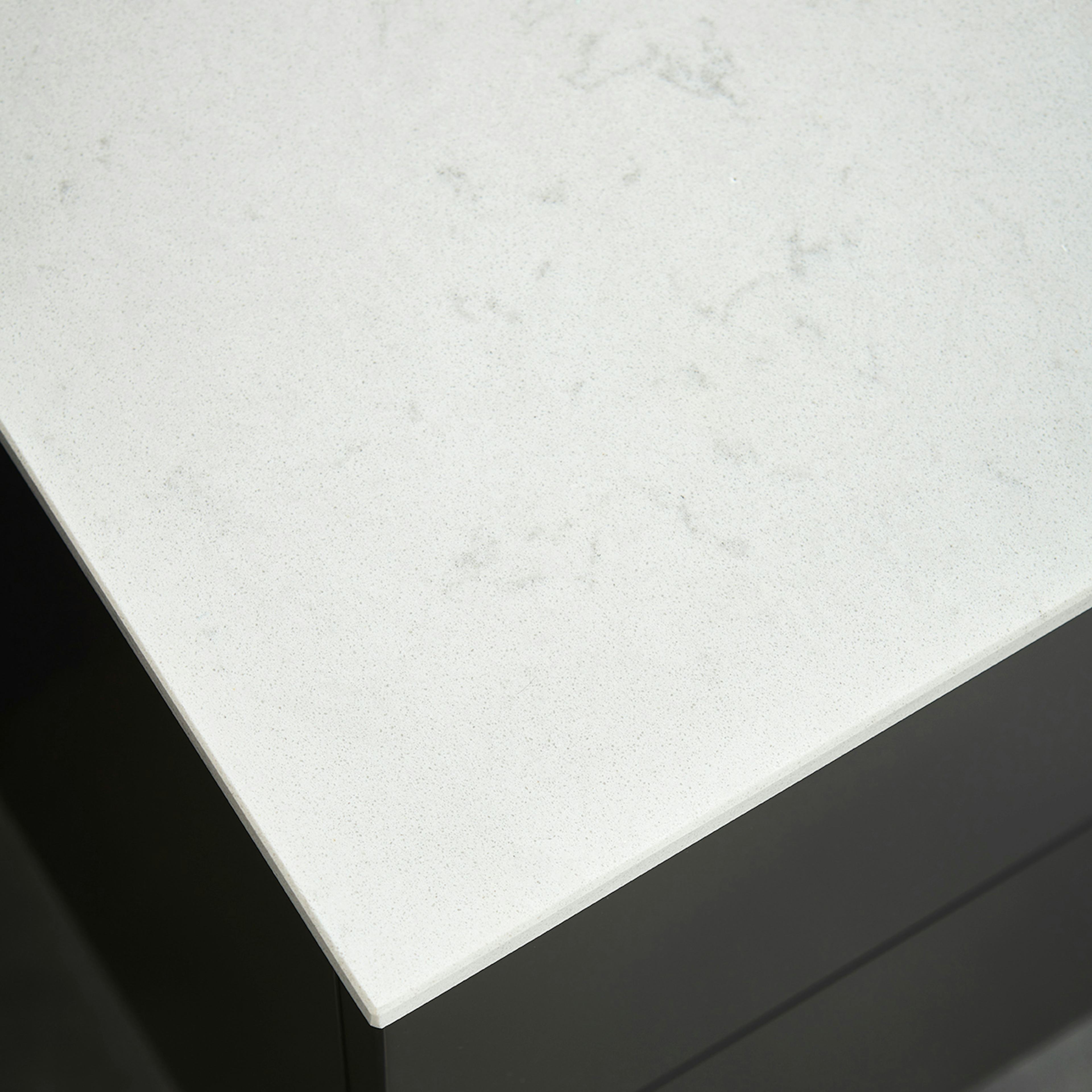 Tvättställsskåpspaketet har bänkskivor tillverkade av Silestone. Silstone består av tålig kvarts med vackra färger och strukturer. Bänkskivan för tvättställsskåpet har förborrade hål för enkelt tvättställ och tvättställsblandare och bänkskivan för sidomodulen levereras utan hål.