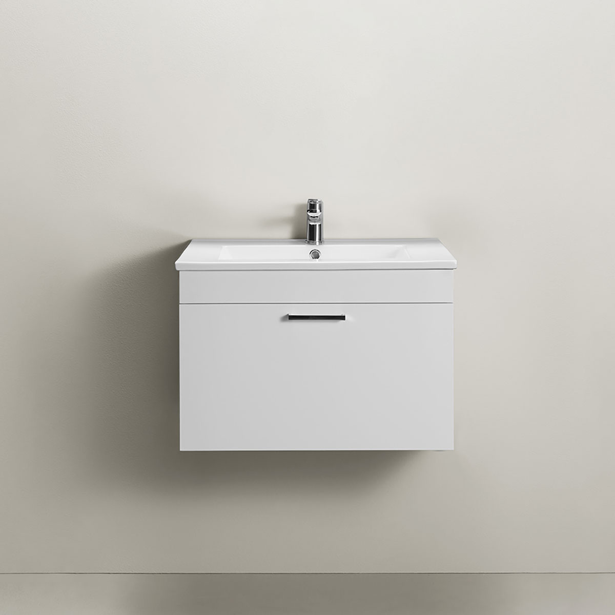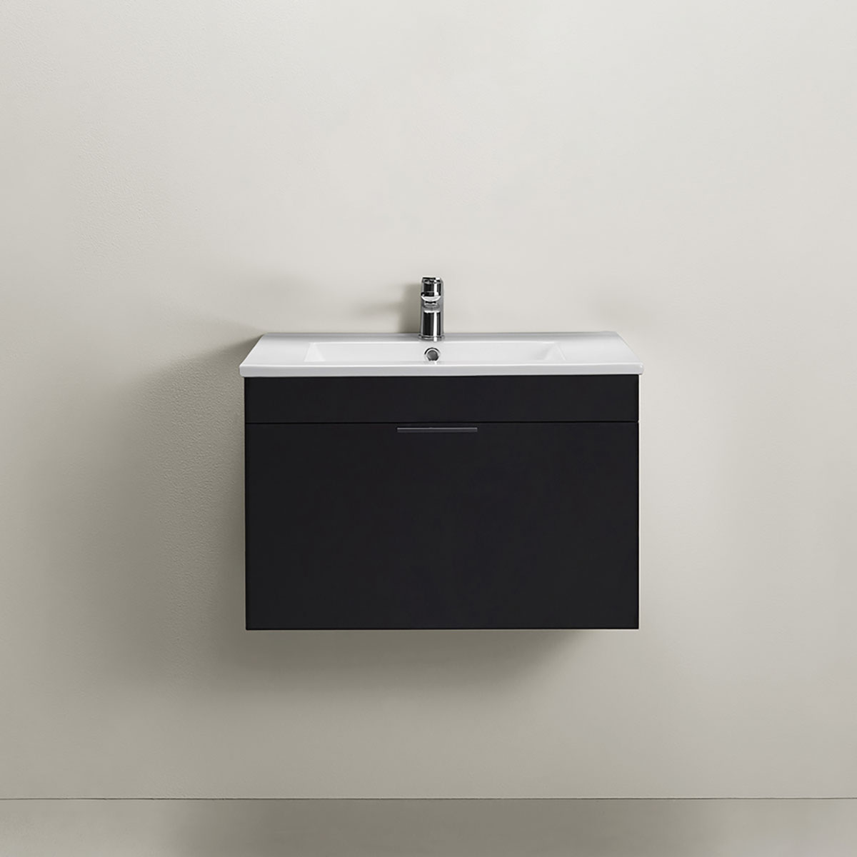 Tvättställsskåp med mjukstängande låda som ger generös förvaring inklusive nedsänkt tvättställ. Tvättställsskåpet är enkelt att installera för en person med skena på vägg.