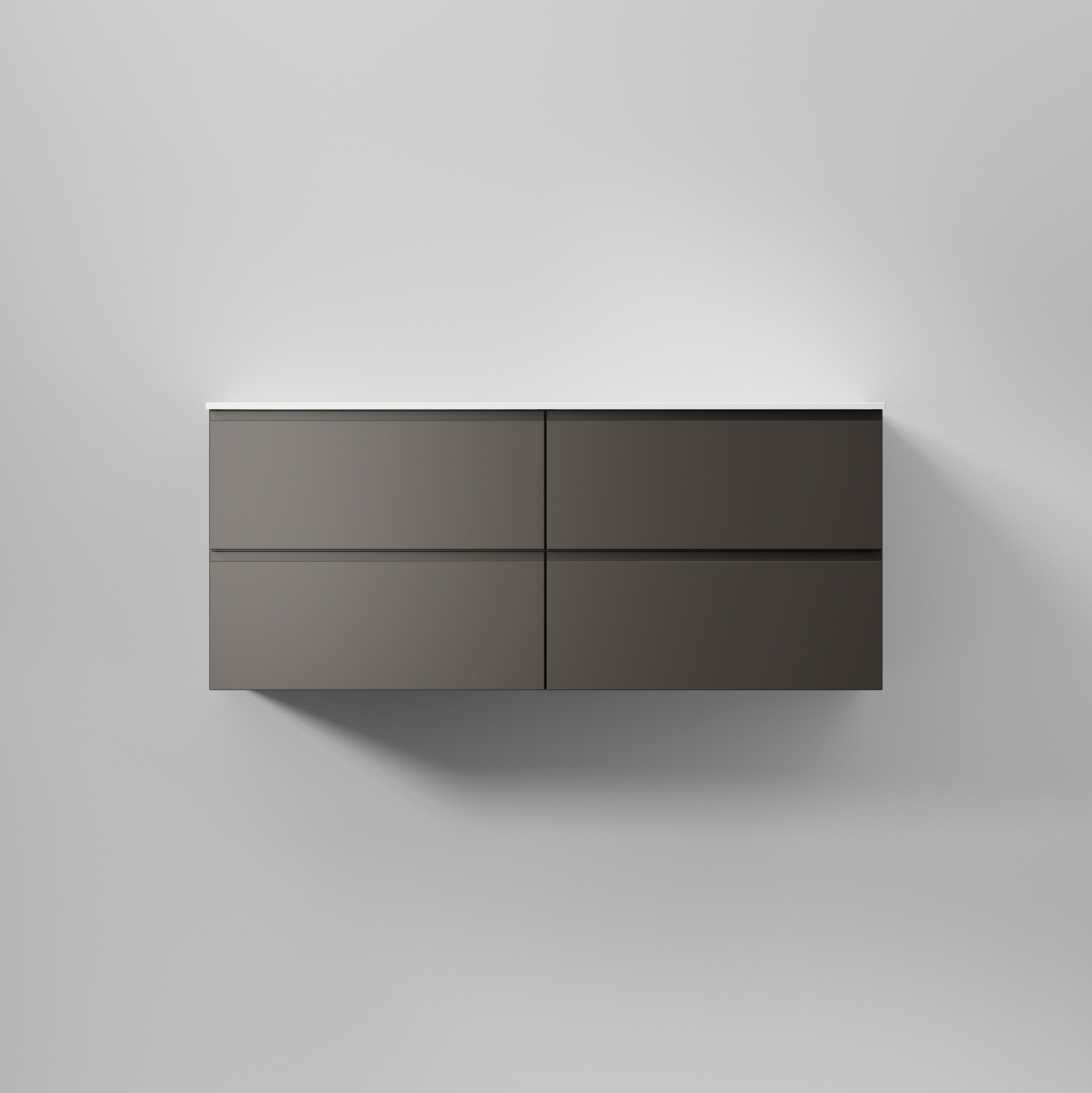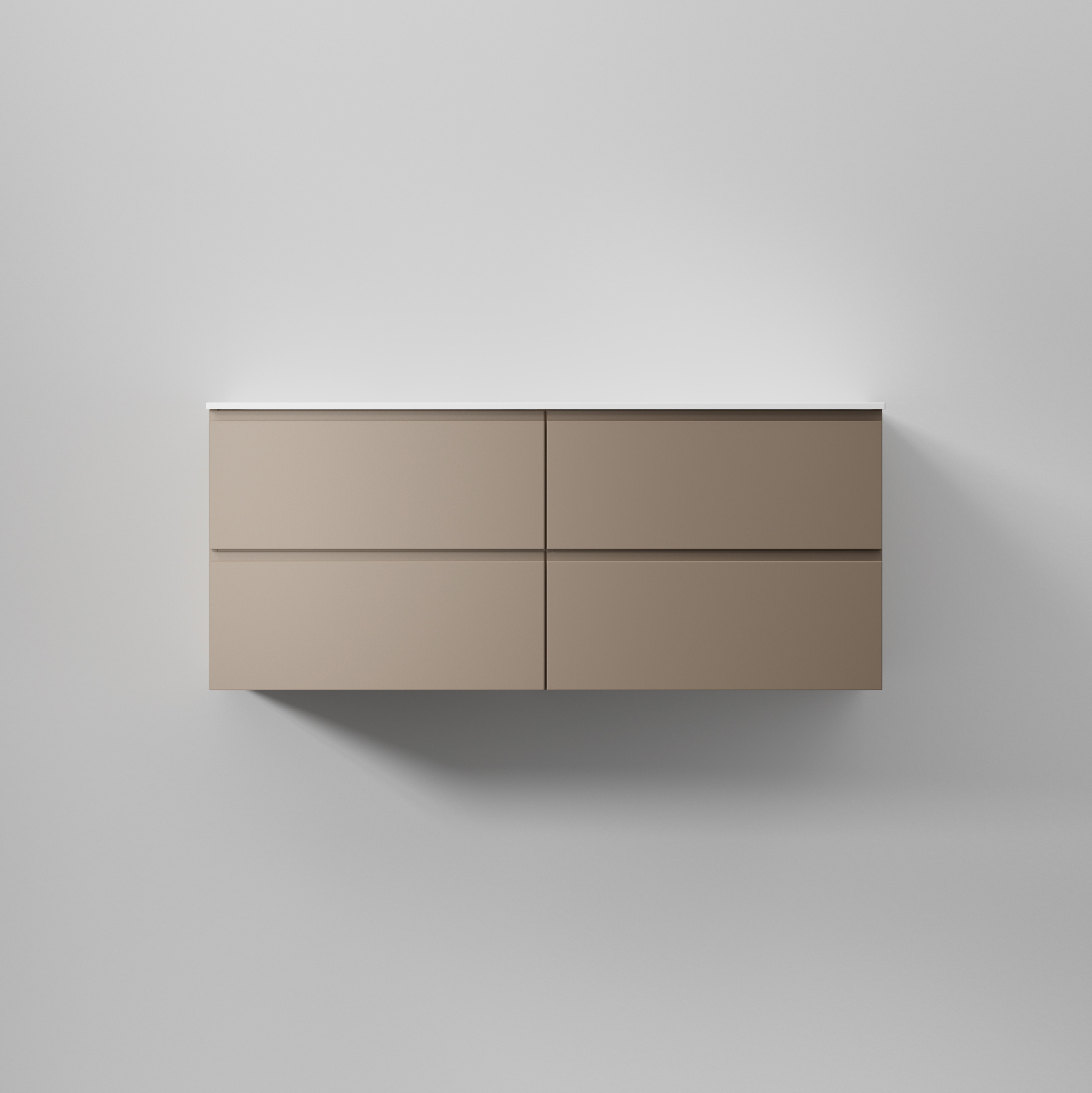 Välj mellan olika färger och storlekar. Komplettera din kommod med antingen ett dubbelt tvättställ i ett stycke eller en bänkskiva med två runda tvättställ. Välj till tvättställsblandare och bottenventil i din stil. För extra bekvämlighet kan du välja till sensorstyrd belysning, under och i övre låda som fadar upp när du kommer in i rummet samt dubbla eluttag.