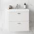 Skåpet med lucka har två mjukstängande luckor och ett flyttbart hyllplan inuti. Skåpet med lådor har två mjukstängande lådor.