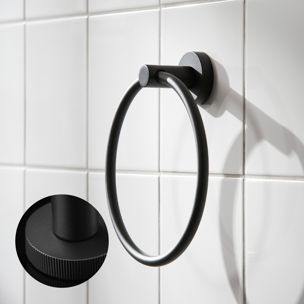 Handduksring från Miller Badrum. Väggplattans diameter är 45 mm.