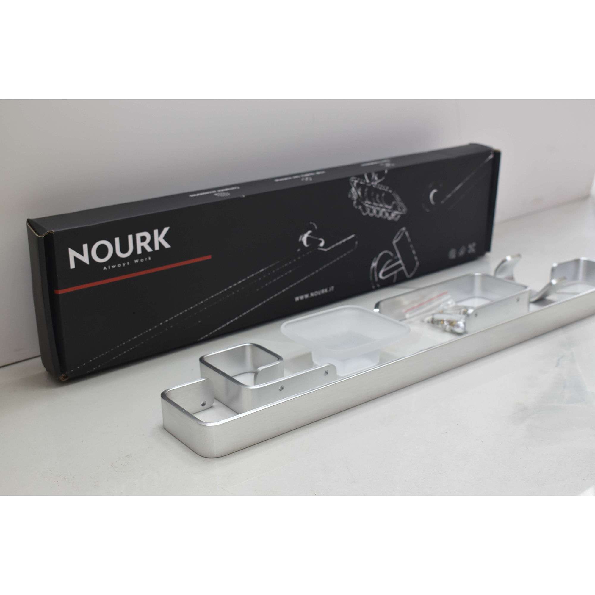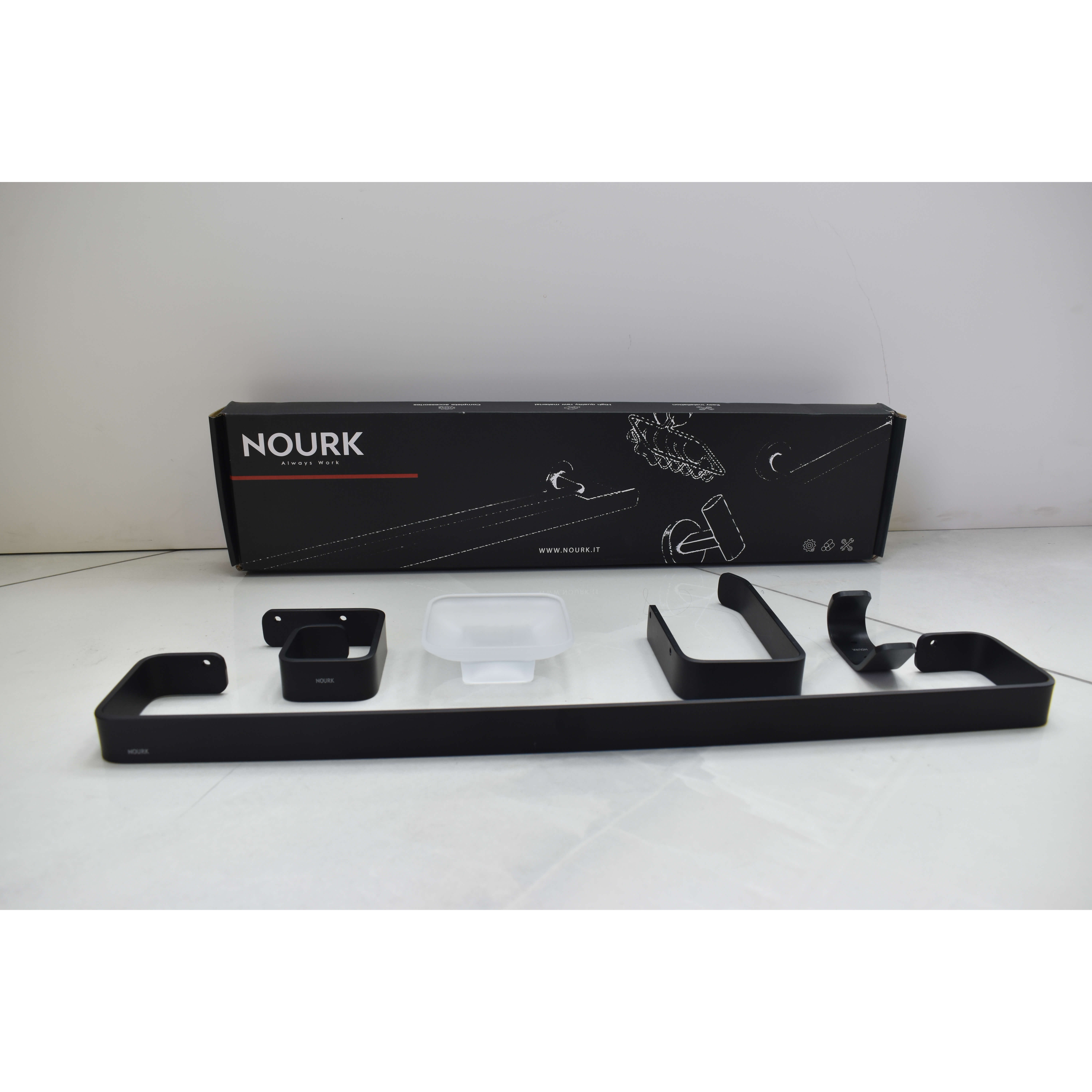 Badrumsset Nourk Badrumstillbehör Magical är en stilren och modern uppsättning med handkosk, tvålkopp, handdukstång och toalettrullehållare. Perfekt för att ge ditt badrum ett elegant och minimalistiskt utseende
