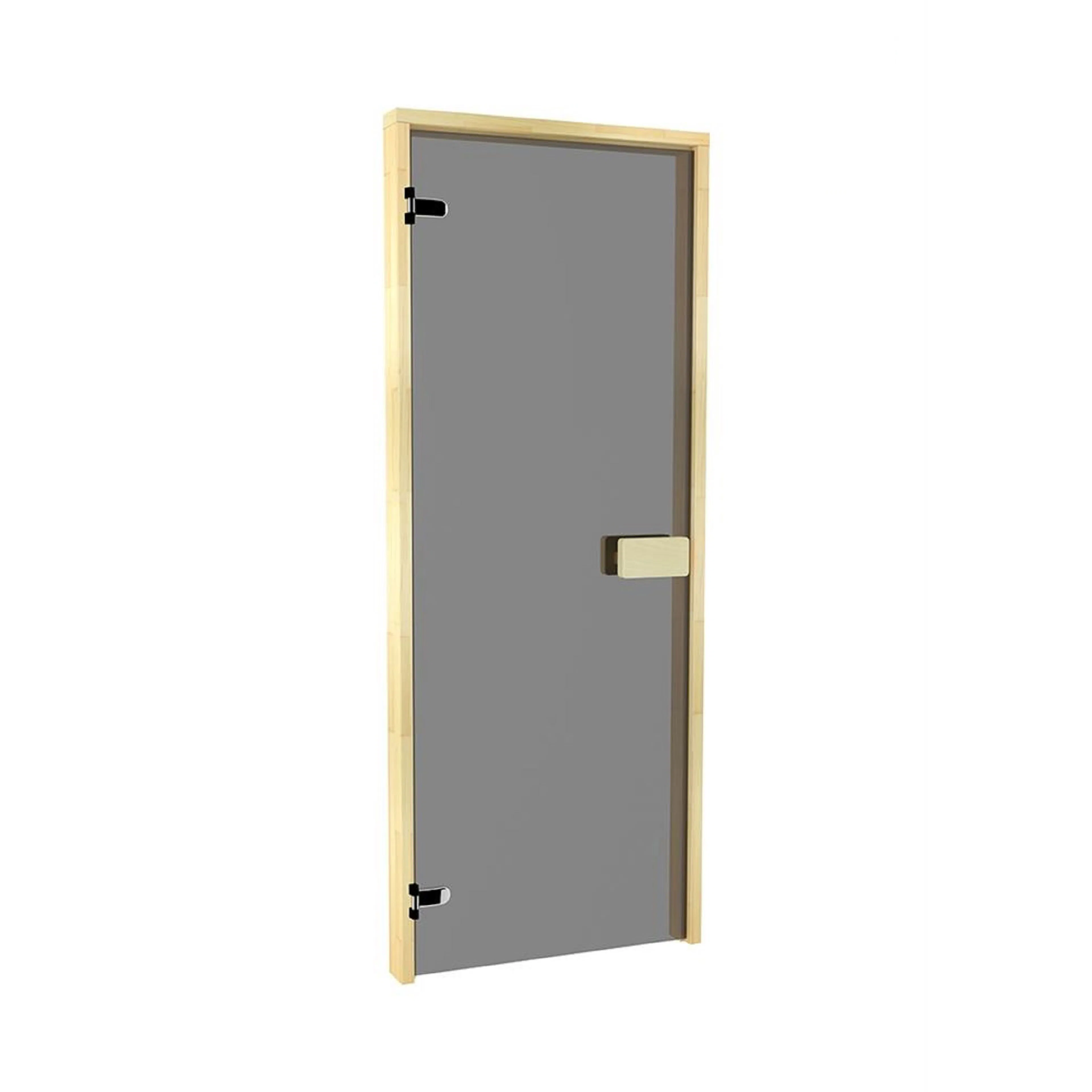 Bastudörr Classic, en fin glasdörr med stabilt handtag av furu. Karmen är tillverkad av fingerskarvad furu och dörrbladet består av 8mm härdat glas som är mycket slagtåligt.