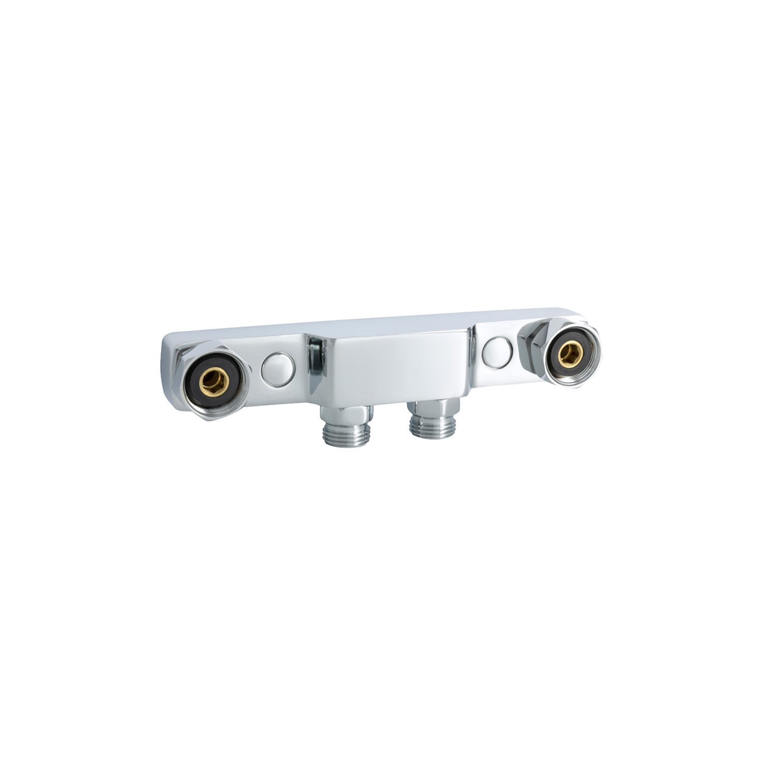 Blandarfäste för utanpåliggande rördragning med anslutningsrör i 40 cc. Tillverkad i mässing. Anslutning mot blandare M26x1,5 och anslutning till inlopp G15, för både plan- och kontätning. Modellen är vändbar. VVS-skruv och täcklock till skruvhålen ingår.