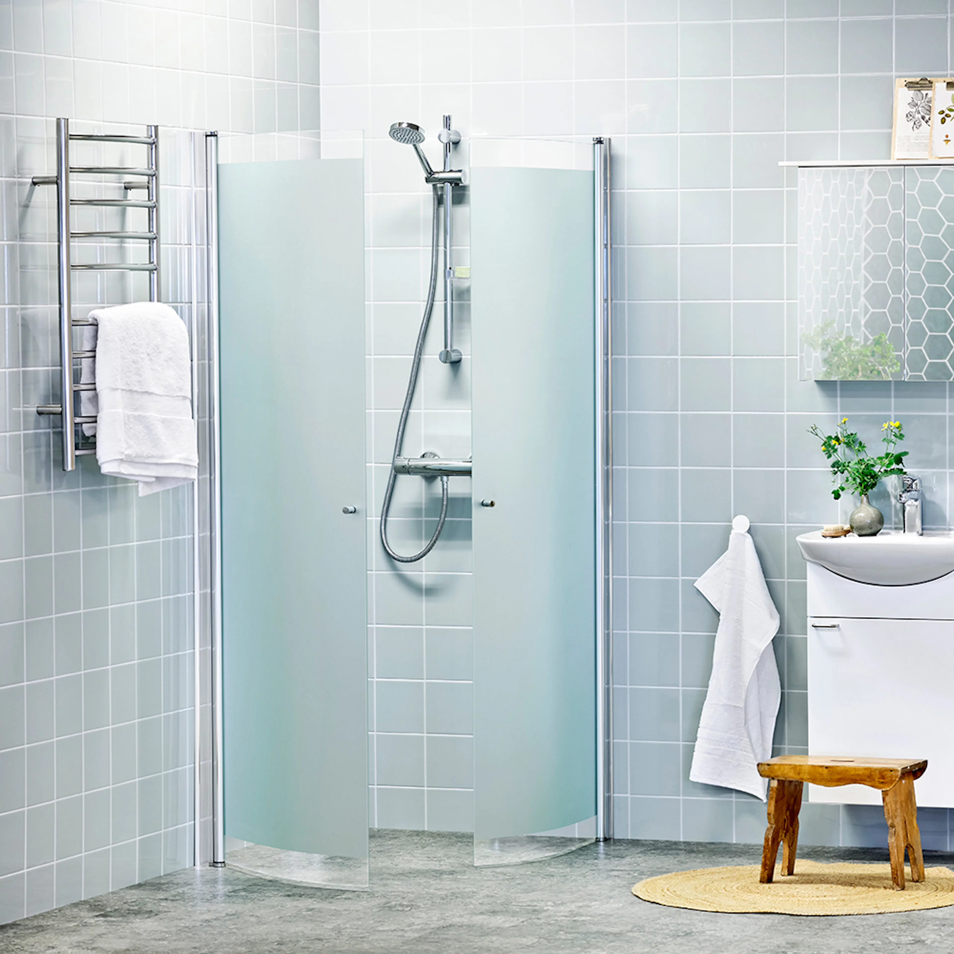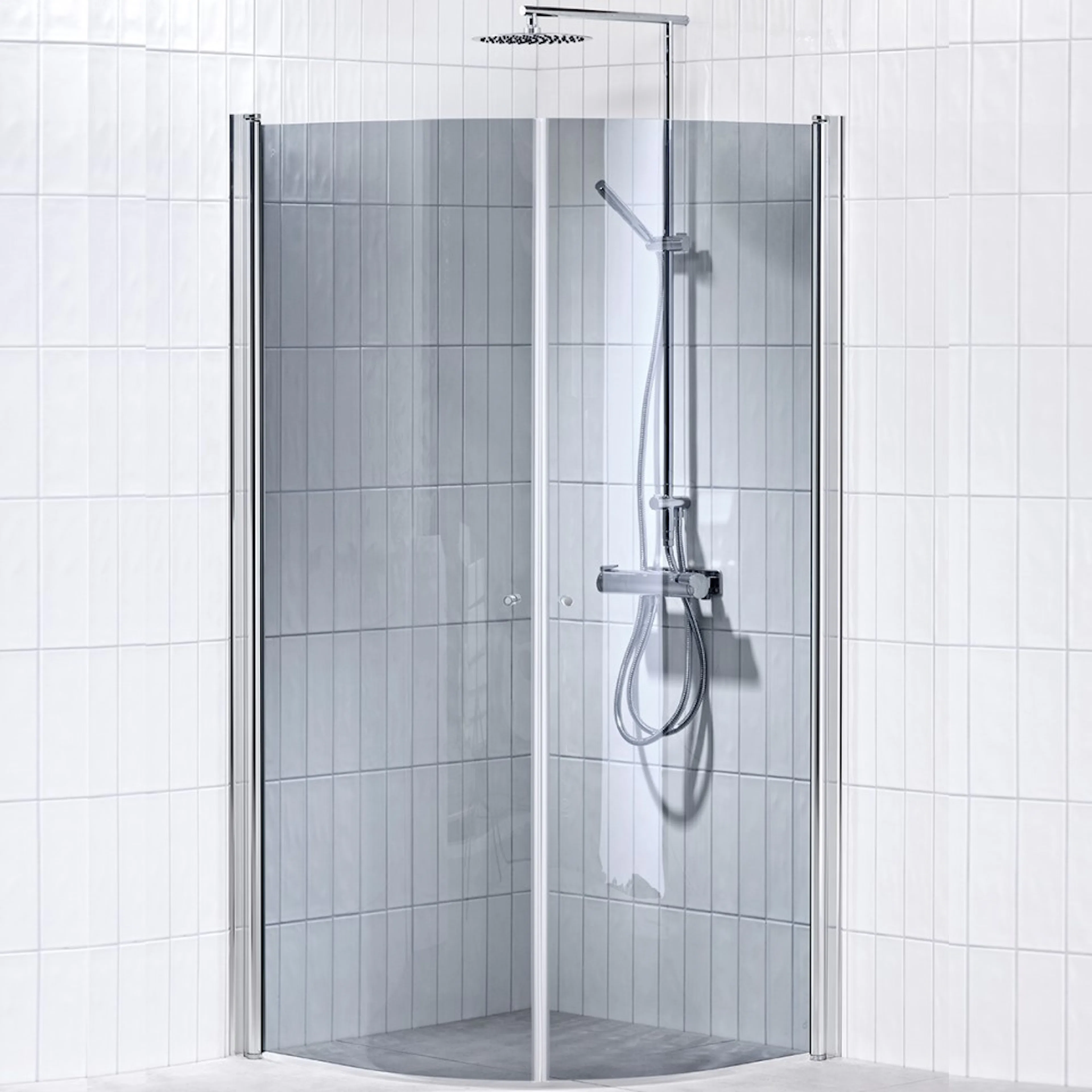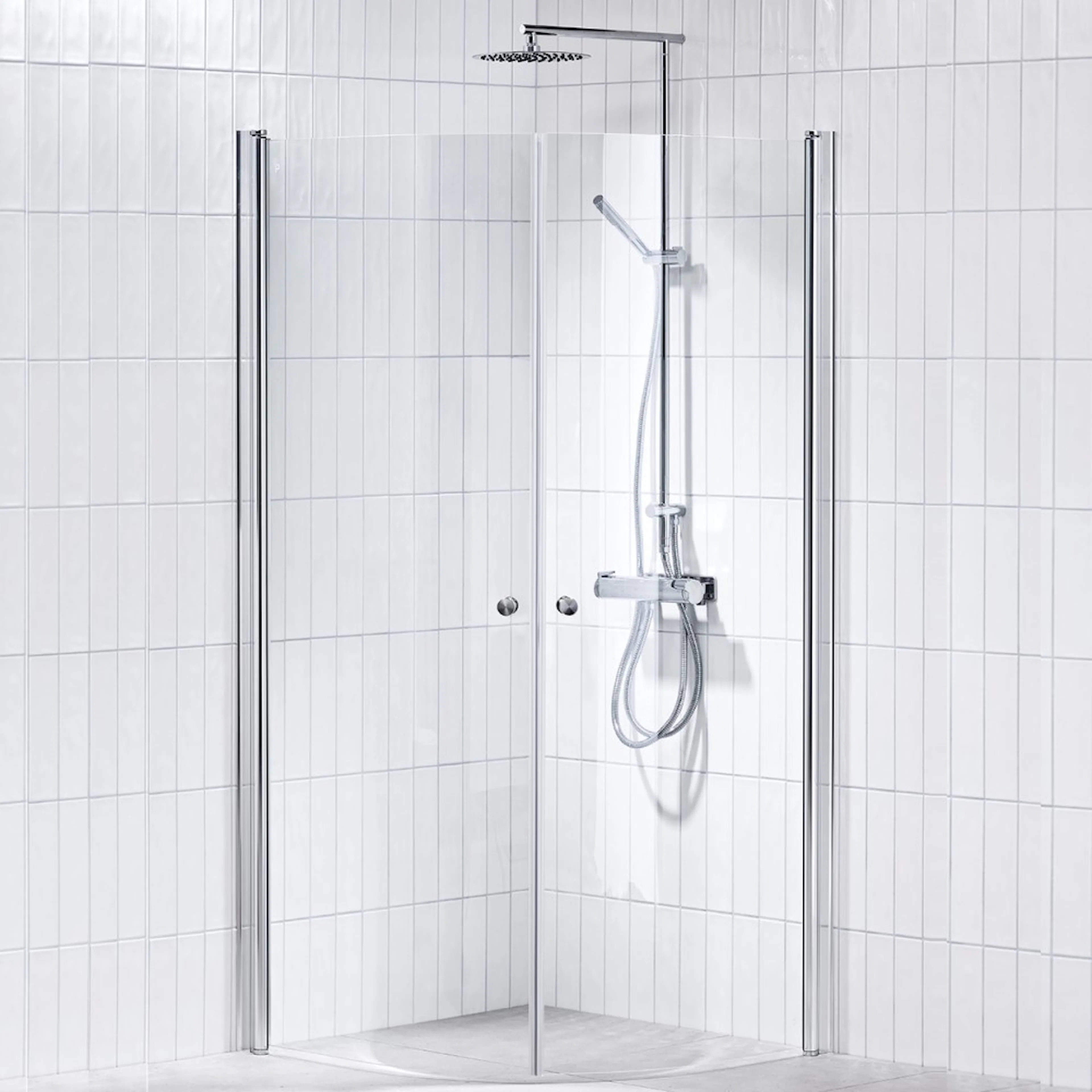 Duschhörn Alterna Picto Svängd är en elegant duschhörna med svängda och vändbara dörrar tillverkade i 6 mm härdat säkerhetsglas. Den stilrena och moderna designen gör att den passar in i de flesta badrum. Dörrarna har en svängradie på 180°, vilket ger bra med utrymme vid användning. När duschen står tom kan dörrarna dessutom enkelt fällas in mot väggen för att spara utrymme.