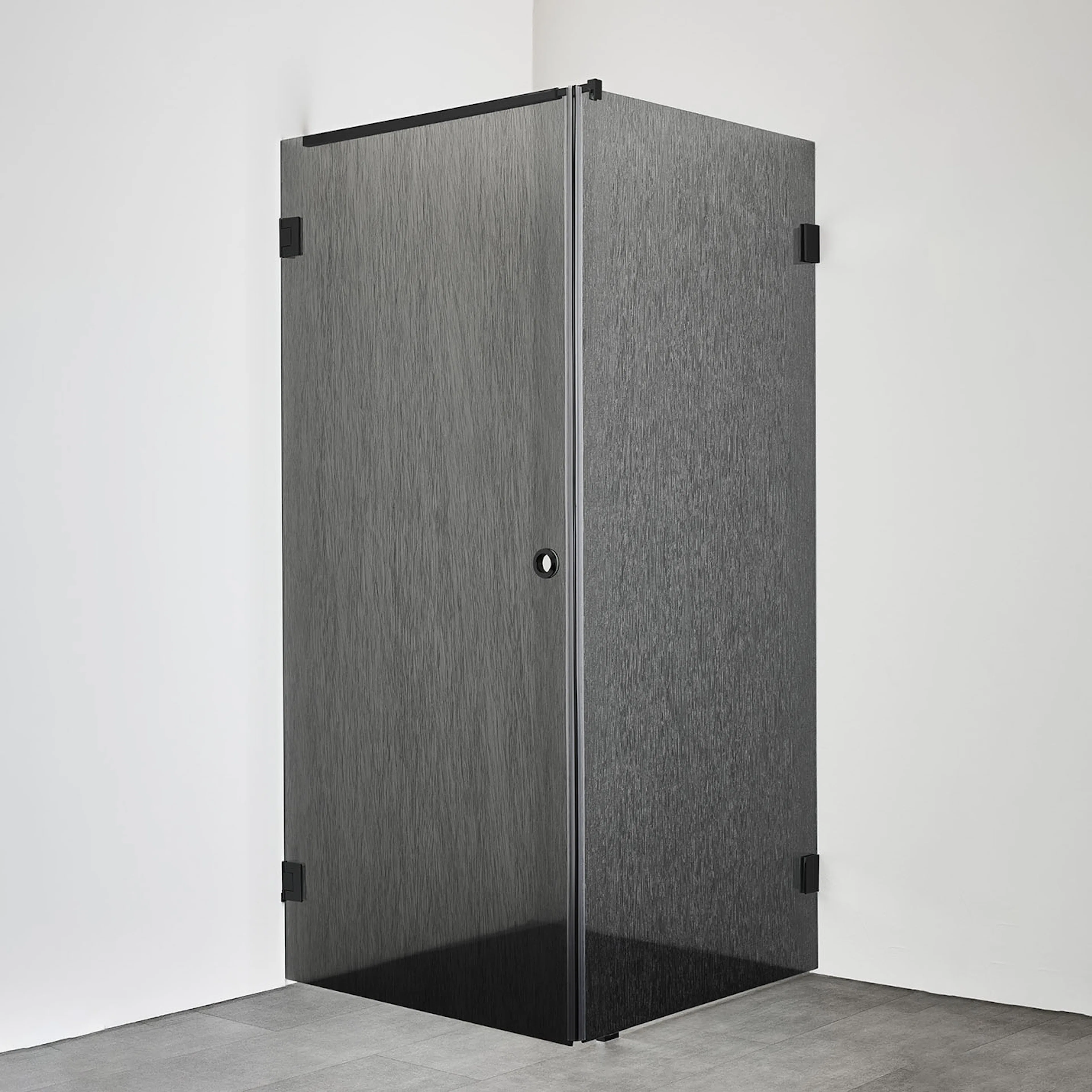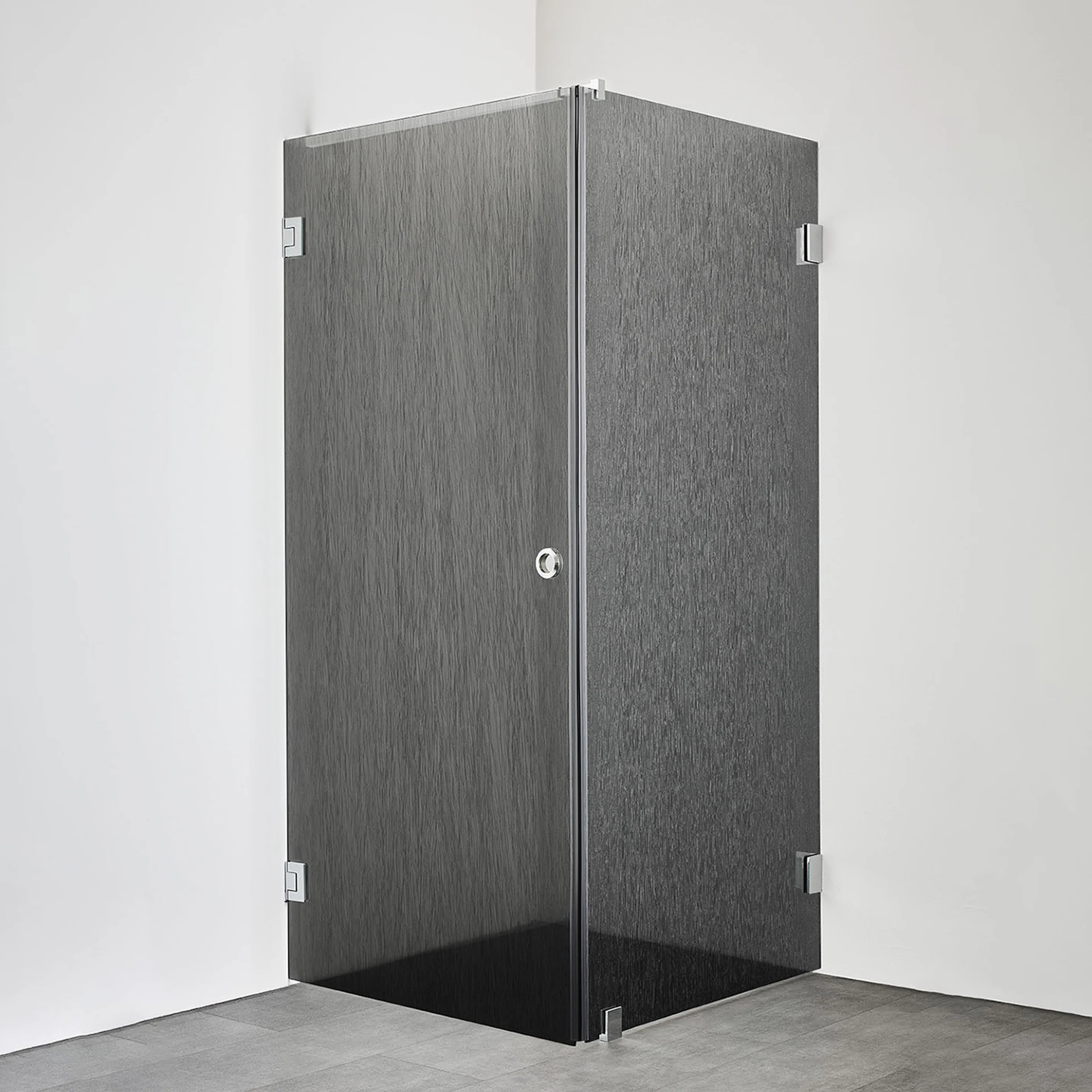 Exklusivt duschhörn med smäckra beslag och en elegant handtagslösning. Välj mellan tre färger – krom, matt svart eller borstad mässing – och mellan klarglas eller Lace glas med metallisk textileffekt. De stora glasytorna ger ett luftigt intryck och skapar en härlig rymd i badrummet. Duschhörnet består av en fast vägg och en öppningsbar dörr. Dörren och väggen är vändbara så du kan välja om dörren skall placeras till höger eller vänster.