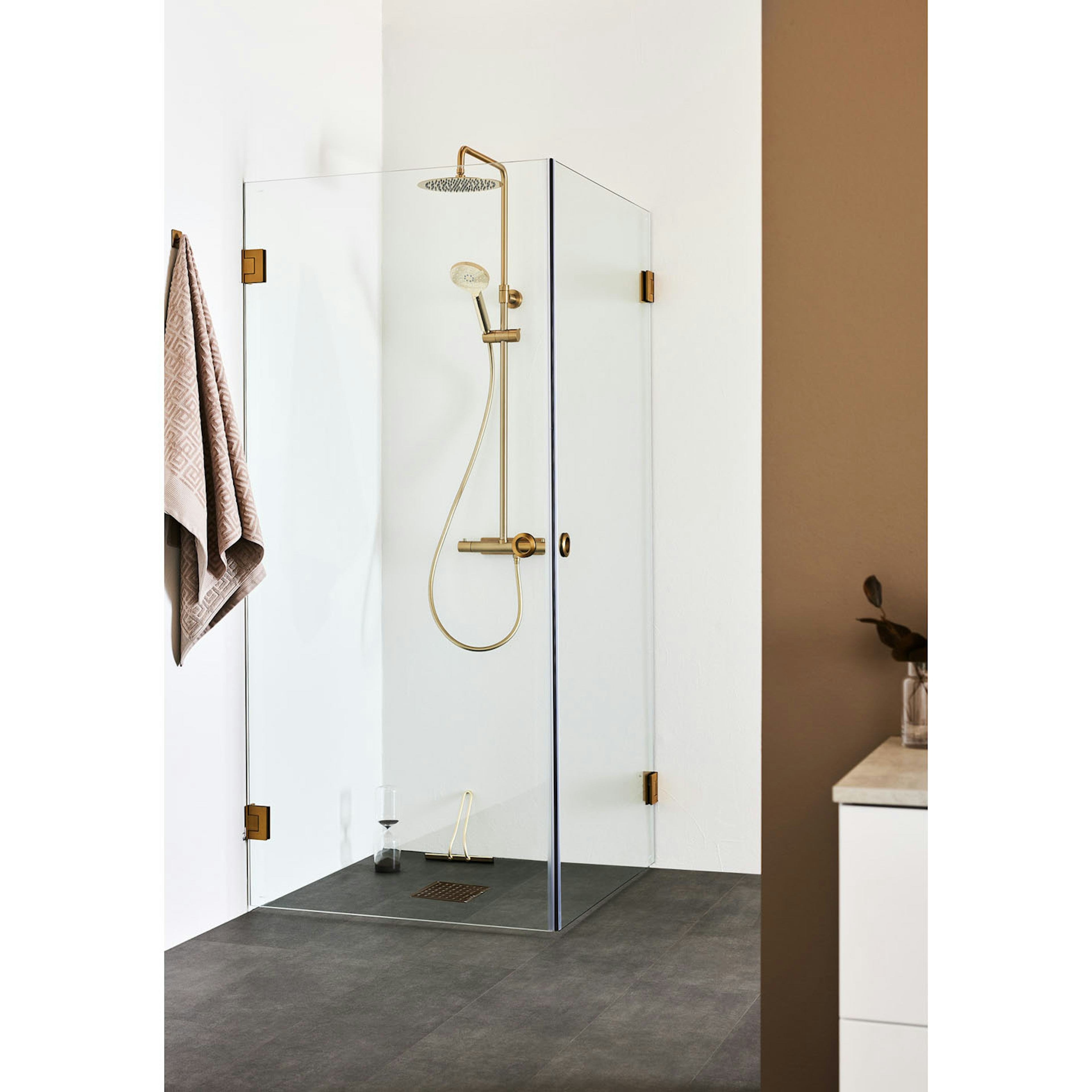 Duschhörn Hafa Infinity är ett exklusivt duschhörn med smäckra beslag och en elegant handtagslösning. Välj mellan tre färger, krom, mattsvart eller borstad mässing. De stora glasytorna ger ett luftigt intryck och skapar en härlig rymd i badrummet.