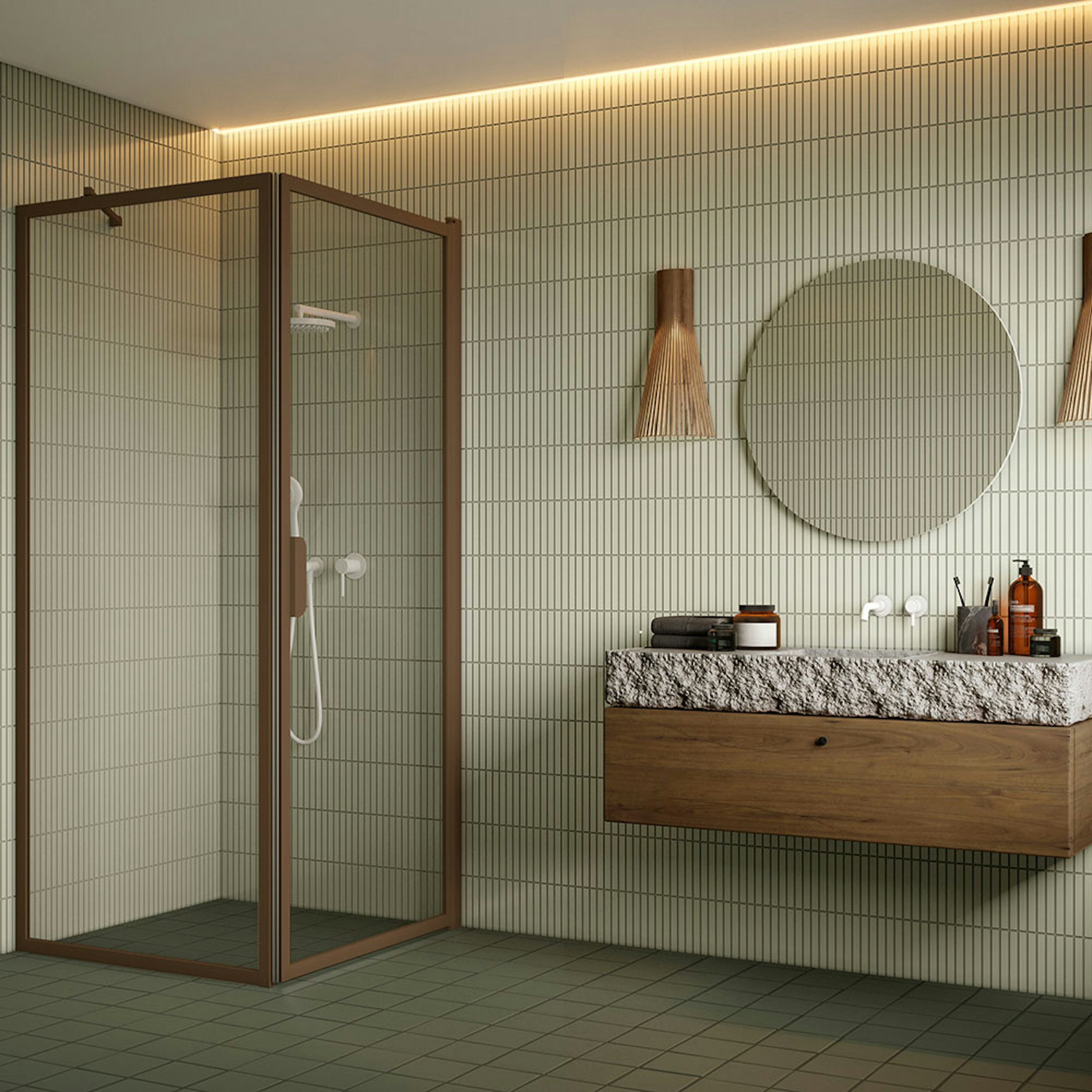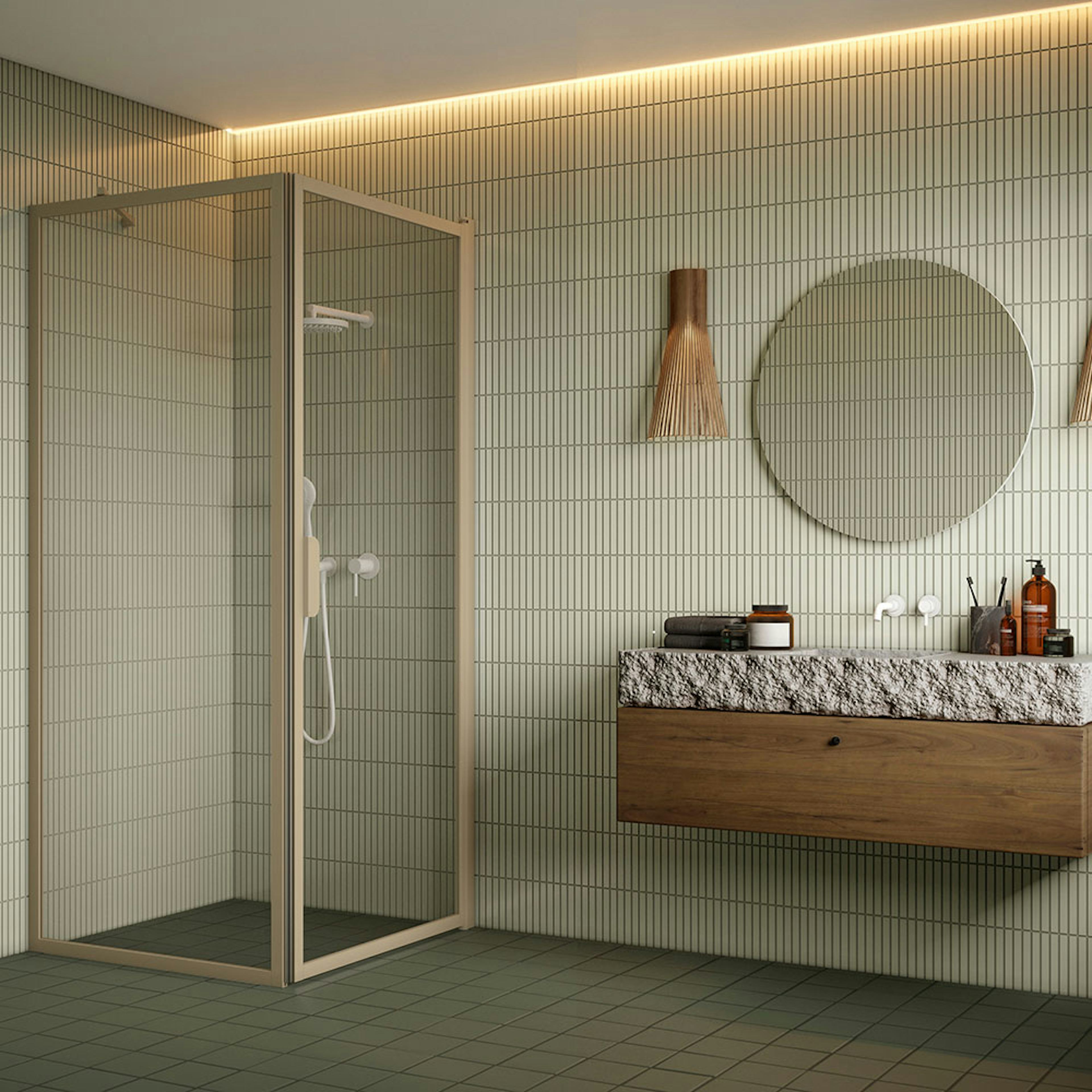 Duschhörn HietakariBläk 755 New York Fast Vägg och Vändbar Dörr819 Fast Vägg (L1) x 717 Vändbar Dörr (L2) mm, Reeded, Sand Profiler