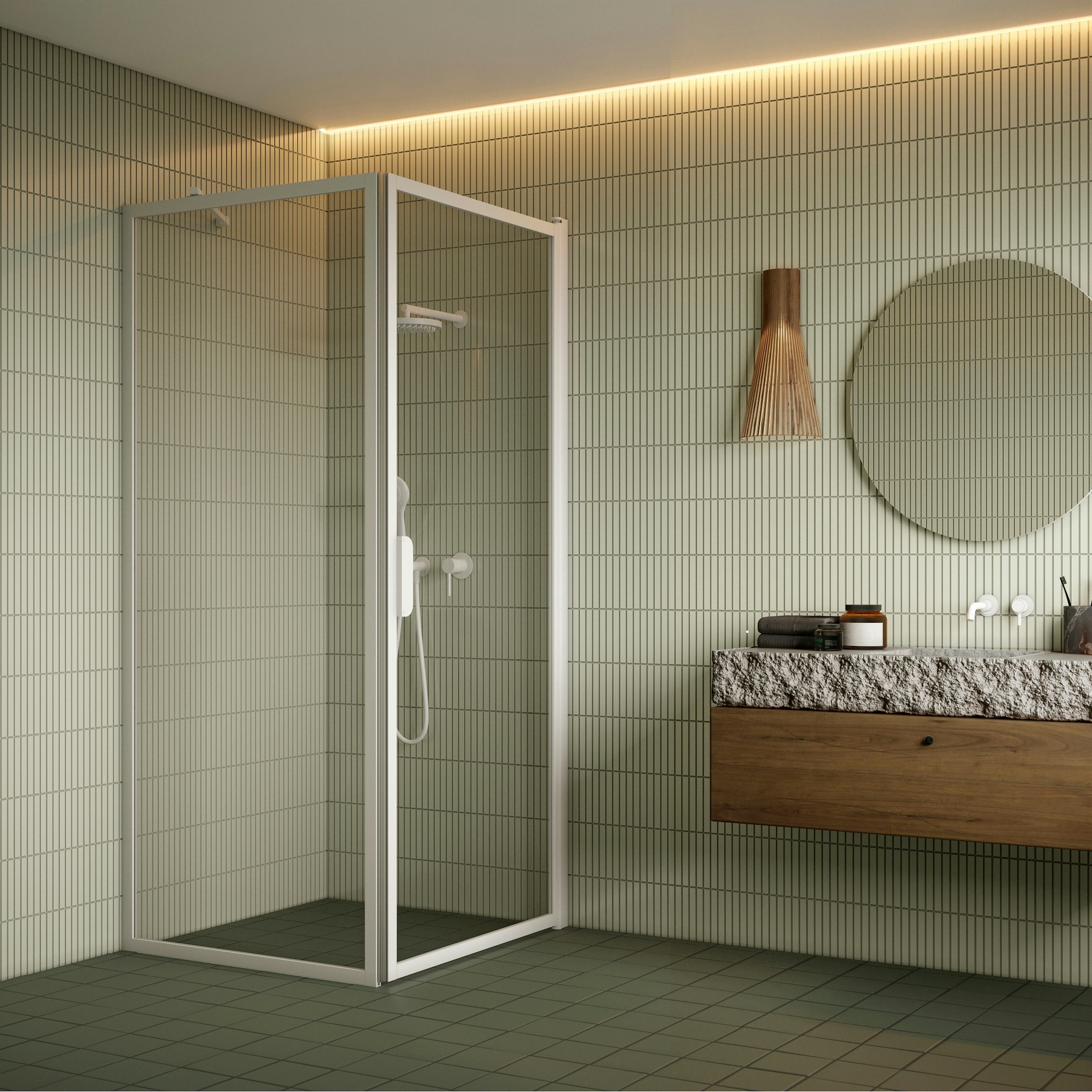 Den fasta delens profiler för väggfäste har 7 mm justeringsmån och dörrens profiler för väggfäste har 15mm justeringsmån. Justeringsmånen kan utnyttjas för kompensation av en eventuell lutning i väggen eller för ökning av duschväggens bredd från det angivna måttet. Den ena eller båda sidornas bredder kan ökas ytterligare med en 34 mm (dörr), 40 mm (fast vägg) breddningsprofil (tilläggsutrustning). Breddningsprofilen kan skåras för genomdragning av ytvattenrör.