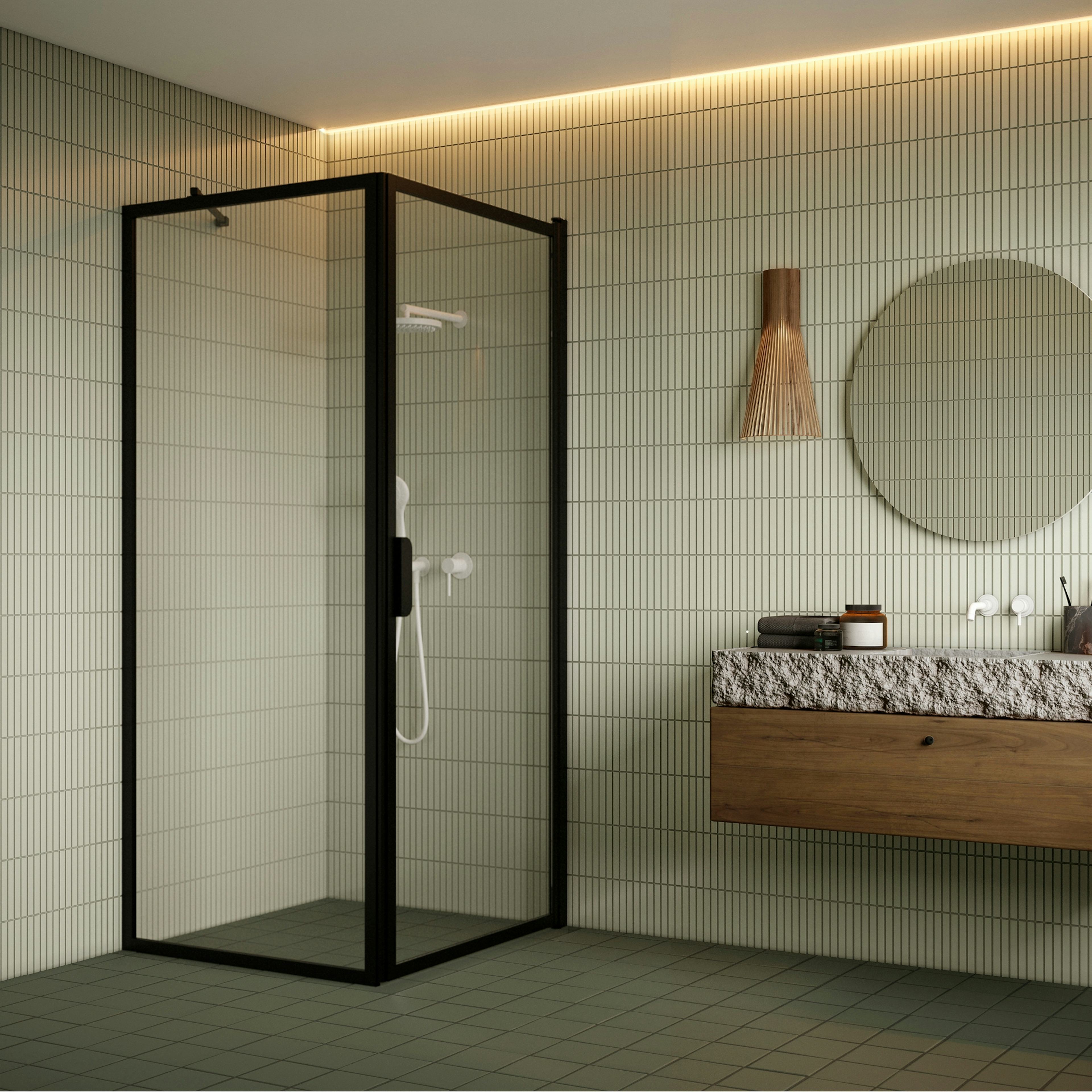 Duschhörn Hietakari Bläk 755 New York består av en fast vägg och en vändbar duschdörr i industriell stil. Den fasta väggen förses med en golvlist som har 7 mm höjdtolerans, golvlisten monteras i golvet under duschpanelen. Ifall högre lutning finns bör produkten beställas med justeringsfot, då sockeltätning tillkommer. Även sockeltätningen skyddar effektivt mot vattenstänk. Duschväggen hålls stabil tack vare det sneda sidostaget. Istället för det sneda sidostaget, kan man välja duschväggen med ett långt sidostag, som installeras i 90 graders vinkel, finns att välja som tillval. Den vändbara duschdörren skyddar effektivt mot vattenstänk då den monteras med en tillkommande släptätningslist. Duschdörren förses med justerbar centrering och är försedd med lyftgångjärn.