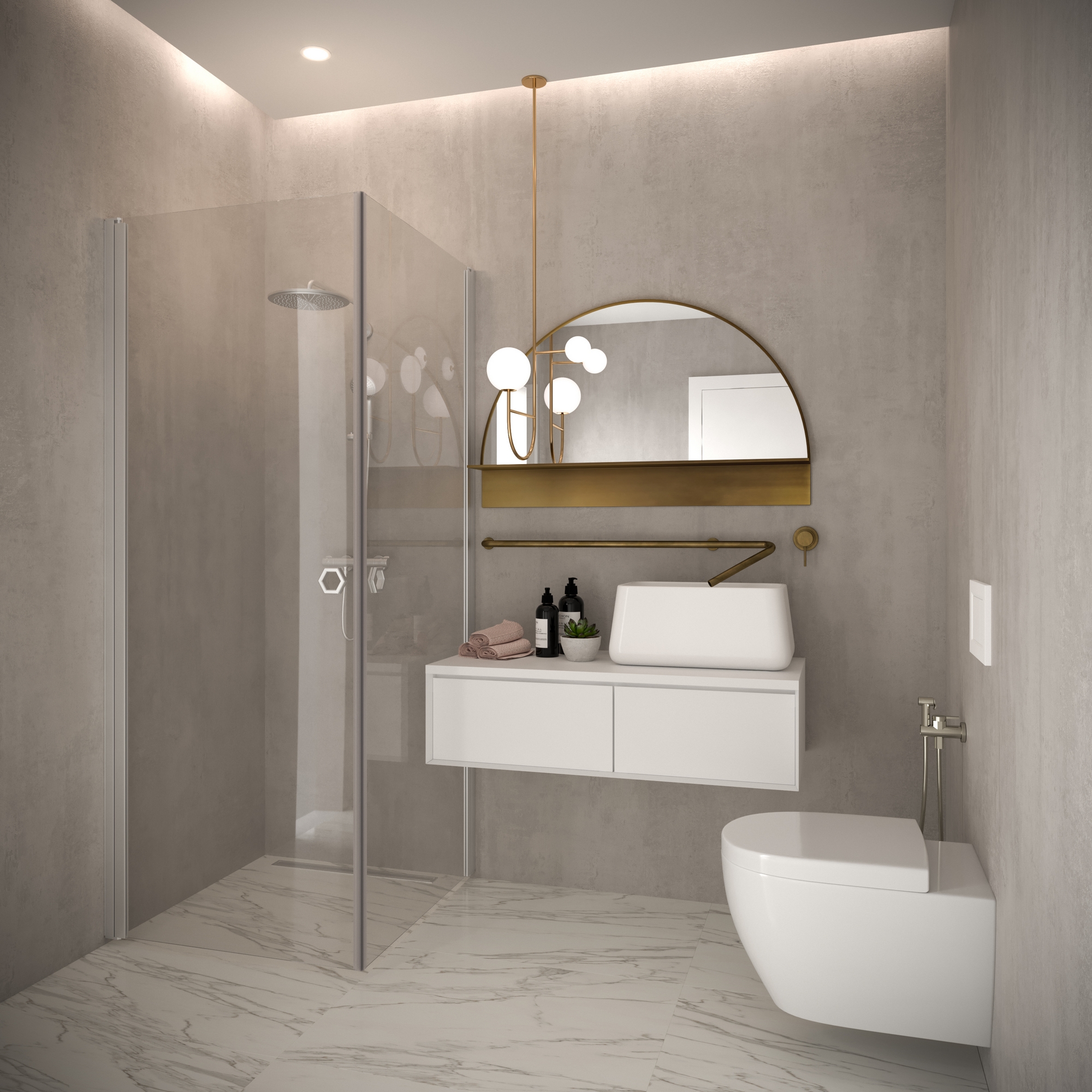 När duschen inte används kan duschdörrarna vändas mot väggen. Dörrarna vänds 90 grader i bägge riktningarna och förses med justerbar centrering. Centreringen strävar efter att återställa duschväggen till öppen respektive stängd position. Dörren är försedd med lyftgångjärn.