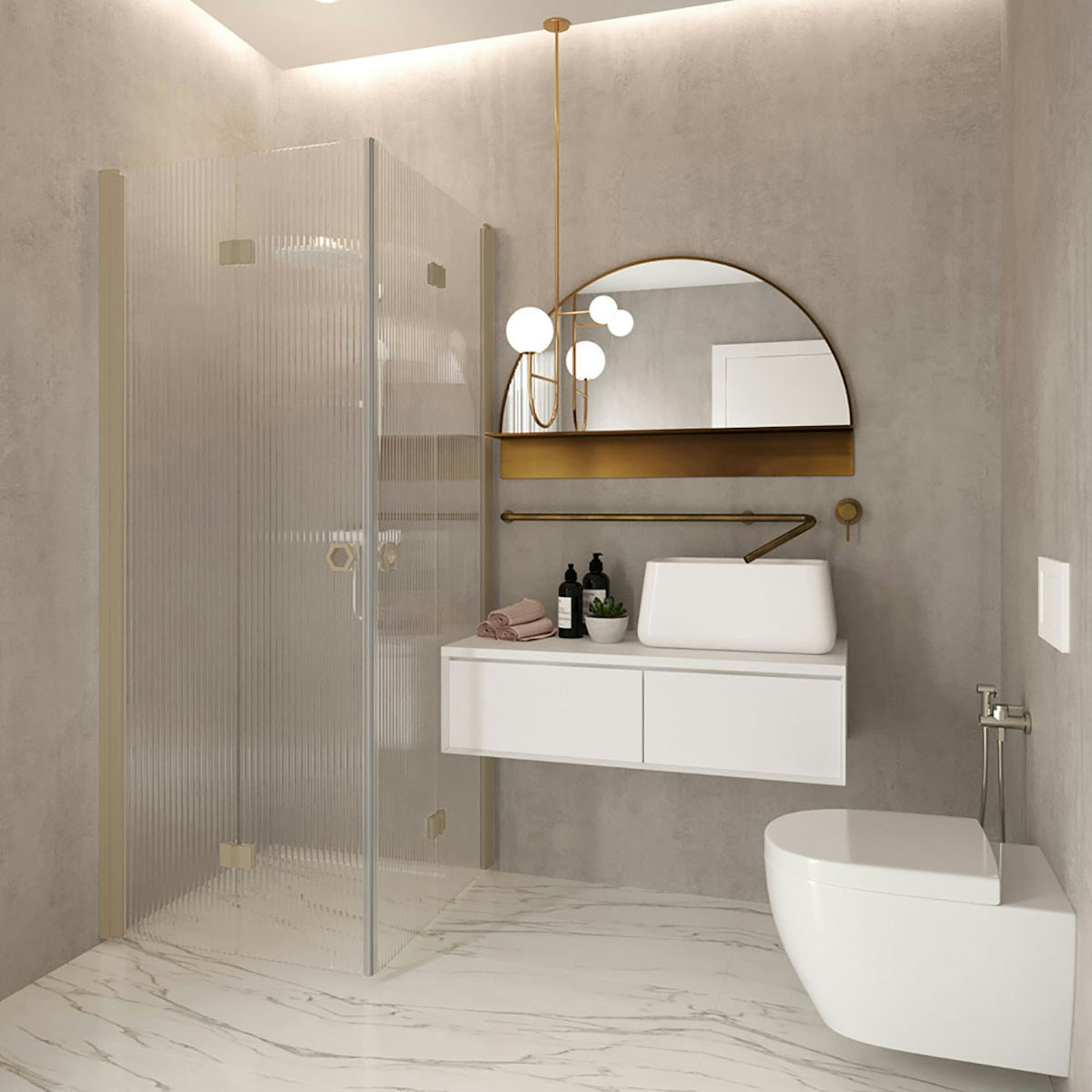Duschdörrarna finns att välja i olika utförande. Klarglas är jämn till ytan och genomskinlig. Reeded - glaset består av parallella linjer vilket suddar ljuset så att figuren bakom inte är helt tydlig. Satinglaset är suddigt och detaljer kan inte ses genom glaset. Ena sidan av satinglaset är sammetslik etsad medan andra sidan är jämn. Vid val av satinglas, bör beaktas att etsade sidan är ömtålig för repor och fläckar.