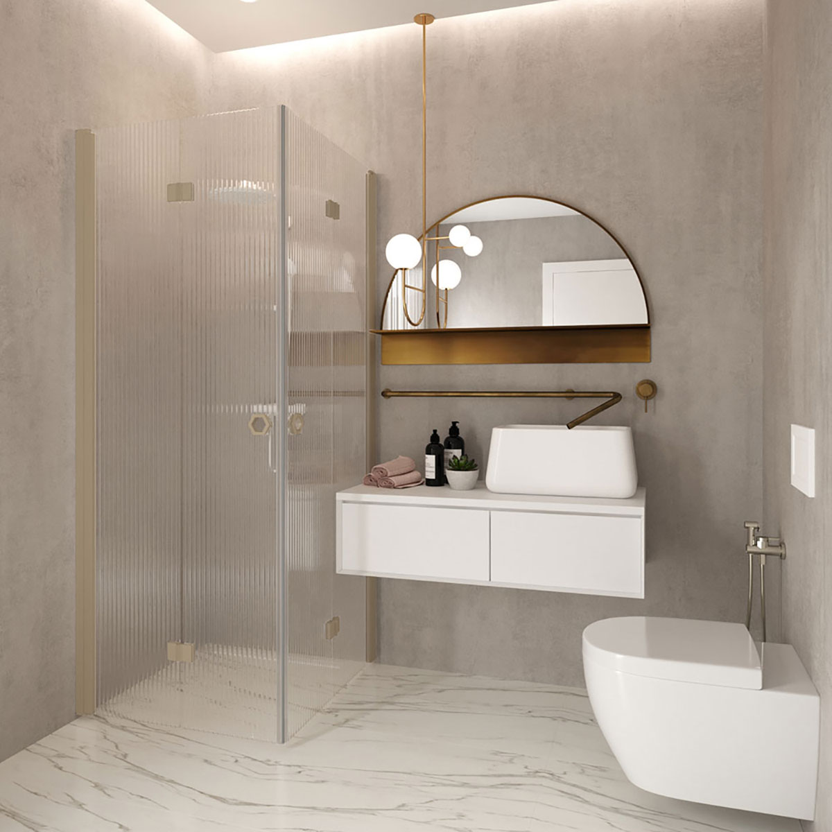 När duschen inte används kan duschdörrarna vändas och vikas ihop mot väggen. Duschdörren vänds 90 grader i bägge riktningarna och förses med justerbar centrering. Centreringen strävar efter att återställa duschdörren till öppen respektive stängd position. Dörren är försedd med lyftgångjärn.