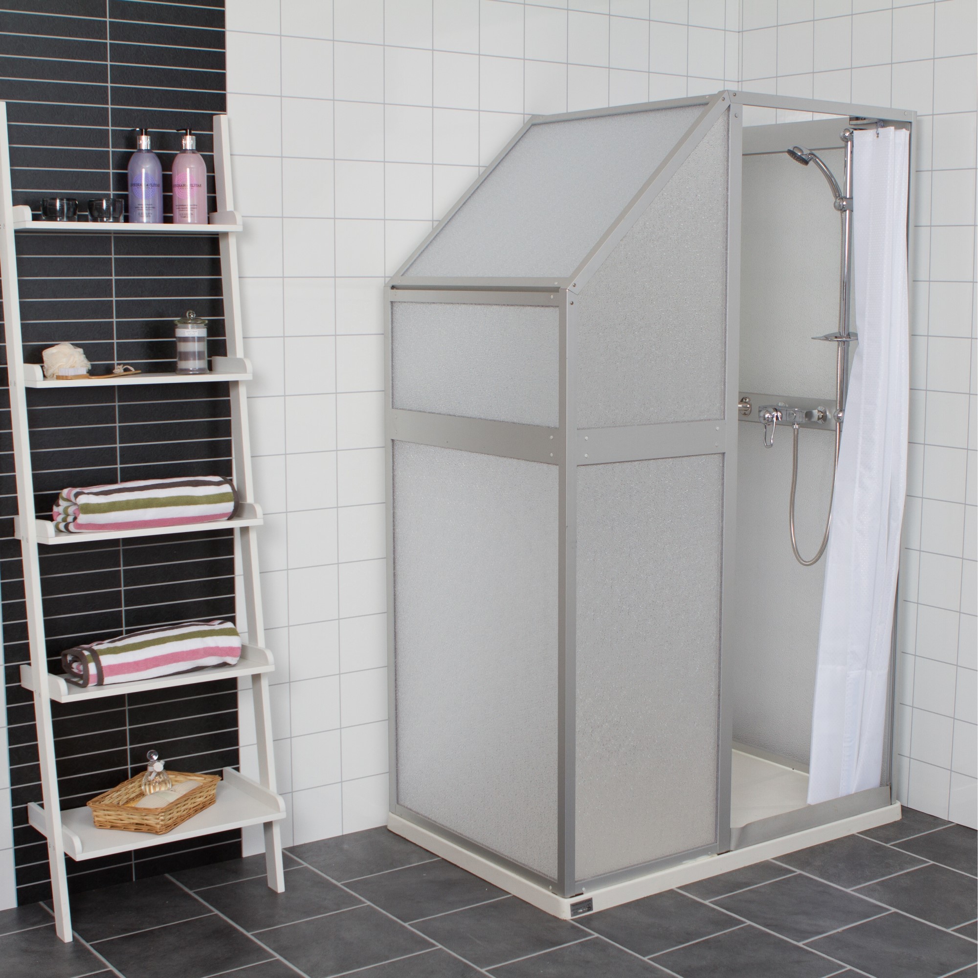 Duschkabin Duschrum Snedtak från Västia är ett snedtaksanpassat duschrum med 45° taklutning och en fast glasfront som är en snygg och smidig lösning framtagen för badrum med lutande innertak. Duschlösningen är en svensktillverkad kvalitetsdusch med lång livslängd. Det låga insteget gör att det är lätt att ta sig i och ur duschen. Kabinen kan även kombineras med ramp. Den stora öppningen på duschen gör det enkelt för den som behöver hjälp vid dusch. Med ett kraftigt profilsystem och väggar i stöttålig styren är duschen extra stabil. Används även för bostadsanpassning.