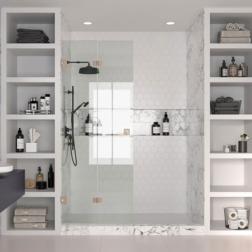 Duschdörr Hietakari Vetro 513 är en vikbar duschdörr som passar utmärkt när man önskar minimaliskt intryck till badrummet. Duschdörrens gångjärn fästs rakt vid väggen och monteringshöjden kan väljas fritt. När duschen inte används kan Duschdörren vändas och vikas ihop mot väggen. Duschdörren vänds 90 grader i bägge riktningarna och förses med justerbar centrering. Genom att montera produkten nära golvet och genom att fästa en släptätning (standard) under glaset kan vattenflödet begränsas.
