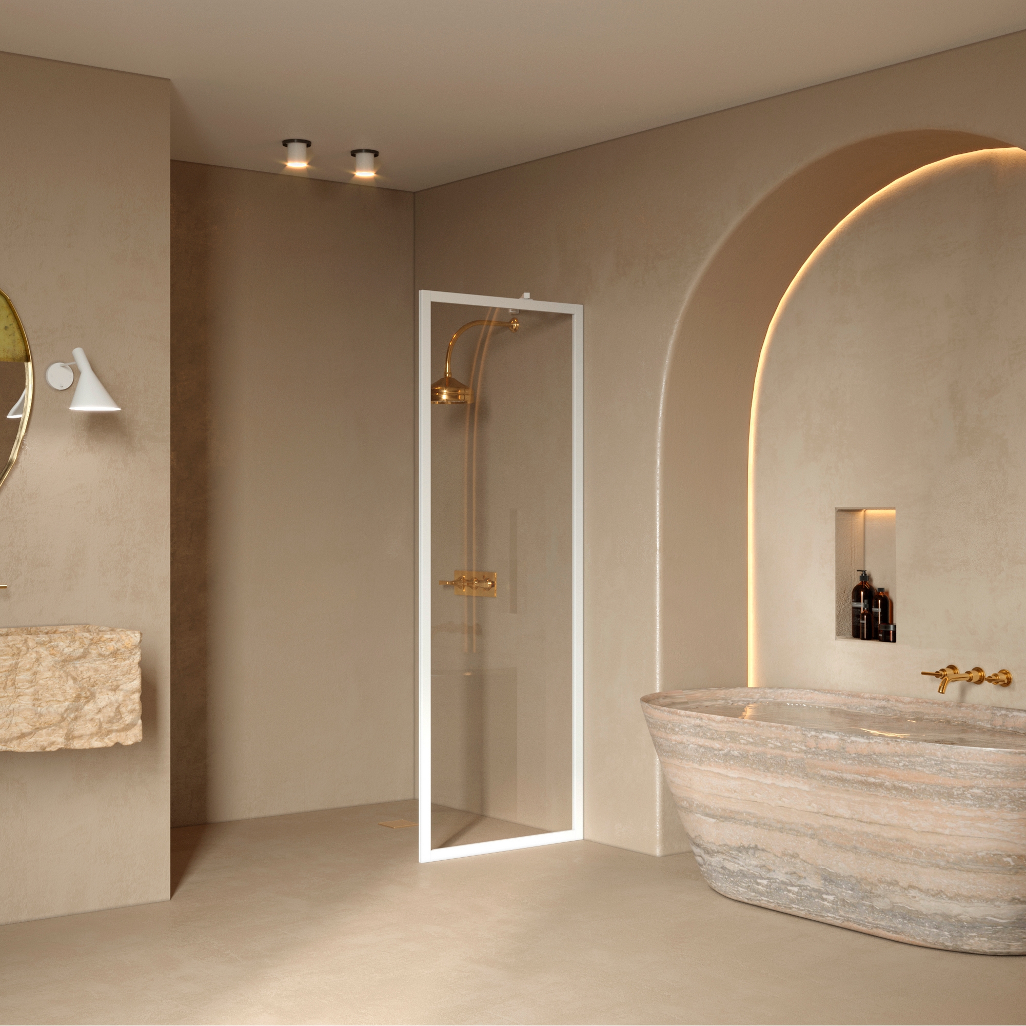 Väggfästena skruvas in i byggnadens vägg. Den fasta duschväggen är fastsatt på väggfästena med självborrande skruvar. Stödstången sätts upp från den övre kanten av den fasta panelen och skruvas in i byggnadens vägg. En sockeltätning kan fästas på duschväggen för att förbättra vattentätningen.