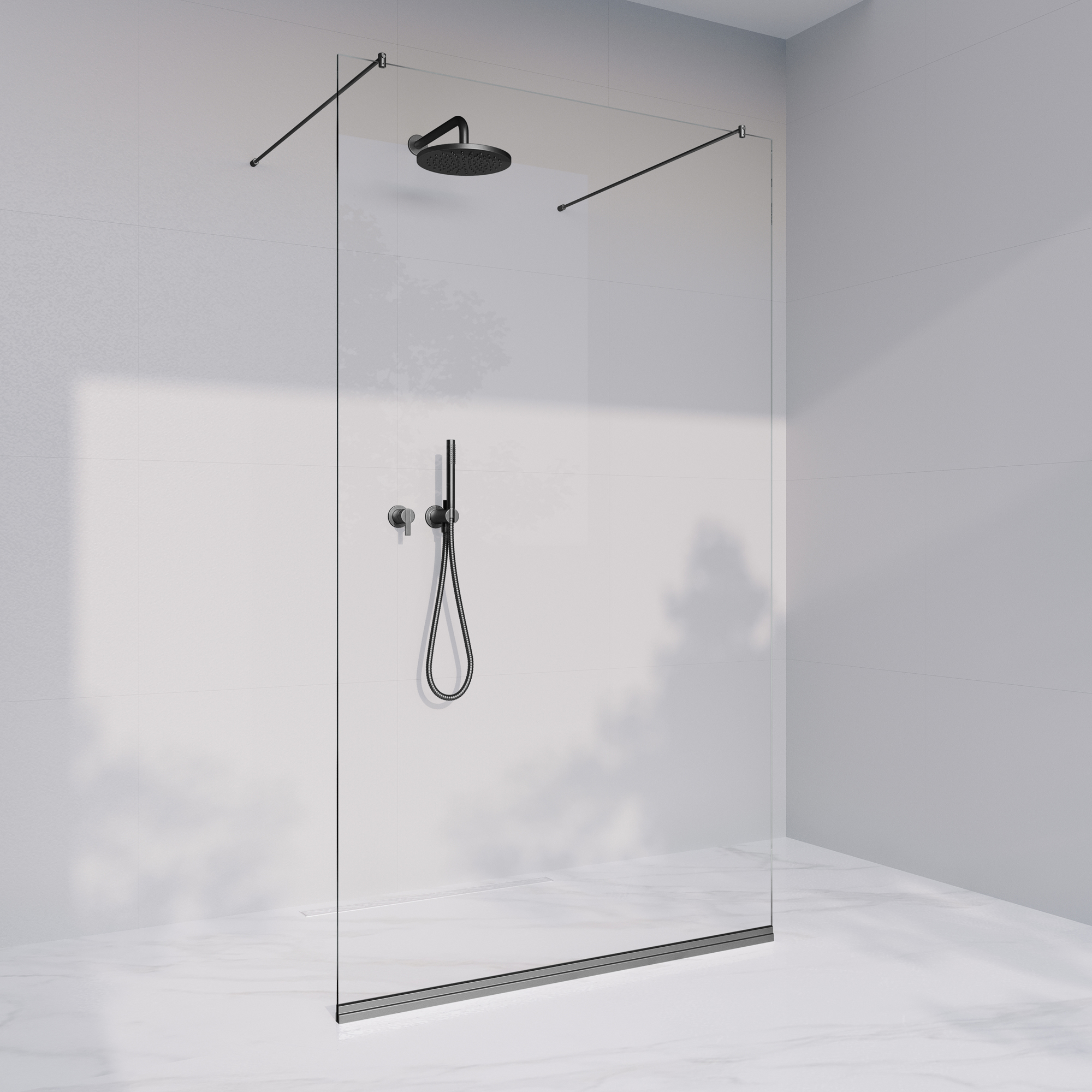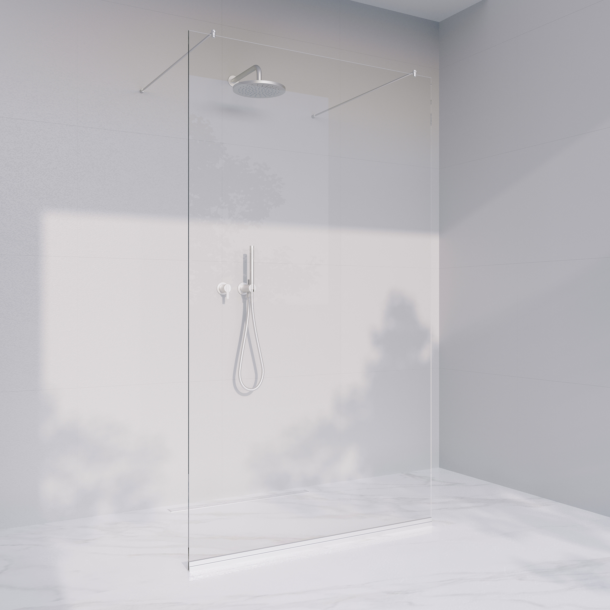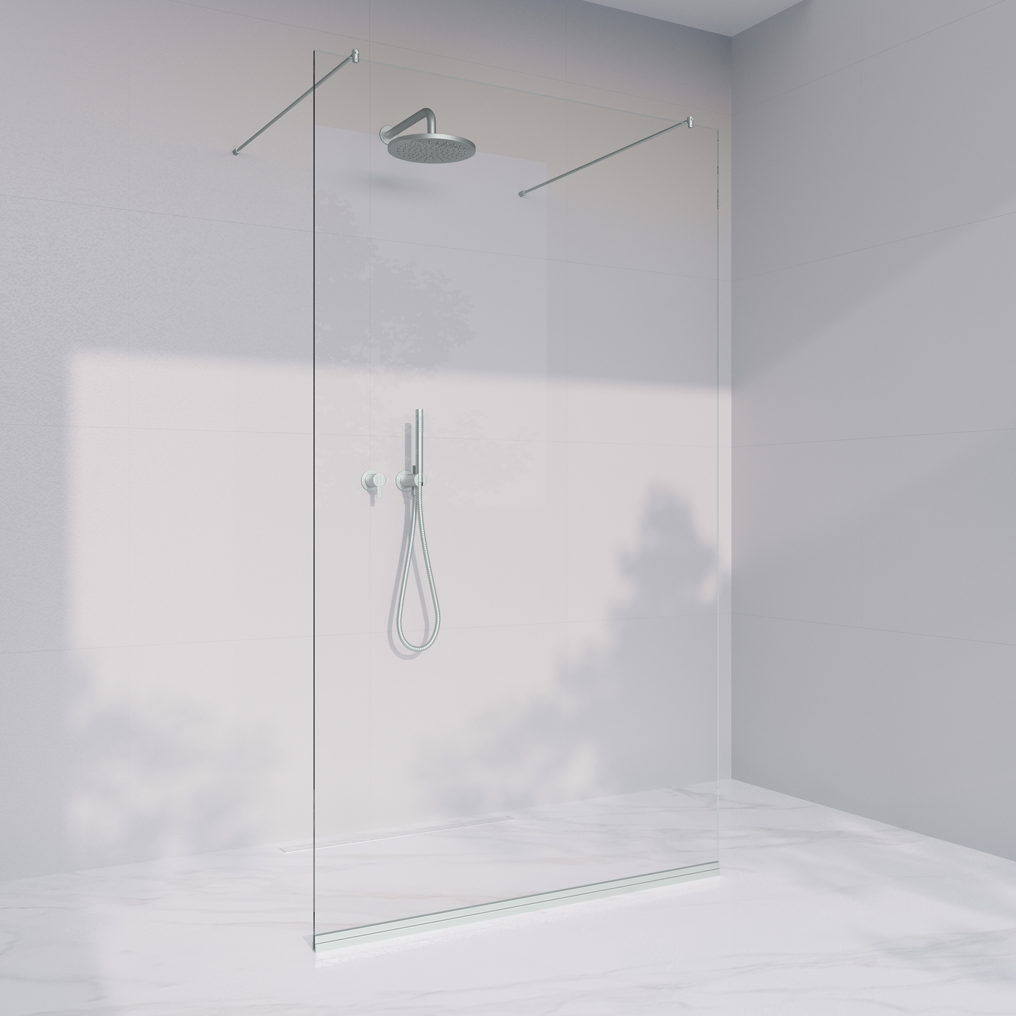 - Walk-in dusch med fast glasvägg.