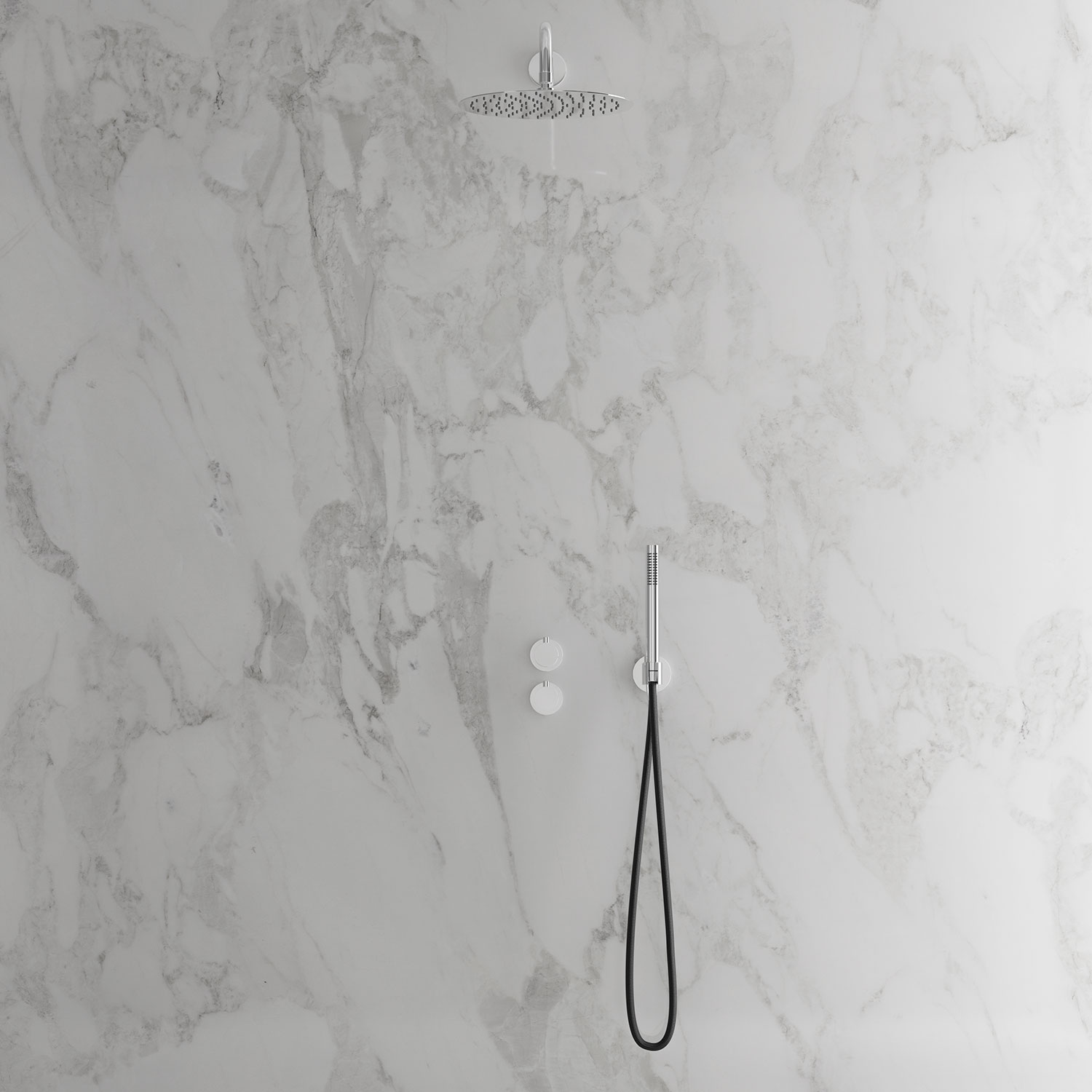 Dold montering bakom vägg ger badrummet ett minimalistiskt och harmoniskt intryck. Inkluderar en tunn väggmonterad taksil med generös omkrets samt en cylindrisk handdusch som avger ett mjukt behagligt vattenflöde med bred spridning. Tidlös design som samspelar med ett skandinaviskt formspråk.