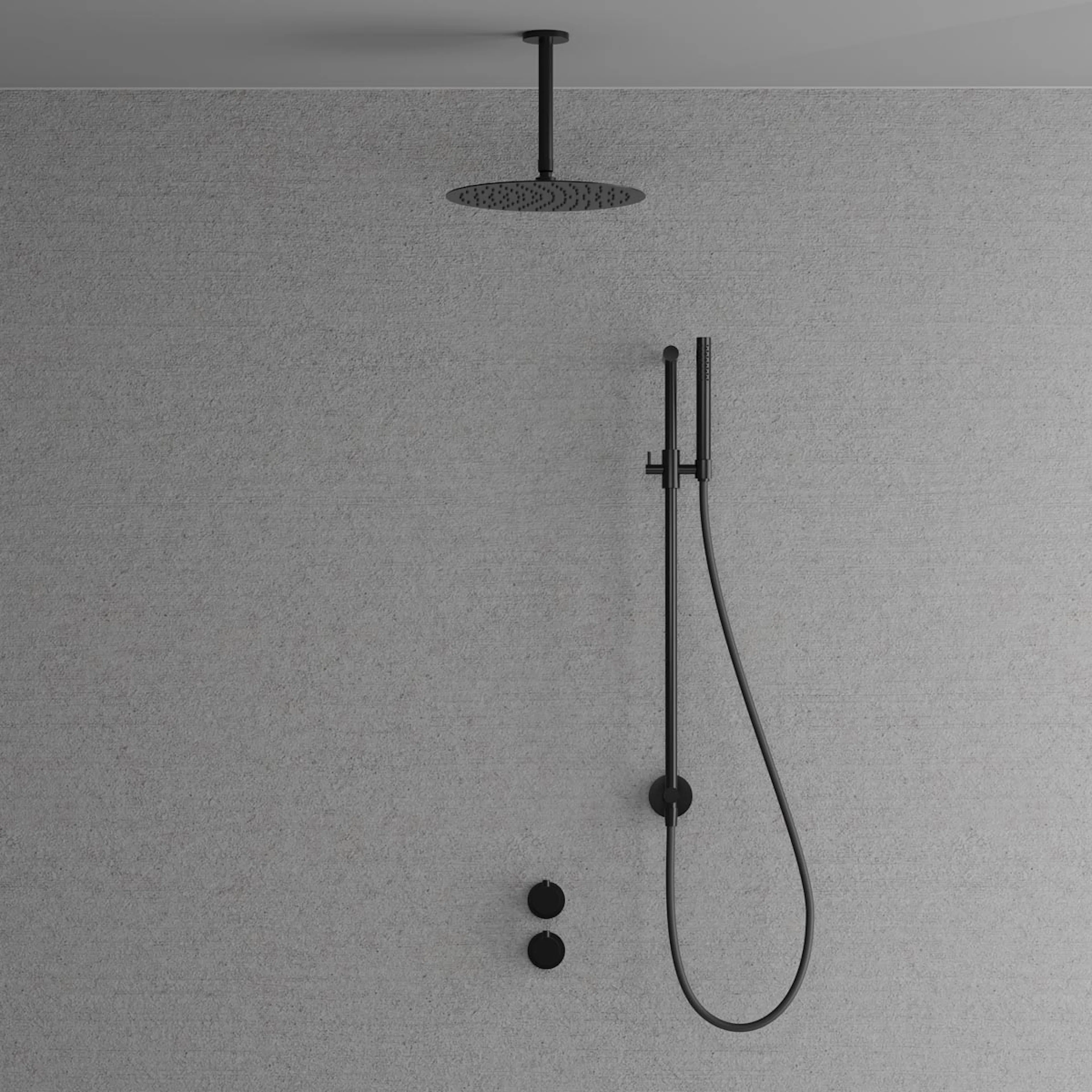 Dold montering bakom vägg ger badrummet ett minimalistiskt och harmoniskt intryck. Inkluderar en tunn takmonterad taksil med generös omkrets, en duschstång med reglerbart handduschfäste samt en cylindrisk handdusch som avger ett mjukt behagligt vattenflöde med bred spridning. Tidlös design som samspelar med ett skandinaviskt formspråk.