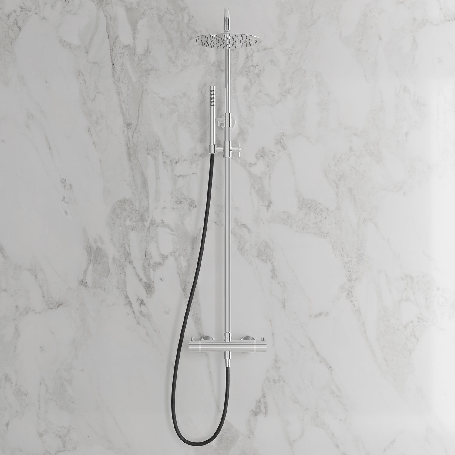 Takduschset Scandtap Steel Pleasure 2 är ett stilrent duschset med minimalistisk design. Detta duschset levereras med en termostatblandare (150 cc) med integrerad omkastare, en stor och tunn takdusch (Ø250 mm), en handdusch, en duschslang (1,5 m) med anti-twistfunktion samt en justerbar duschstång (970-1360 mm) med ett justerbart övre väggfäste (70-129 mm från väggen).