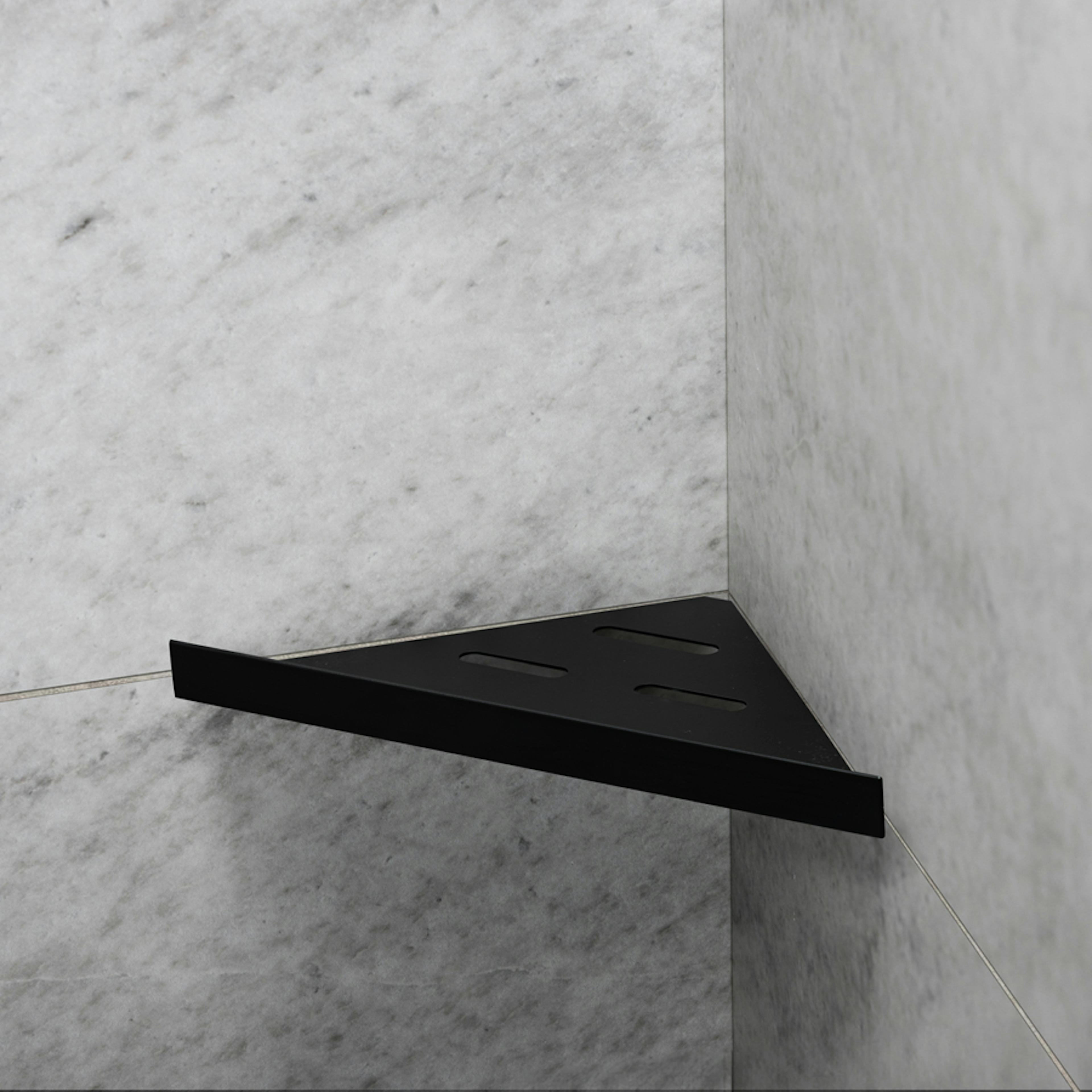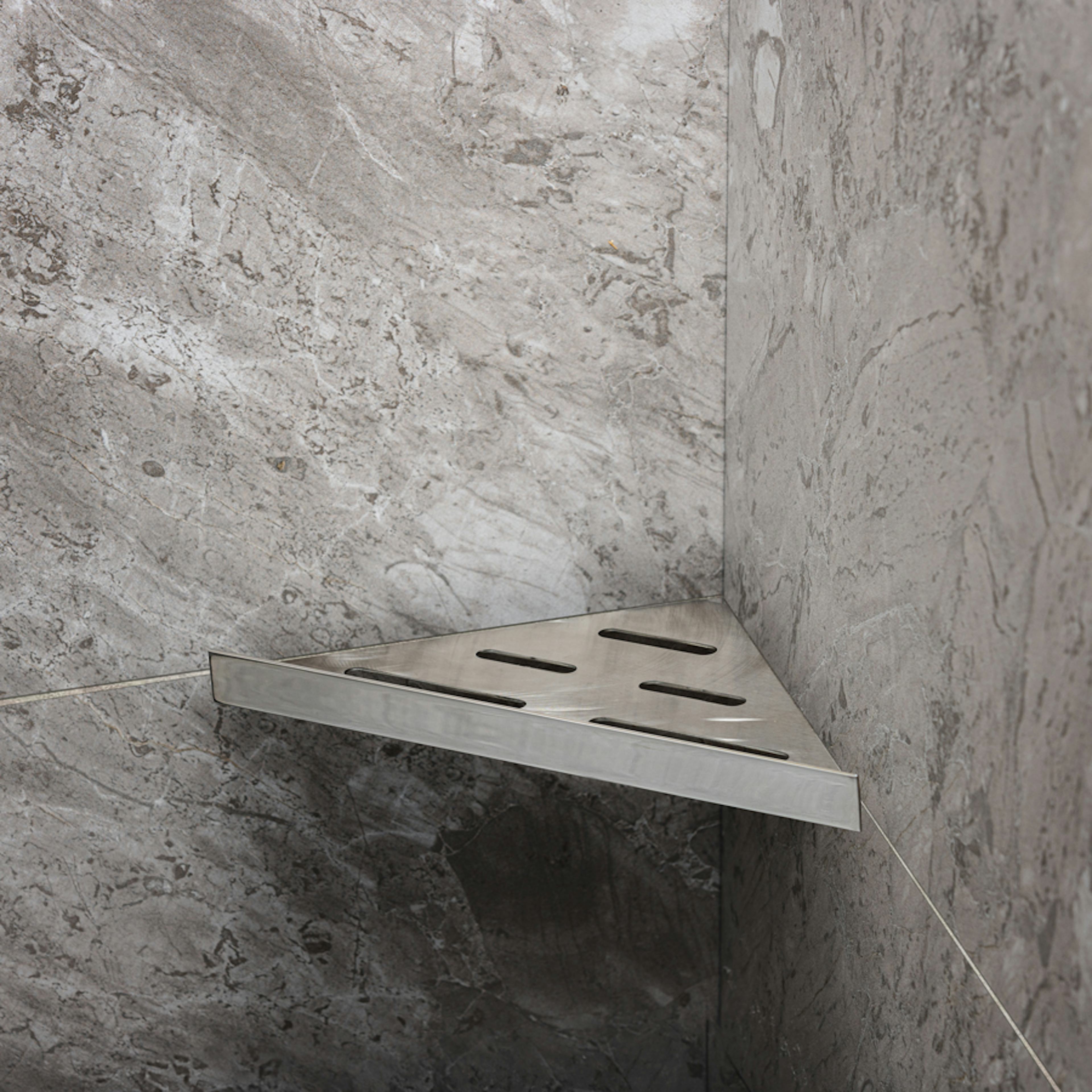 Elegant duschhylla för montering med keramiska plattor i hyllan. Hyllan fästs i fogen med silikon. Passar i 90° hörn. Tillverkad i stål typ AISI 304. Godstjocklek: 1,2 mm. Ej syrafast.