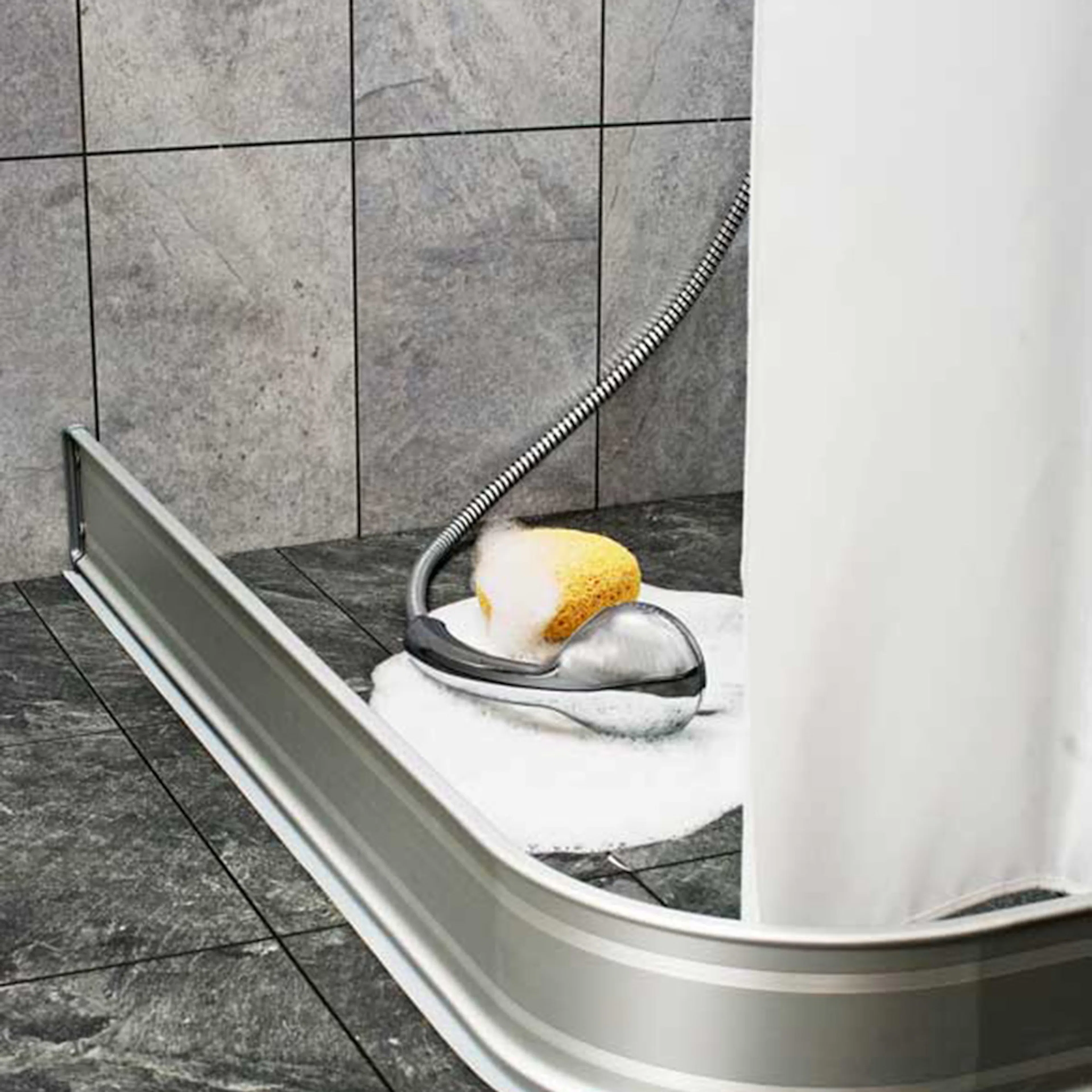 Handy duschsarg "dusch och vänd" är lika enkel som genial. Duschsargen är tillverkad av aluminiumprofil som ligger löst mot golvet och håller vattnet på plats när man duschar. Efteråt läggs duschsargen mot väggen där den inte är i vägen. Sargen är utrustad med gummilist för effektiv tätning. Duschsargen finns i vitlackad eller naturanodiserad aluminium. (Duschsargen kan också kallas duschkant,duschsockel eller duschlist). Duschsargen finns i flera olika modeller, vinklad, u-formad och rak. Den raka modellen finns med liten kantvinkel som står själv eller helt rak profil som används tillsammans med väggfäste. Profilhöjd 100mm.