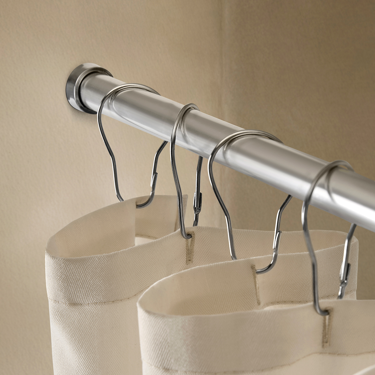 Fjäderstång med teleskopfunktion, vilket gör den lämplig för de flesta badrum. Den finns i flera storlekar. Stången finns i vitt och krom, så den smälter diskret in i din inredning. Den monteras enkelt och utan verktyg genom att trycka ihop den inre fjädern och placera stången i spänning mellan väggarna.